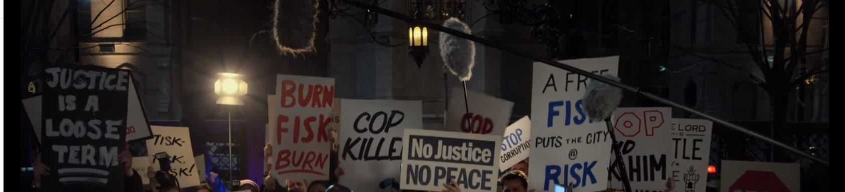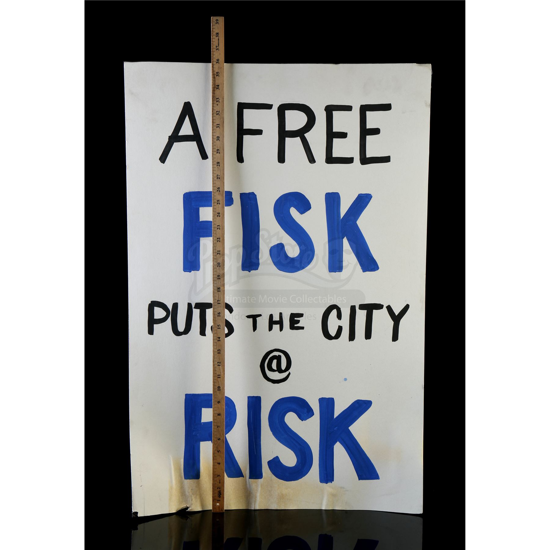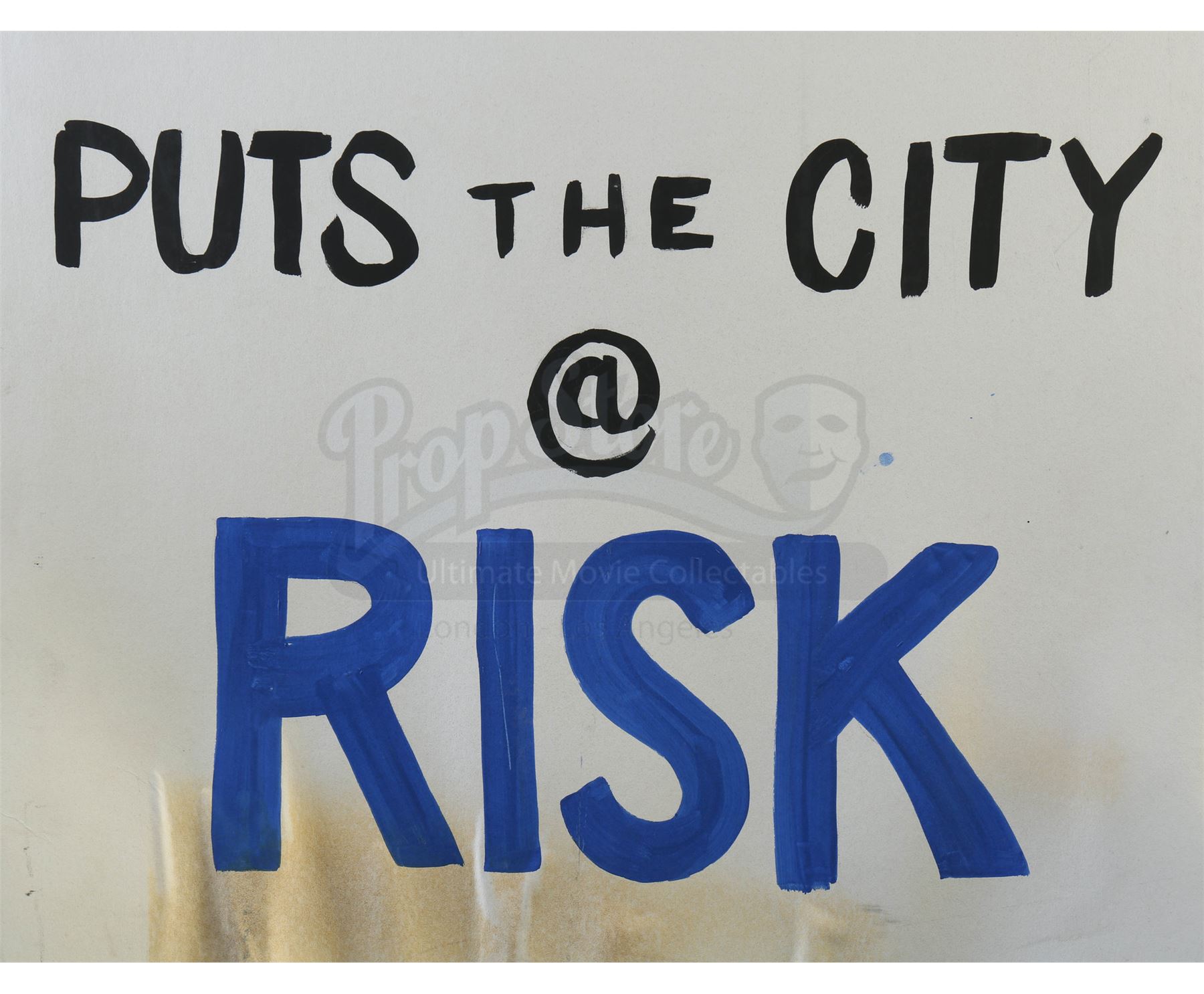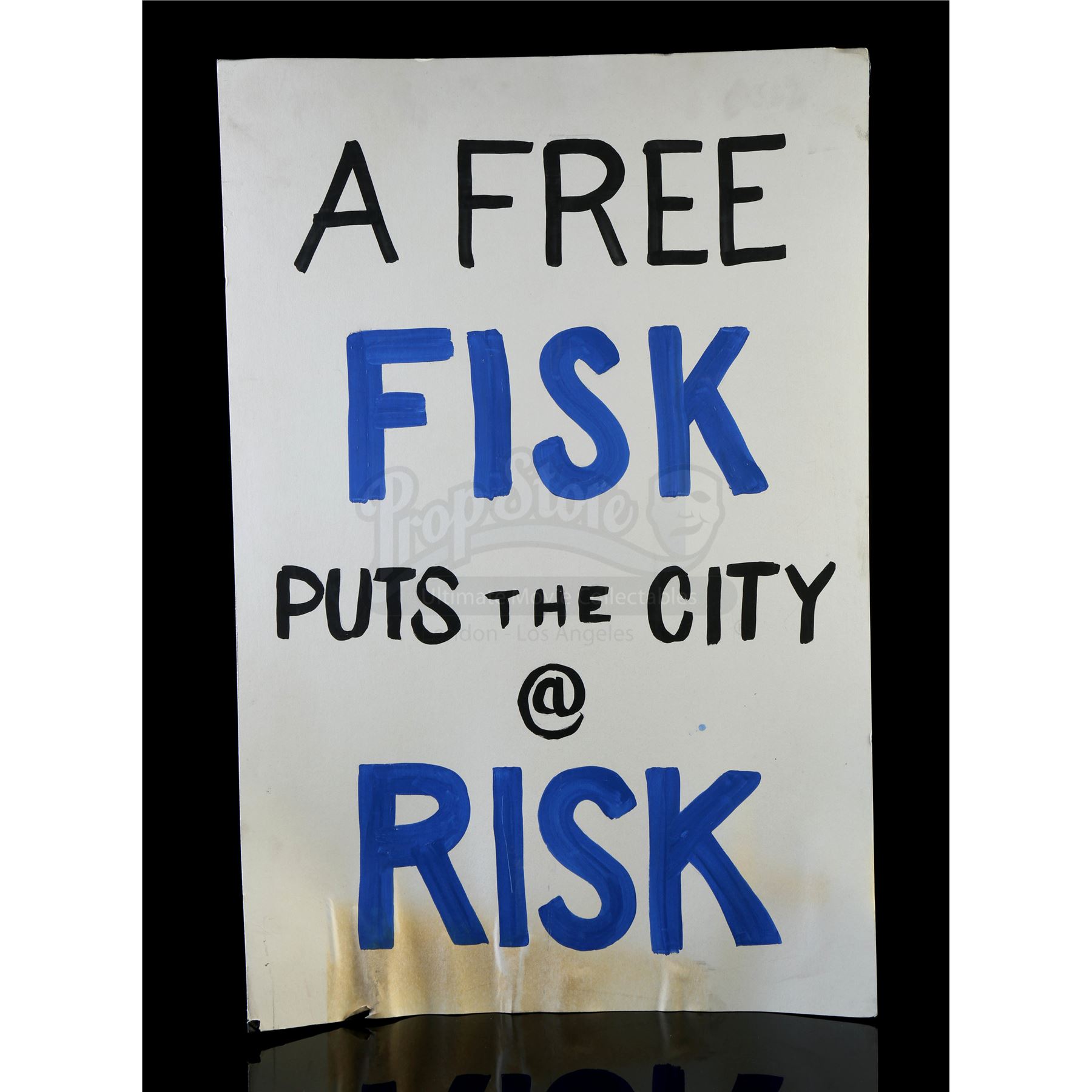 ‘City at Risk’ Fisk release protest signs from the episode ‘Reunion’ (311) of Marvel's Daredevil. In the episode, citizens bring signs to protest the overturning of Wilson Fisk’s conviction. This lot consists of two protest signs on cardstock paper. They are in fair overall condition with signs of wear from production, including some scuffs and staining on the bottom sections.