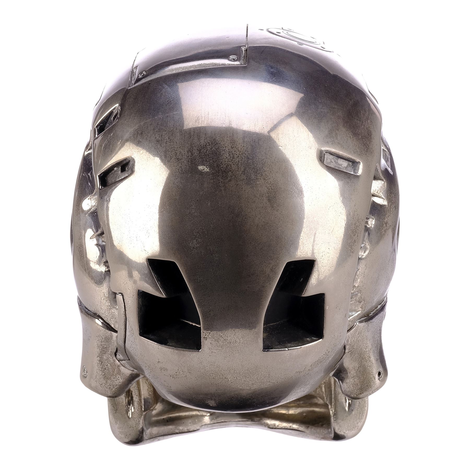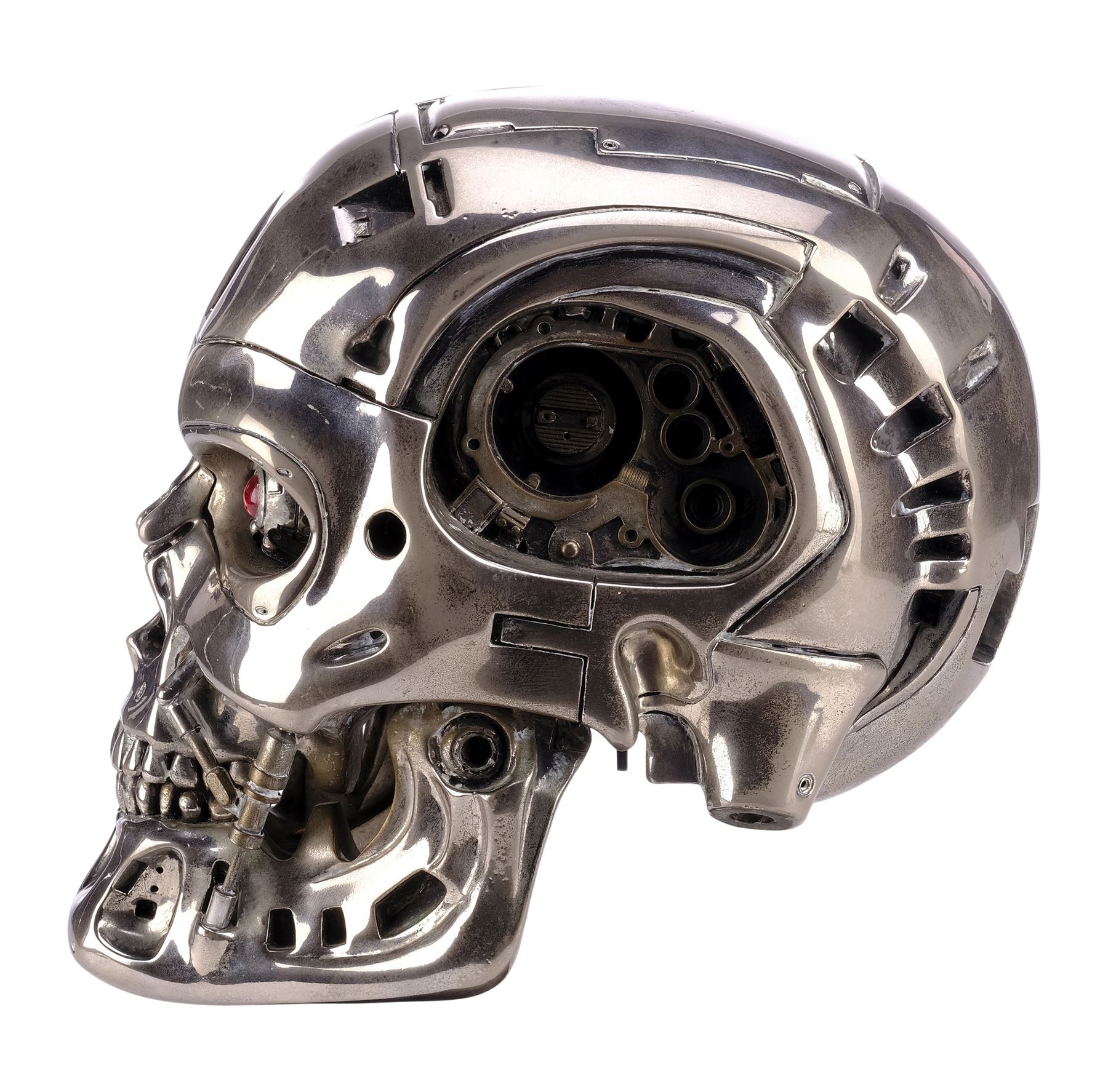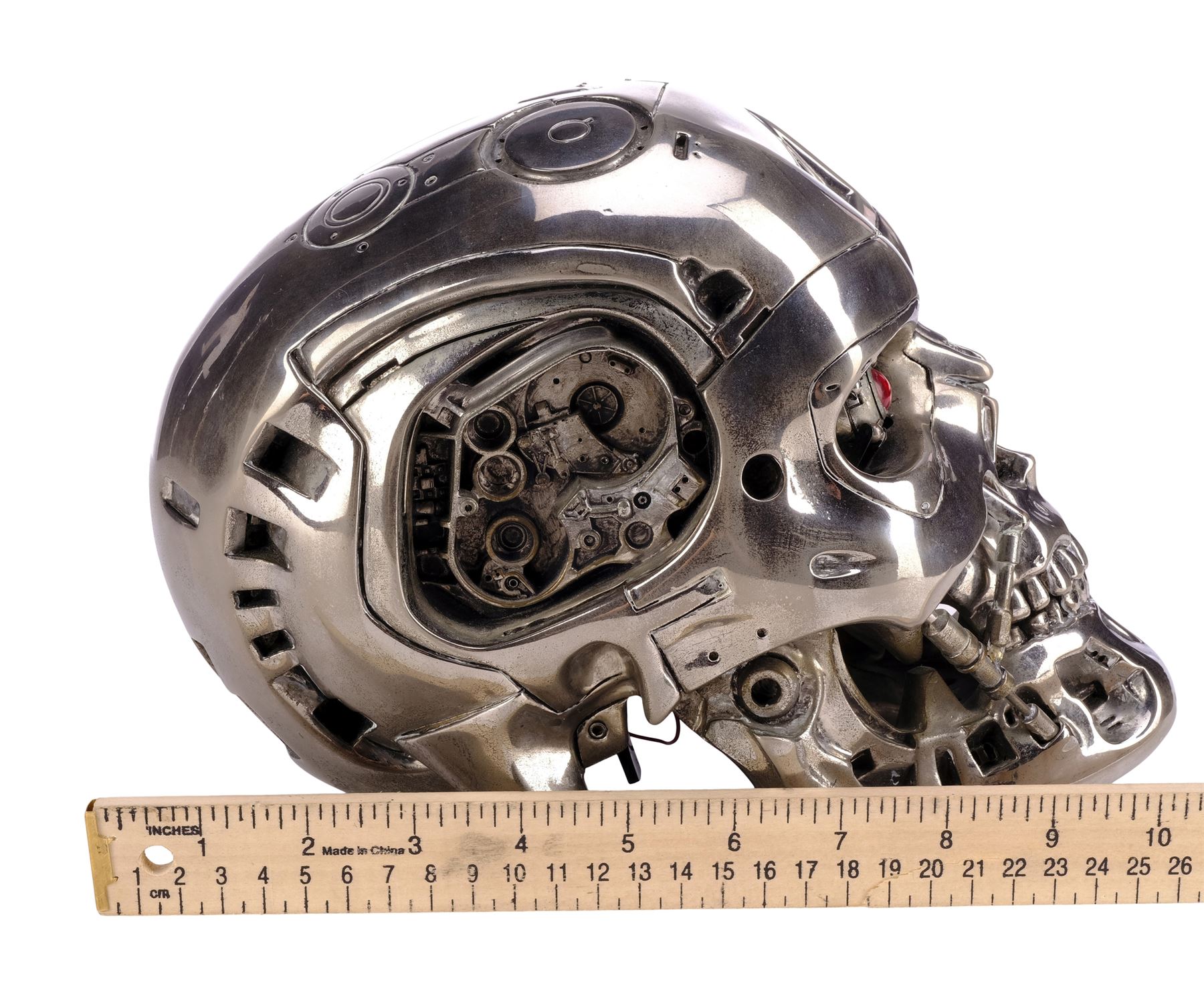 This chrome-plated, two-piece, hollow resin skull is painted silver-colour on the underside. It is inset with two red eyes designed to illuminate via a black toggle switch beneath the skull. The interior is filled loosely with red and black wires and a battery pack. Also included is a black resin stand base affixed with a metal plaque engraved "This Endoskull Has Been Specially Built for Stan Winston." The skull exhibits discolouration on its underside and the base exhibits flaking paint, exposing the resin. Dimensions: 25.5 cm x 15.25 cm x 23 cm (10" x 6" x 9")