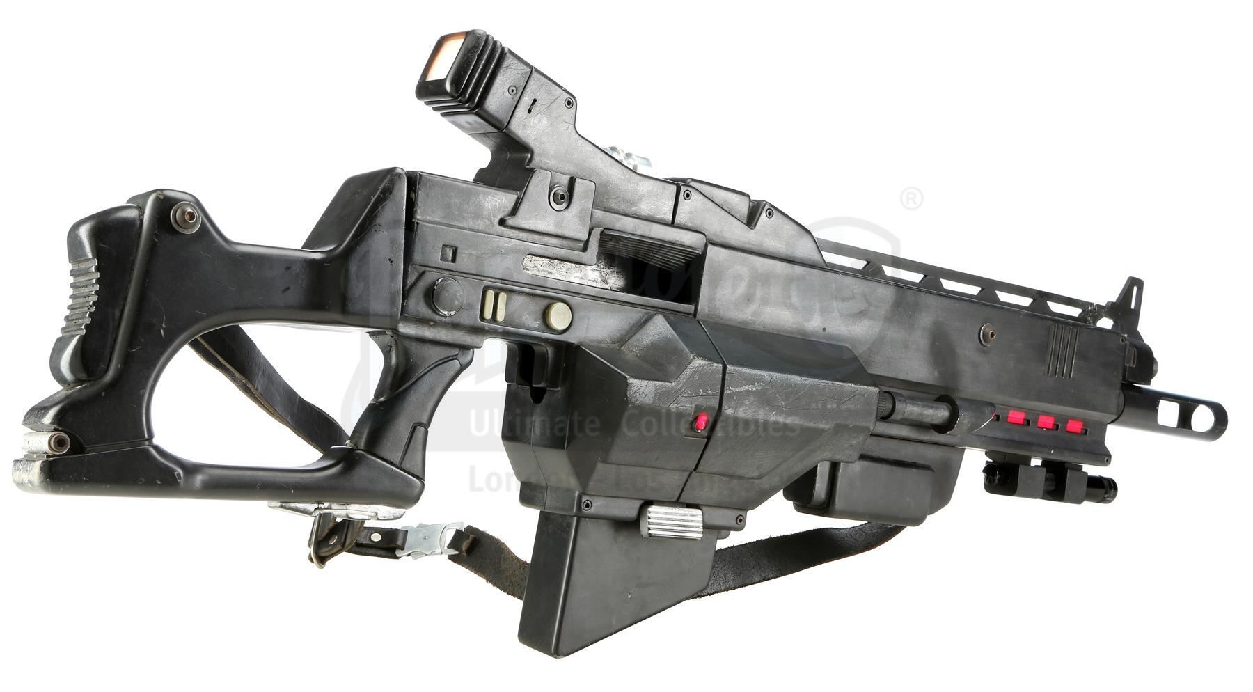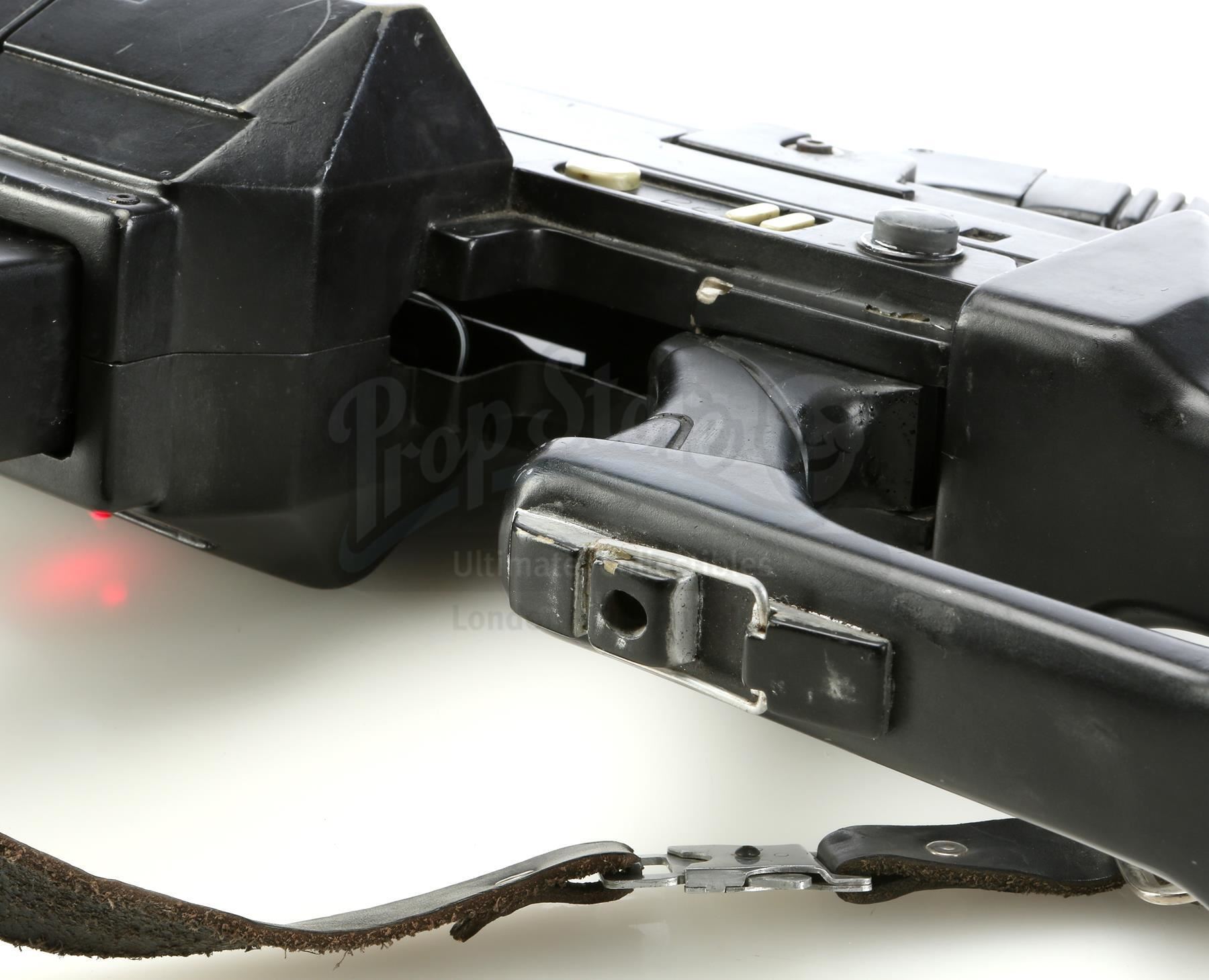 A light-up Judge Hunter rifle from Danny Cannon's comic book adaptation Judge Dredd. When Judge Dredd (Sylvester Stallone) was framed for murder, Judge Hunters wielded their futuristic standard-issue rifles and were sent to bring him to justice.