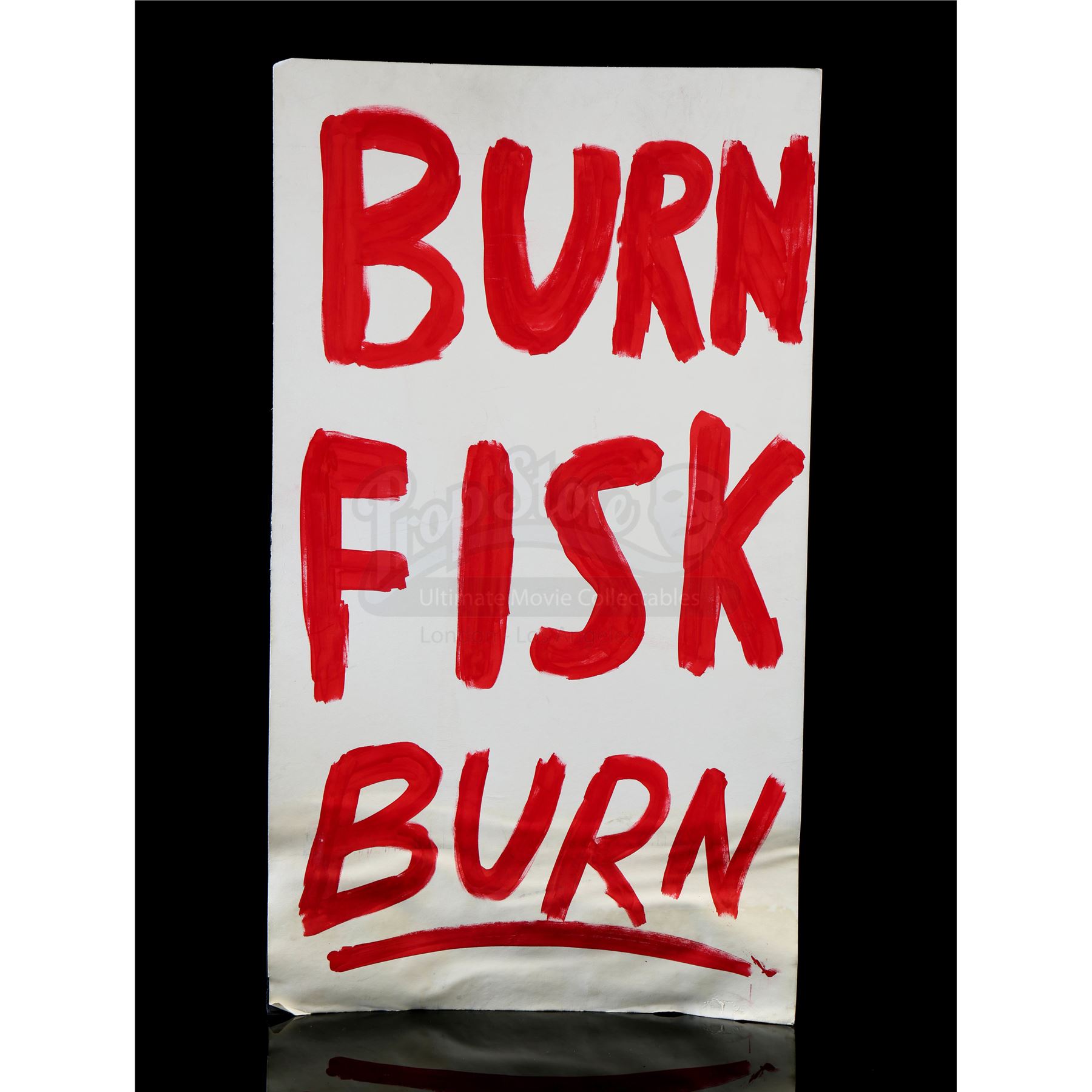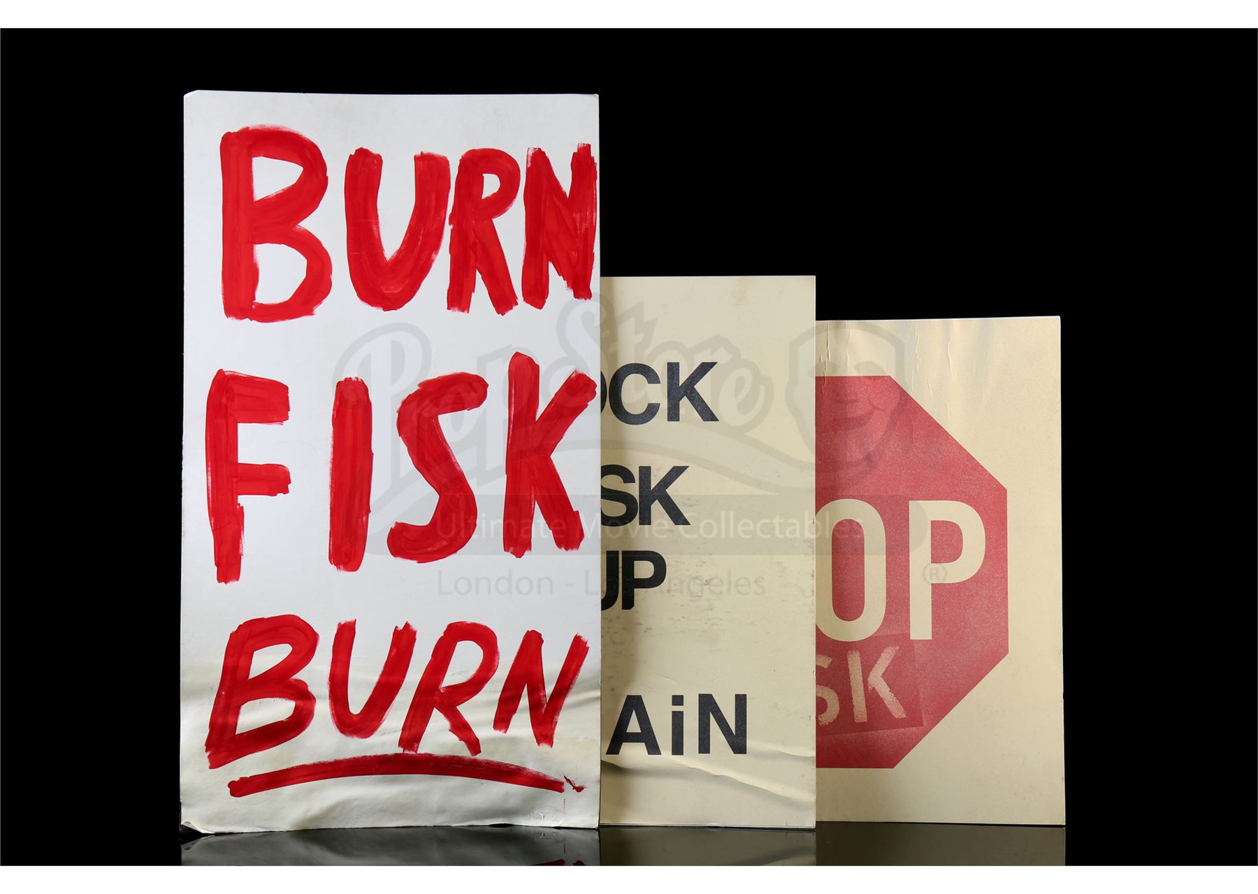 Three assorted Fisk release protest signs from the episode ‘Reunion’ (311) of Marvel's Daredevil. In the episode, citizens bring signs to protest the overturning of Wilson Fisk’s conviction. This lot consists of three protest signs mounted on poster board. They are in fair overall condition with signs of wear from production, including some scuffs and staining.