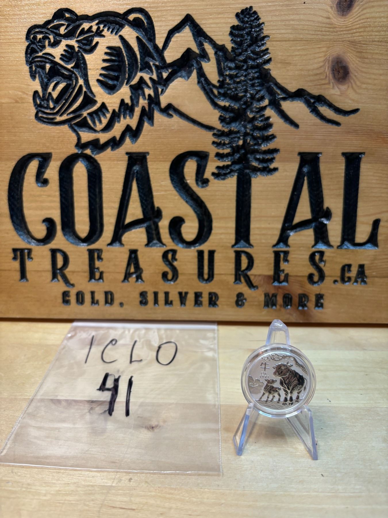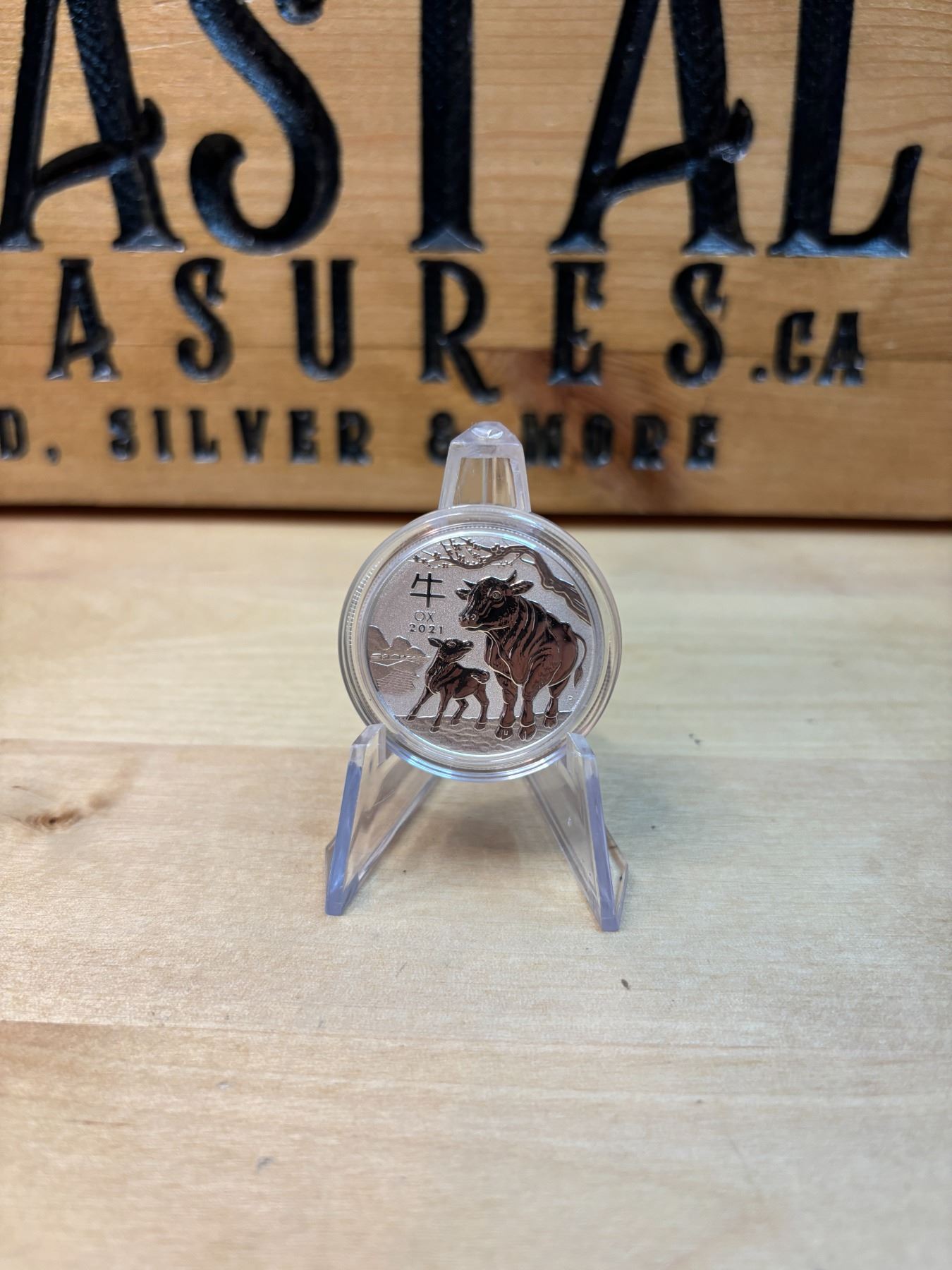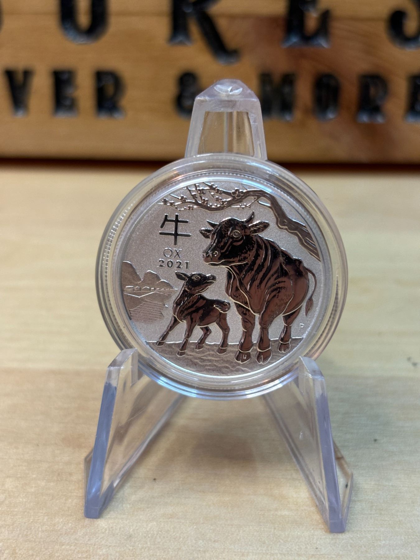 The 1/2 oz Australian Year of the Ox silver coin is part of the Perth Mint's Lunar Series, which celebrates the Chinese zodiac. Issued in 2021, the coin features the ox, symbolizing hard work, strength, and determination in Chinese culture. Made from 99.99% pure silver, this coin is a limited edition with a weight of 1/2 troy ounce. The design typically shows an ox in a traditional, detailed style, with a backdrop of Chinese motifs such as clouds or mountains. The reverse also includes the Perth Mint's "P" mintmark, along with the coin's weight and purity. As both a collectible and investment piece, its value is influenced by the silver market, but the coin's limited mintage and cultural significance make it particularly desirable for collectors of lunar-themed coins.