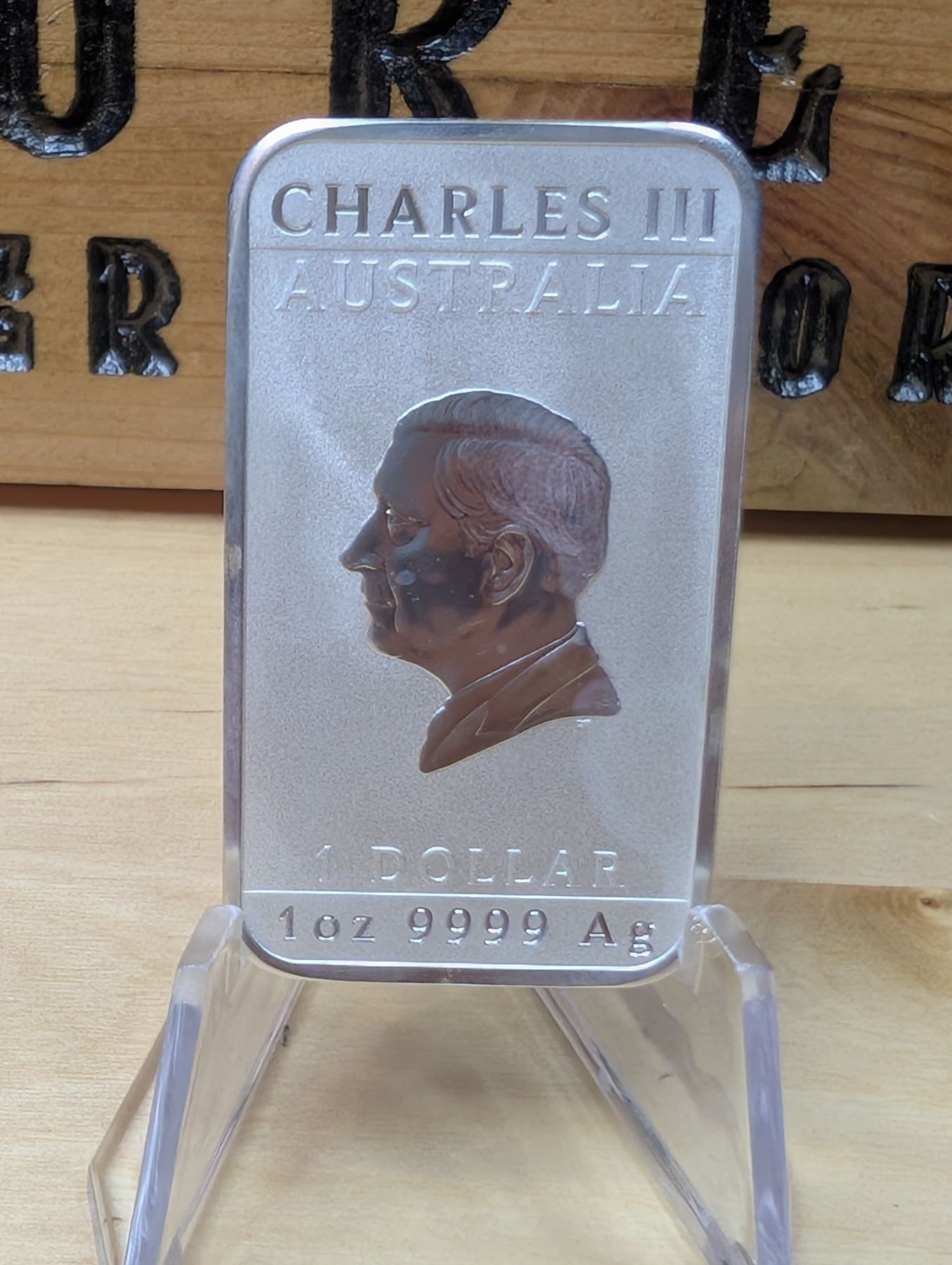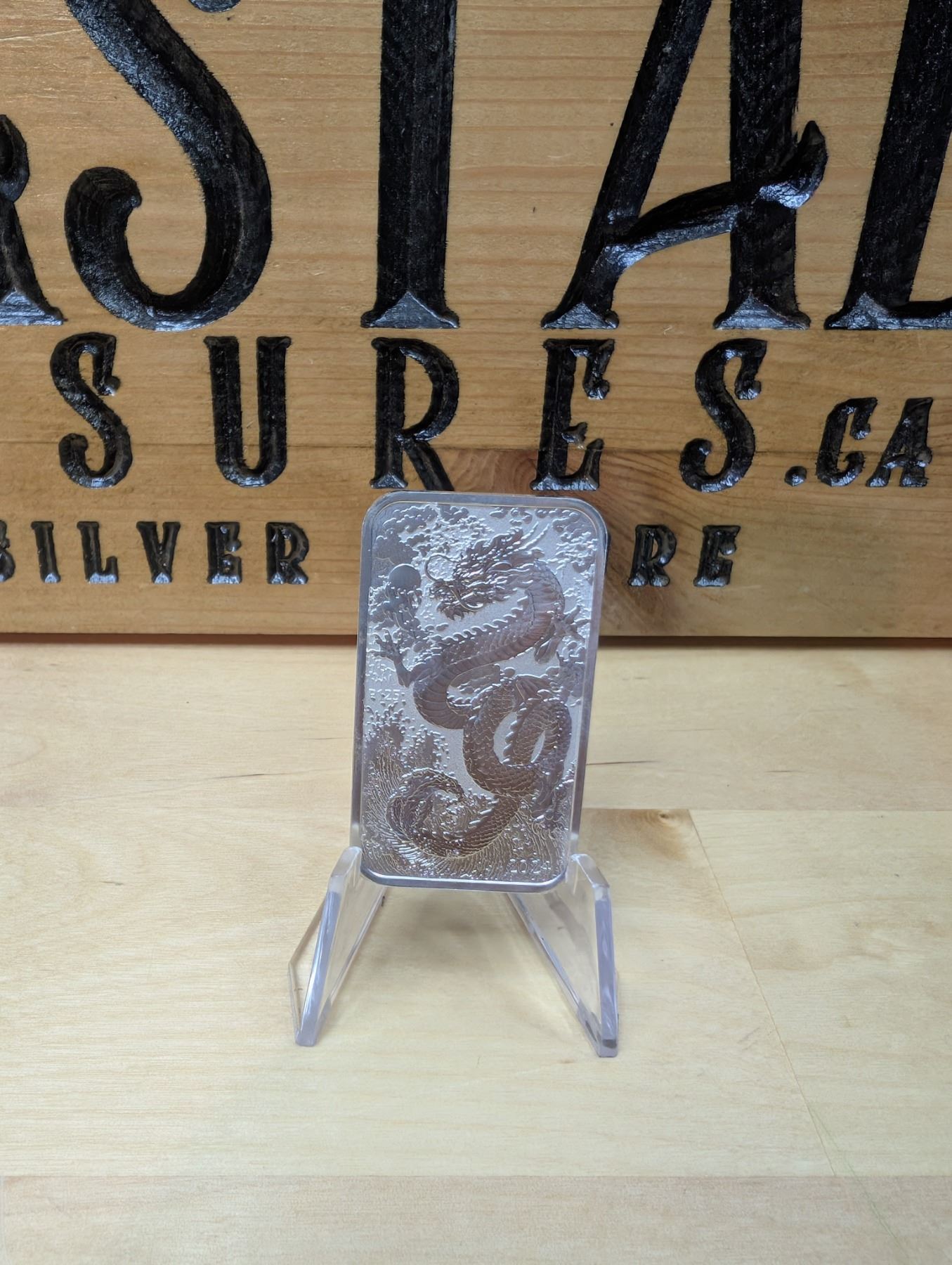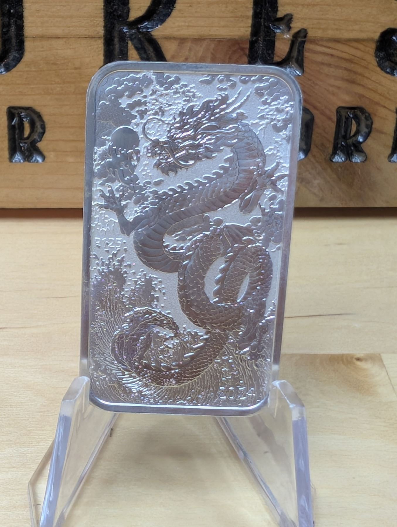 The 1 oz Australian Dragon Rectangle is a silver bar made of 99.9% pure silver, featuring a design inspired by the Chinese zodiac and the Australian Dragon. The rectangular bar usually displays a detailed, artistic rendering of a dragon, a symbol of strength, power, and good fortune in Chinese culture. Produced by the Perth Mint, it is part of the Australian Lunar Series, which celebrates the Chinese zodiac animals. This bar is popular among collectors and investors due to its unique design and high silver purity.