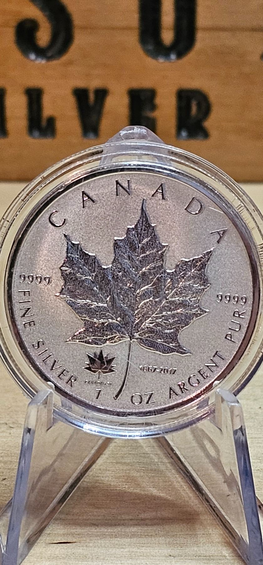 The 2017 1 oz Canadian Maple Leaf silver coin is a stunning representation of Canada’s national symbol. Struck from 99.99% pure silver, it features the iconic maple leaf design, known for its intricate detail and beautiful finish. Renowned for its quality and security features, this coin is a favorite among collectors and investors alike. With its timeless appeal and reliable value, it makes a superb addition to any silver collection.