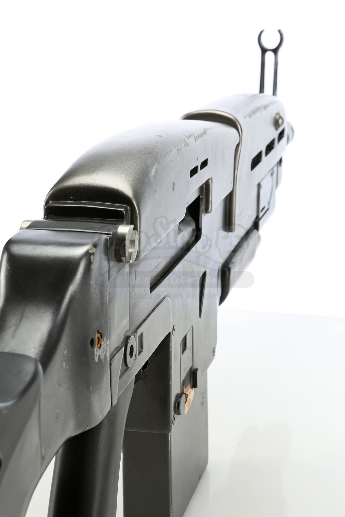 A block war prop rifle from Danny Cannon's Sci-Fi adventure Judge Dedd. Groups of Mega-City One criminals used their various rifles against each other during a "Block war" riot, and eventually turned their guns on Judge Dredd (Sylvester Stallone) when he arrived to restore order.