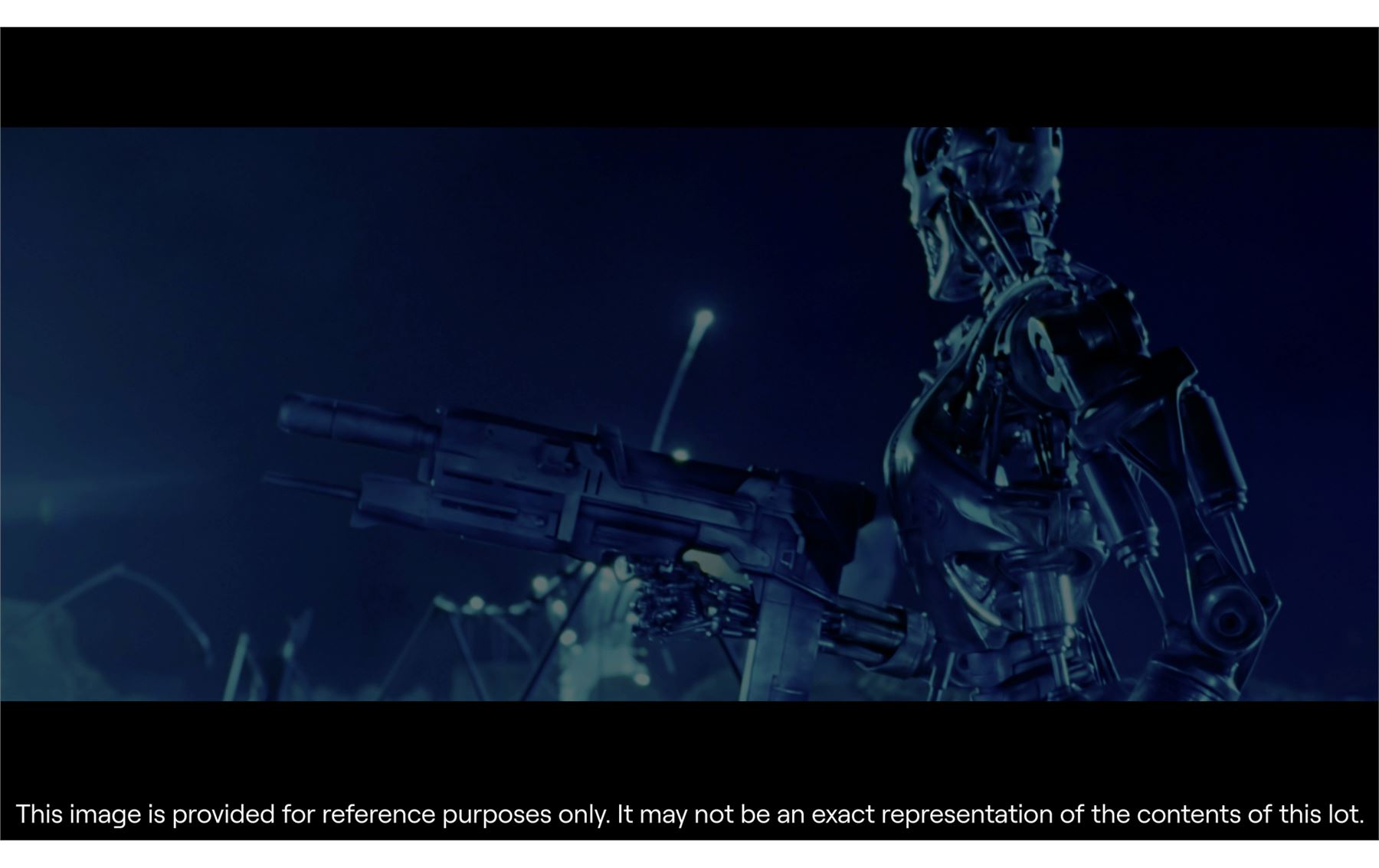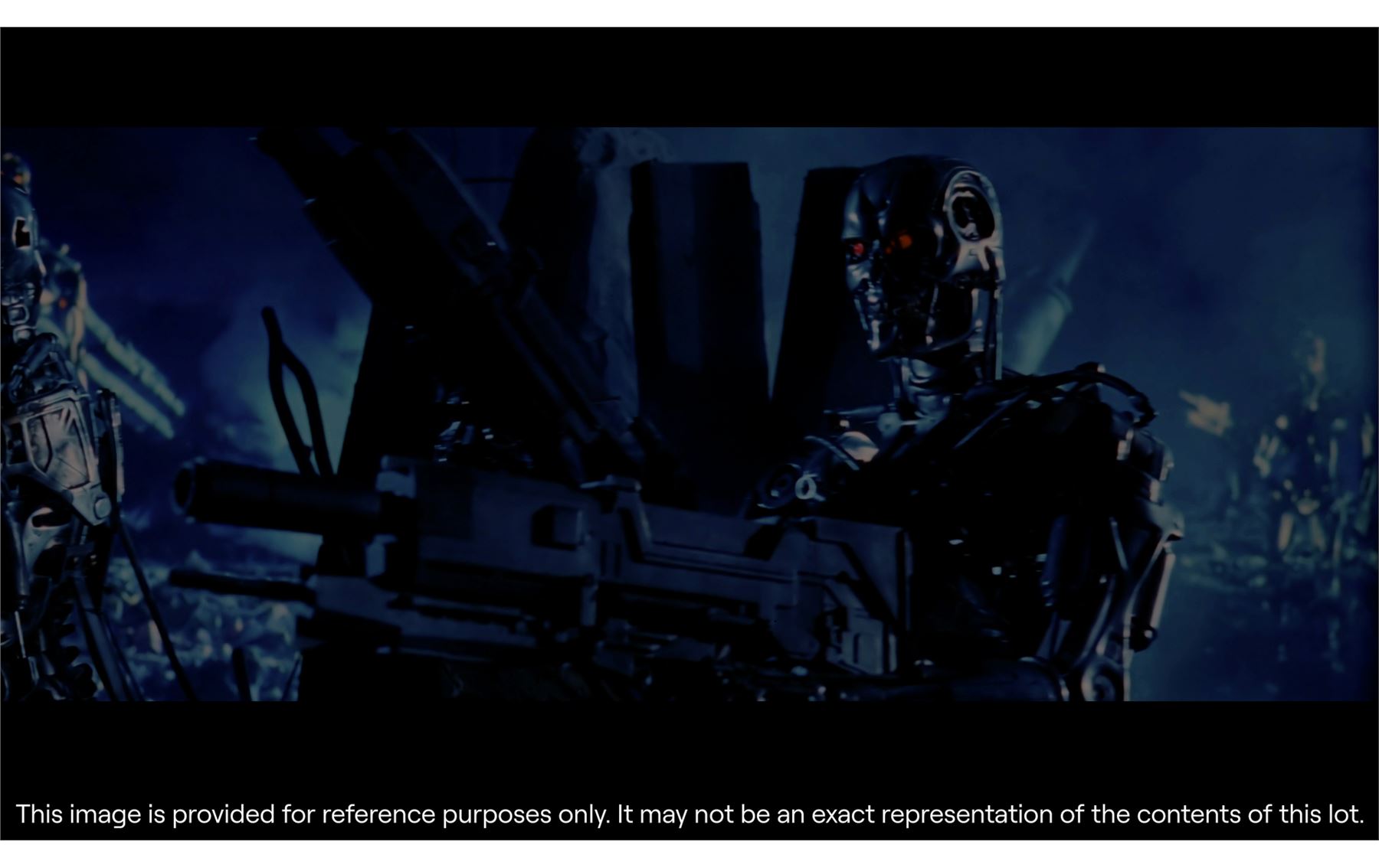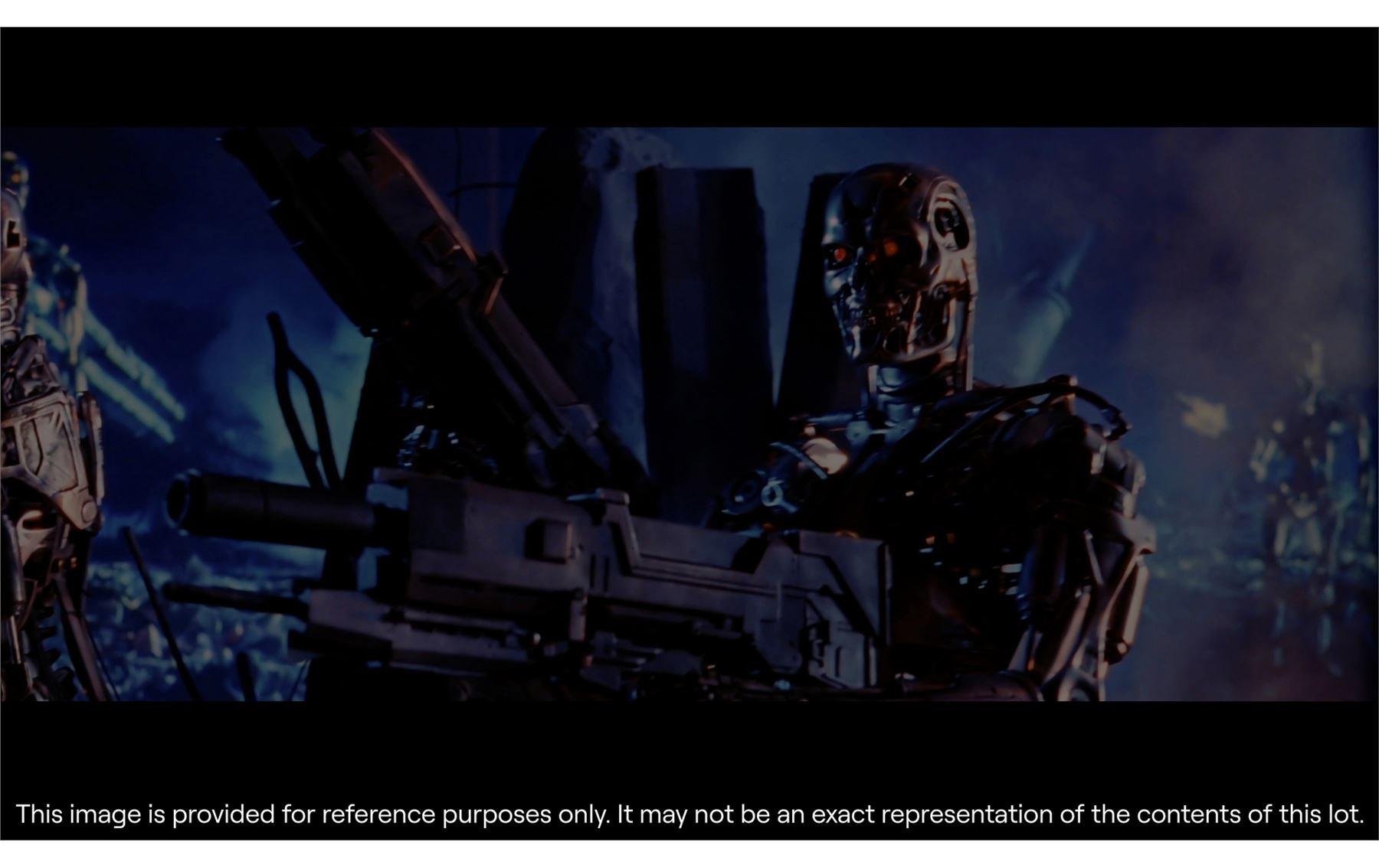 A battle-damaged T-800 backplate from James Cameron's Terminator 2: Judgement Day. In 2029, Skynet's T-800 Terminators worked to exterminate what remained of the human resistance in post-Judgement Day Los Angeles.