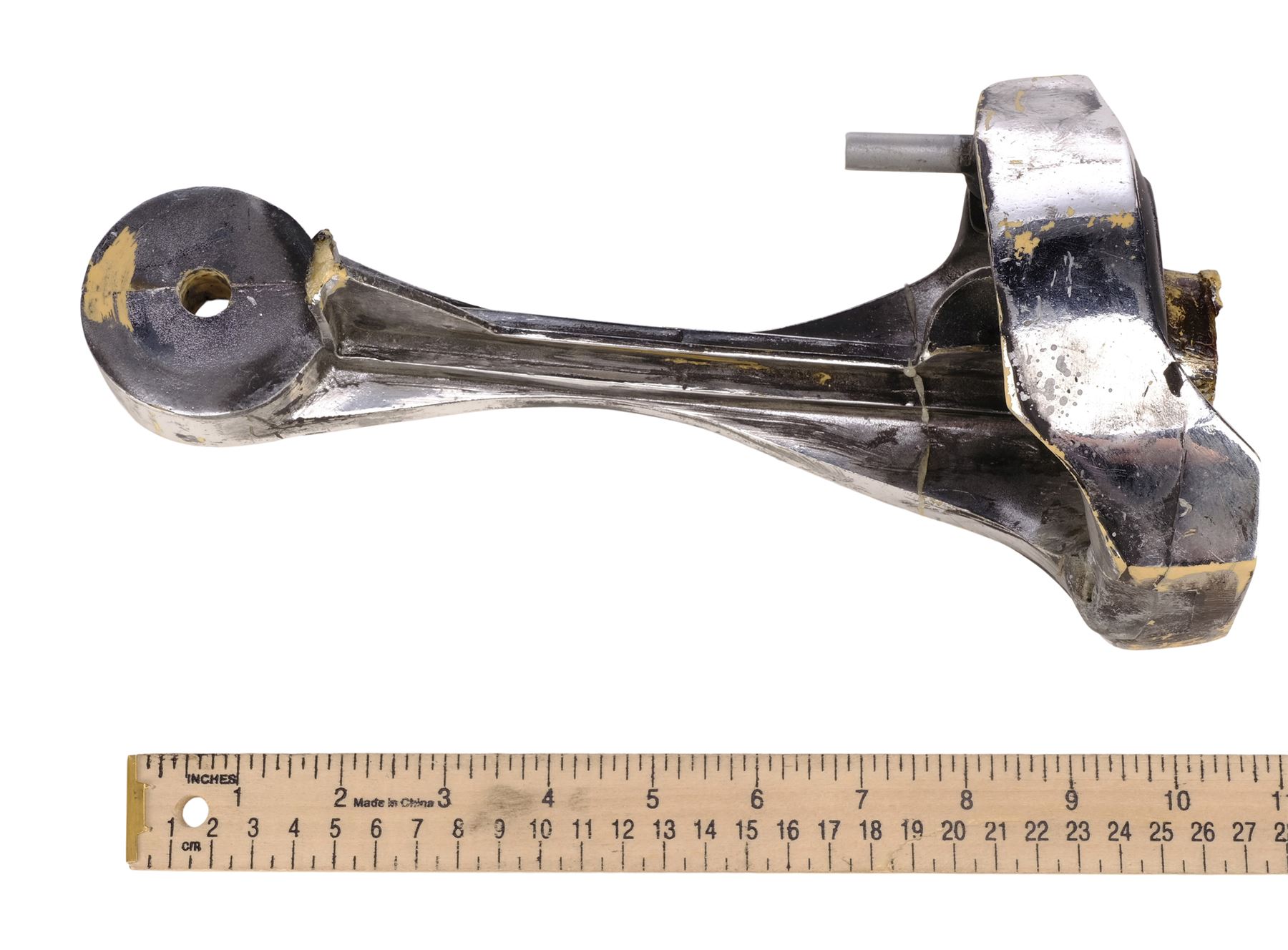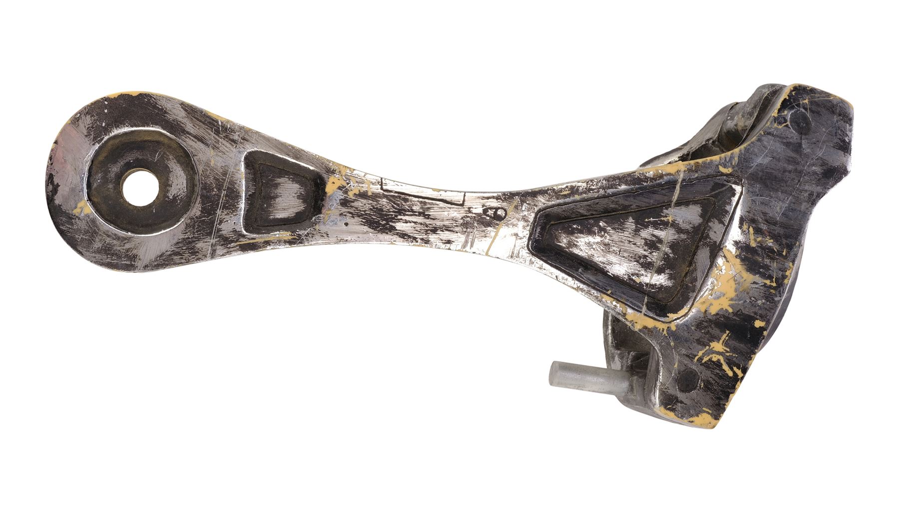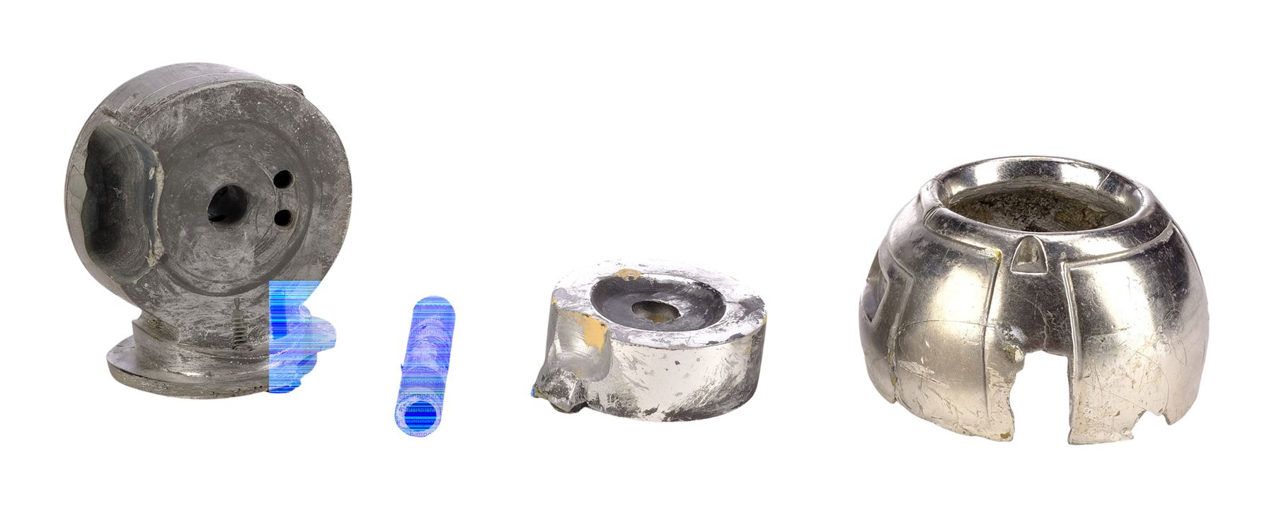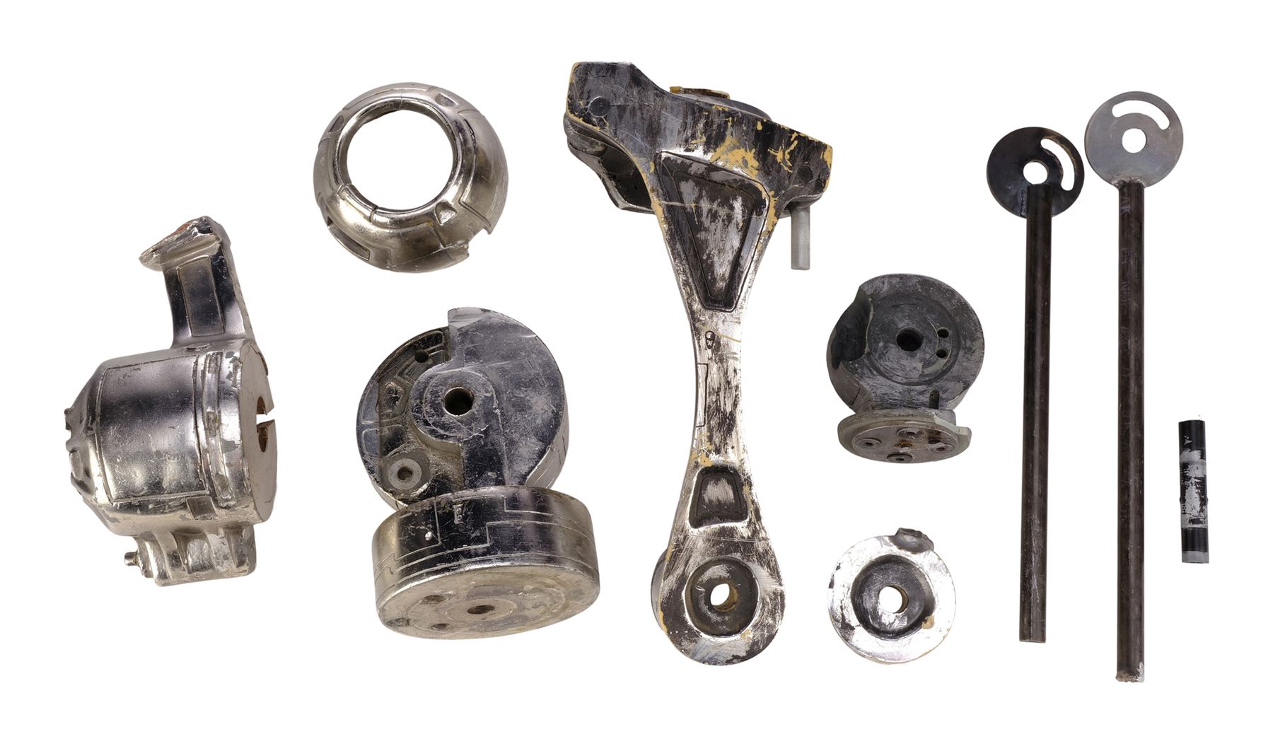 This set consists of a resin endoskeleton upper arm and seven resin components all cast by Stan Winston Studio, painted in matching shades of black and dark grey with metallic finishes, and intentionally distressed by production to appear battle-worn. The set exhibits additional scuffing and wearing away of the finish, chips in the resin, adhesive residue, and a piece of blue tape from production. Dimensions: (largest) 25.5 cm x 15.25 cm x 12.75 cm (10" x 6" x 5")