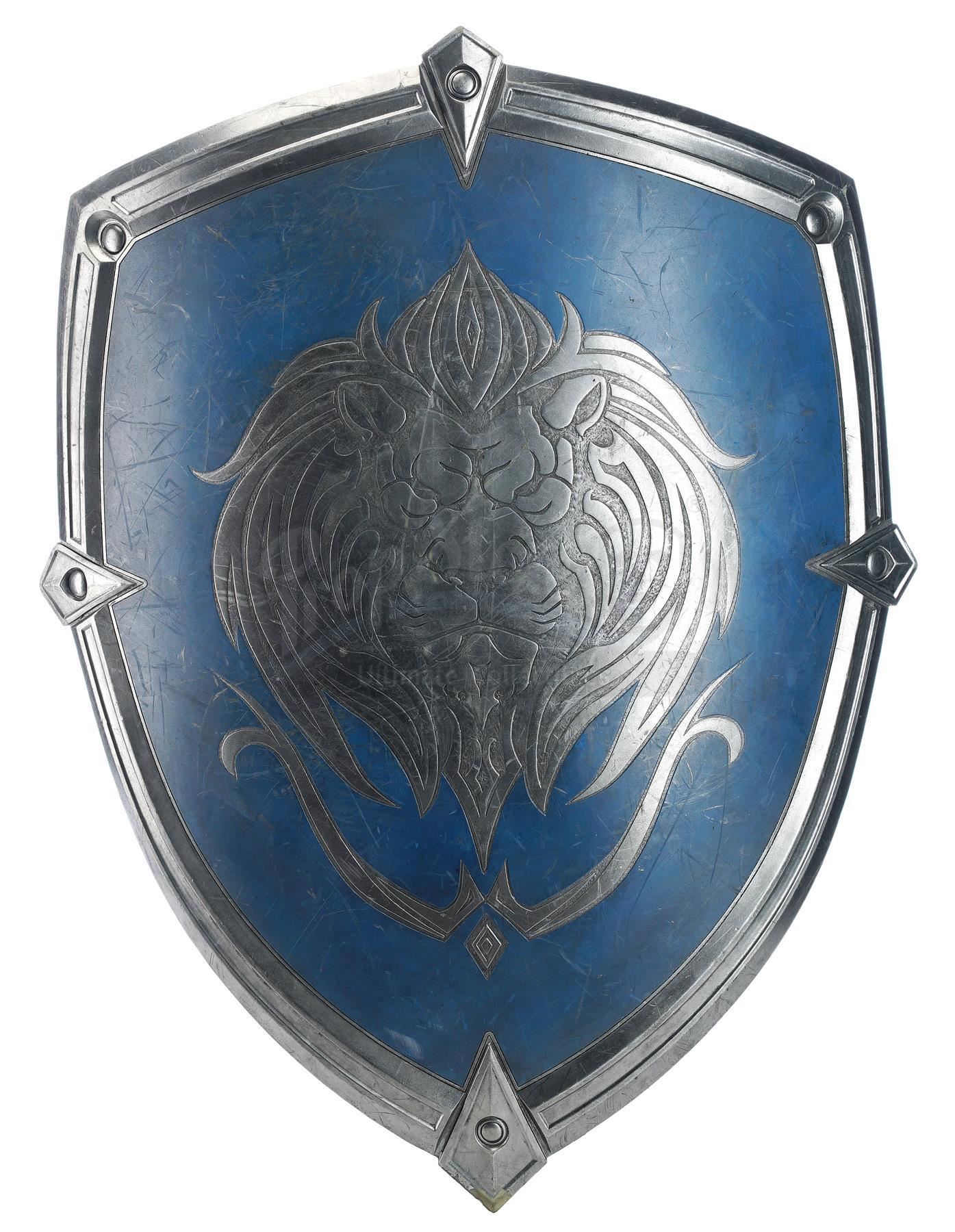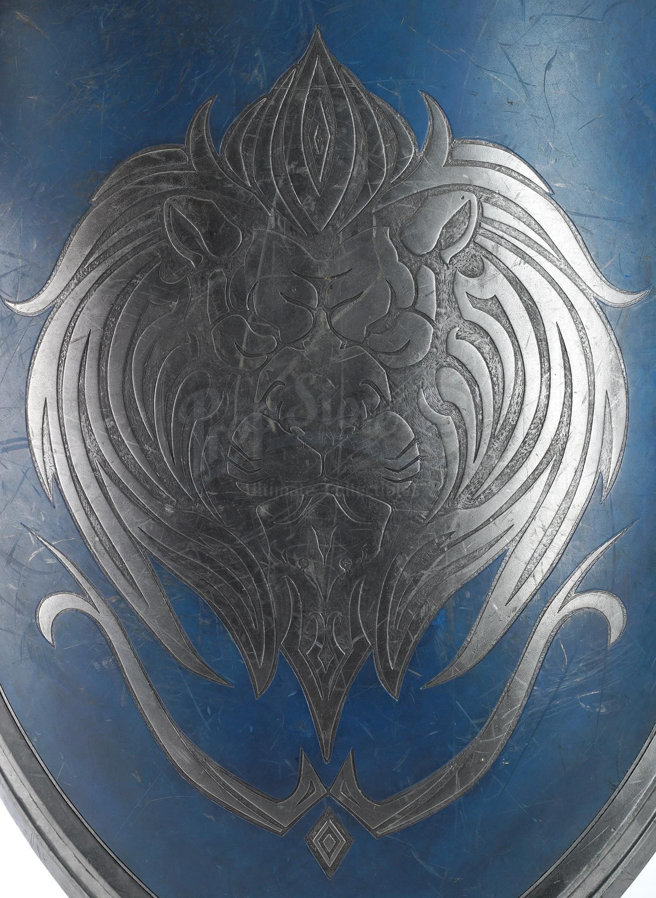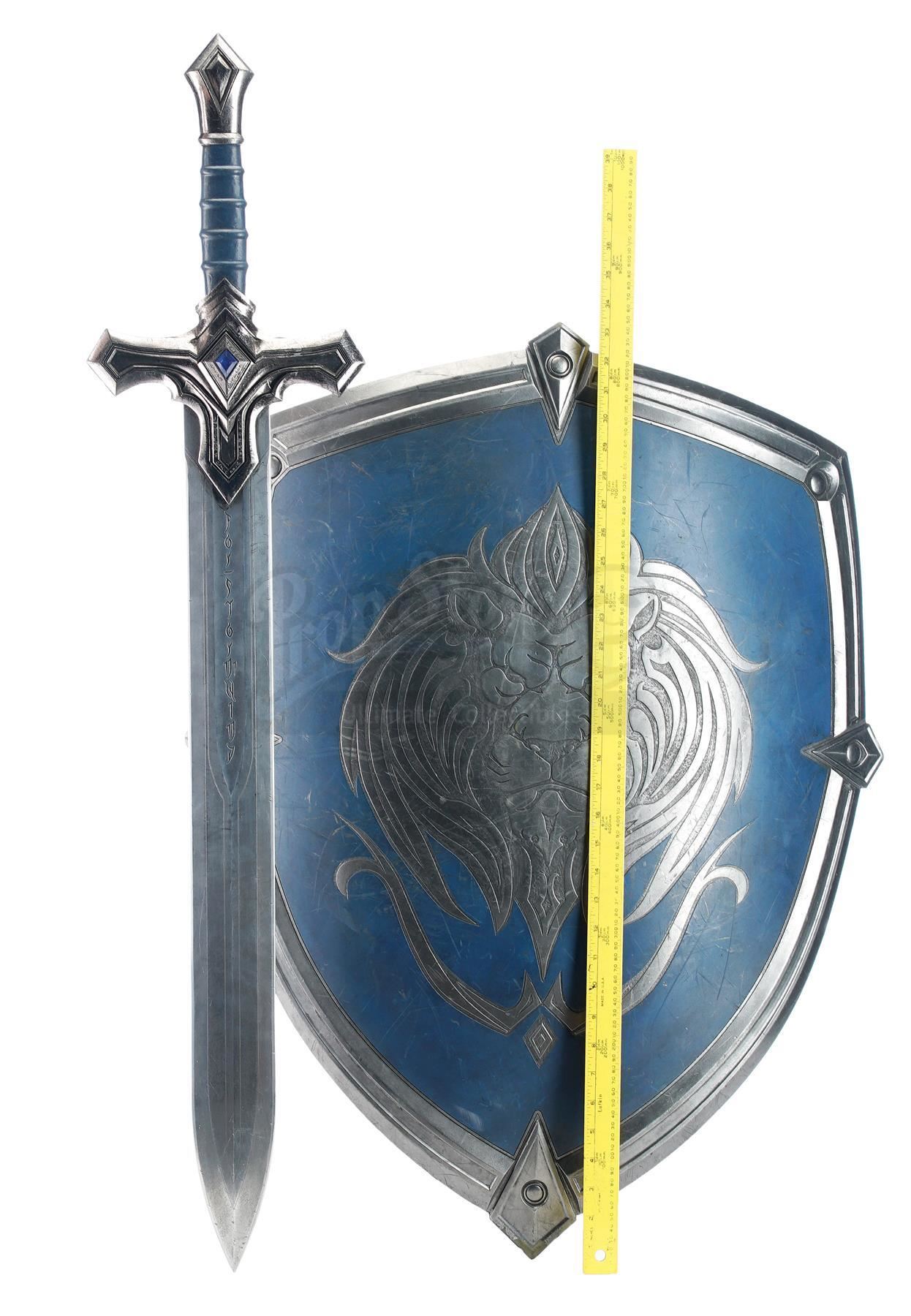 This lot will be auctioned on Tuesday, June 29th. The auction will begin at 9:00am PDT and lots are sold sequentially via live auctioneer; tune in to the live streaming broadcast on auction day to follow the pace. Note other lots in the auction may close on June 30th or July 1st. An Alliance foot soldier's sword and shield from Legendary Pictures' fantasy epic Warcraft. Foot soldiers of the Alliance wielded their blue and silver-color weaponry as they battled the Orc Horde. The urethane sword features a silver-color blade engraved with runes, a blue urethane gem inset in the hilt, and a ridged grip painted blue. The shield features matching blue details, a Stormwind lion emblem engraved on front, and leather arm straps. The lot exhibits signs of production use, including scuffs, scrapes, and fraying leather throughout, but remains in good overall condition. Dimensions (sword): 42.5" x 9.75" x 1.75" (108 cm x 25 cm x 4.5 cm); (shield): 33" x 25" x 5" (84 cm x 63.5 cm x 13 cm) Estimate: $3,000 - 5,000