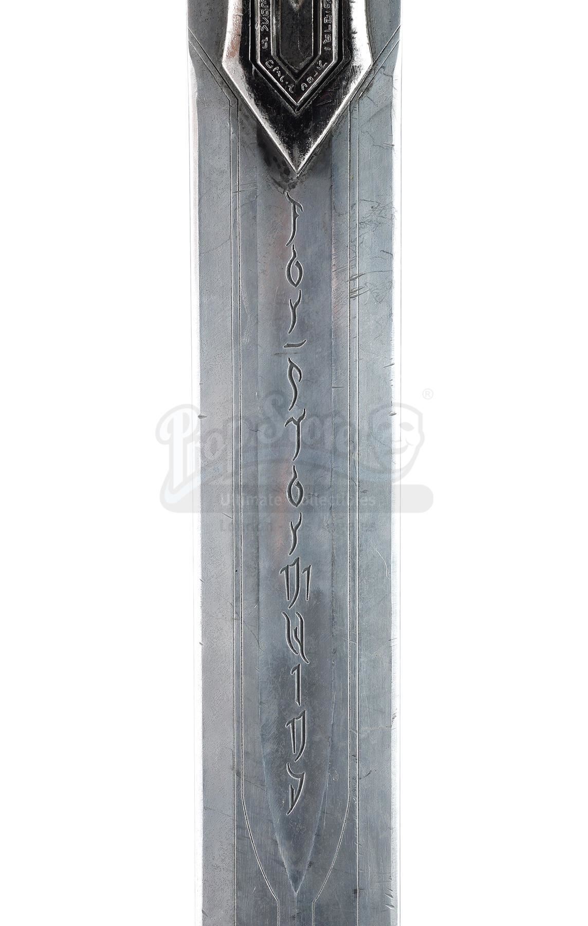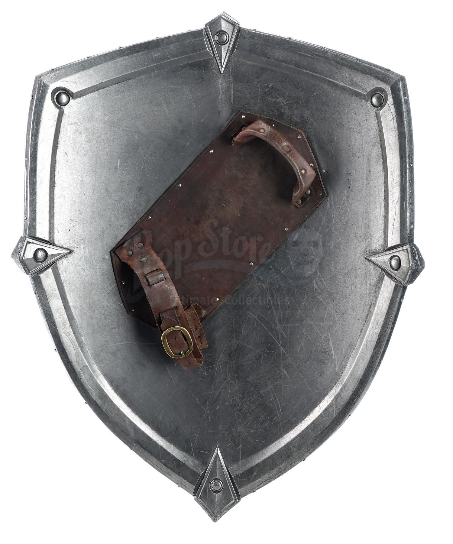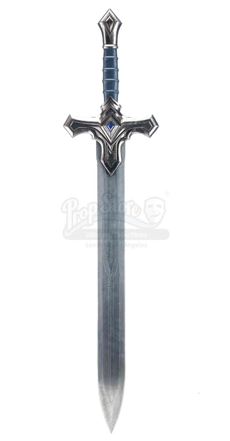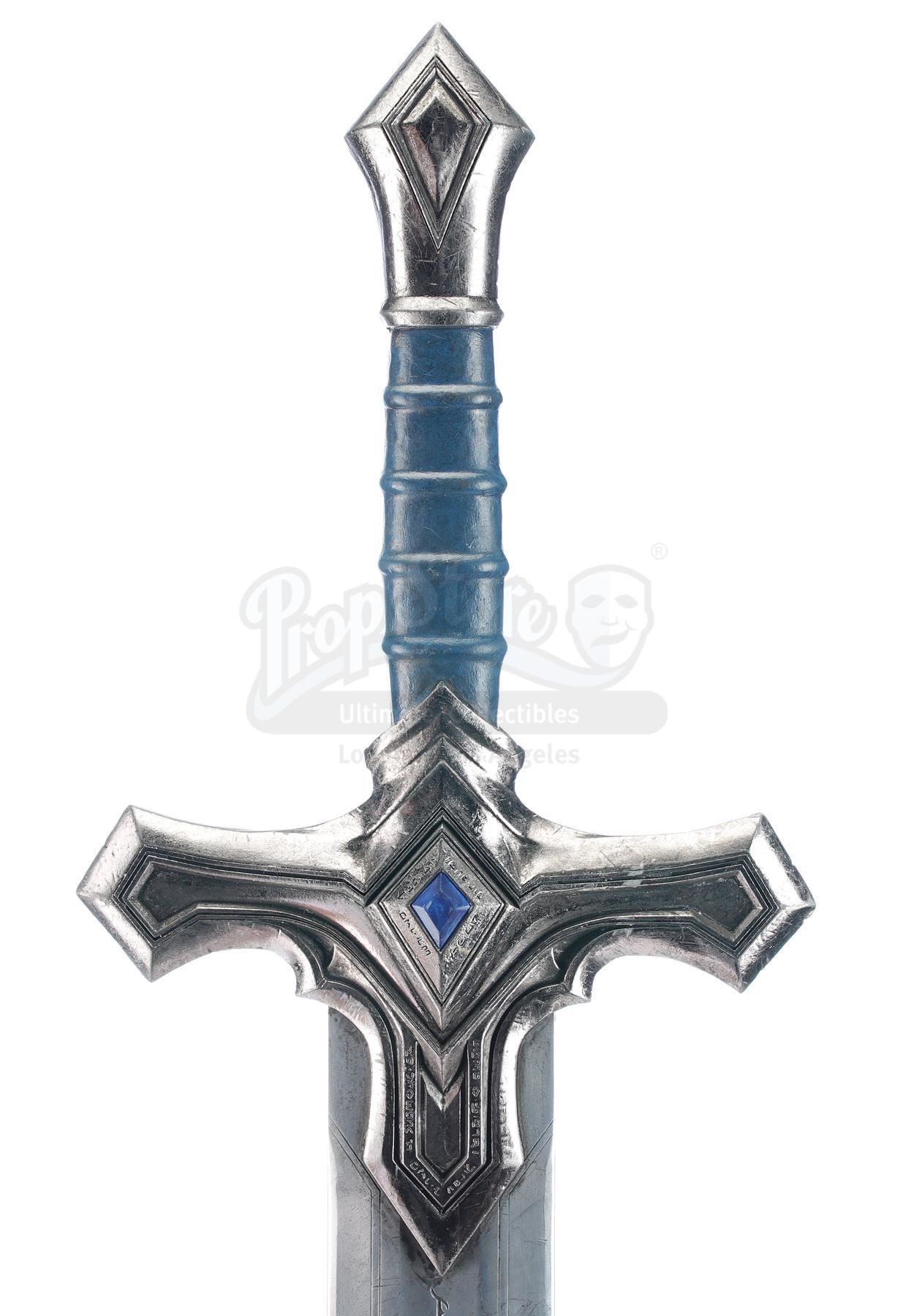 This lot will be auctioned on Tuesday, June 29th. The auction will begin at 9:00am PDT and lots are sold sequentially via live auctioneer; tune in to the live streaming broadcast on auction day to follow the pace. Note other lots in the auction may close on June 30th or July 1st. An Alliance foot soldier's sword and shield from Legendary Pictures' fantasy epic Warcraft. Foot soldiers of the Alliance wielded their blue and silver-color weaponry as they battled the Orc Horde. The urethane sword features a silver-color blade engraved with runes, a blue urethane gem inset in the hilt, and a ridged grip painted blue. The shield features matching blue details, a Stormwind lion emblem engraved on front, and leather arm straps. The lot exhibits signs of production use, including scuffs, scrapes, and fraying leather throughout, but remains in good overall condition. Dimensions (sword): 42.5" x 9.75" x 1.75" (108 cm x 25 cm x 4.5 cm); (shield): 33" x 25" x 5" (84 cm x 63.5 cm x 13 cm) Estimate: $3,000 - 5,000