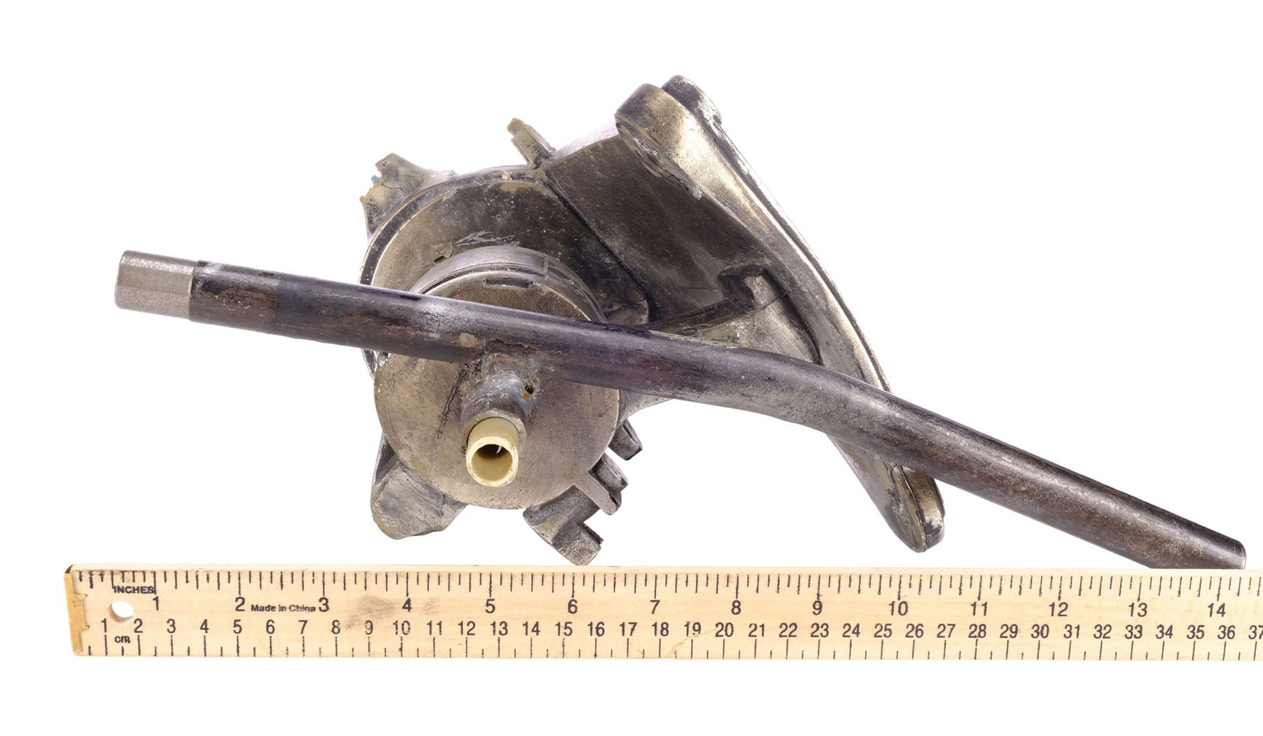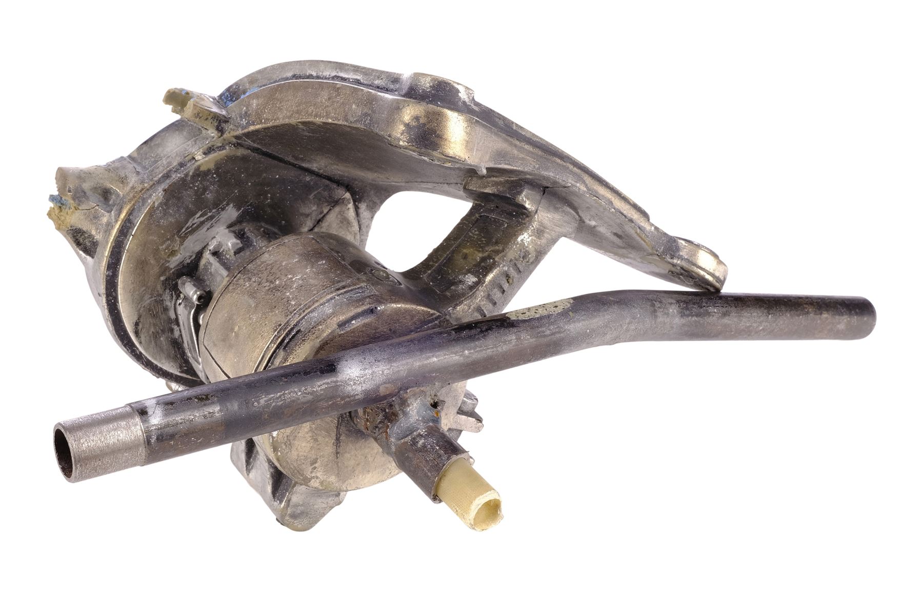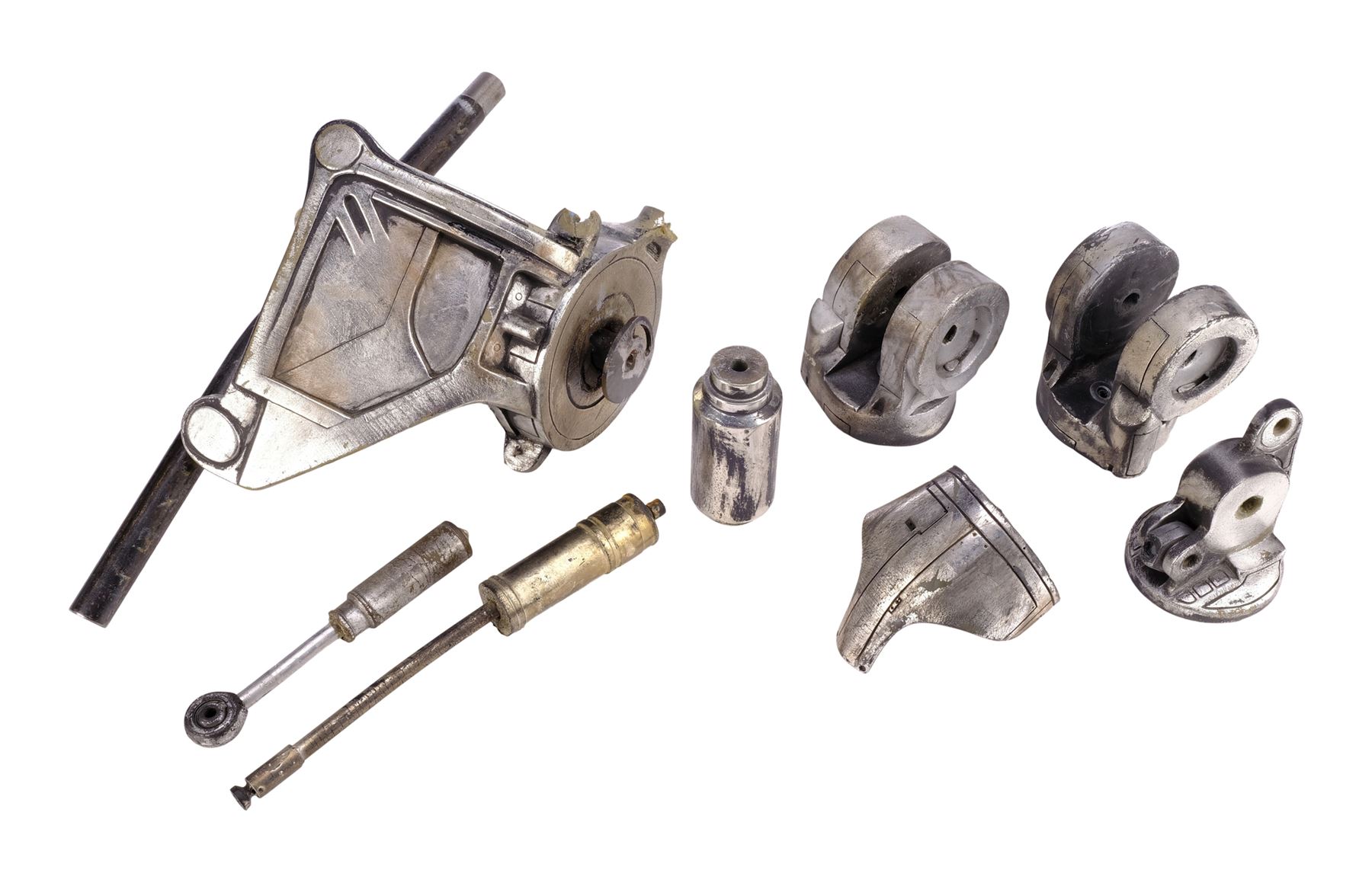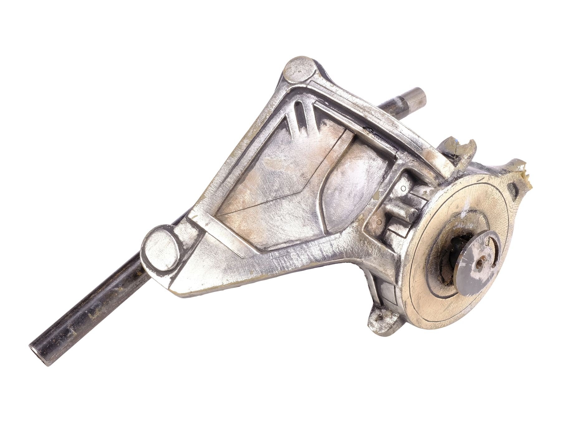 This set consists of a foam rubber and metal hip joint and seven foam rubber endoskeleton hydraulic pumps, joints, and covers all moulded by Stan Winston Studio, painted in matching shades of black with metallic finishes, and intentionally distressed by production to appear battle-worn. The hip joint features a rotating metal bar with a resin interior that moves a flat disc on the reverse. This set exhibits chips, cracks, and seams to the rubber and resin, exposing both in places. Dimensions: (largest) 43.25 cm x 25.5 cm x 20.25 cm (17" x 10" x 8")