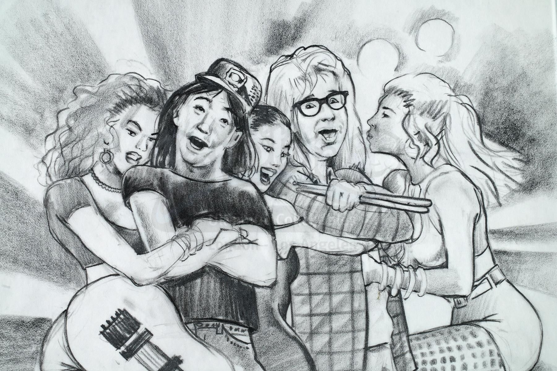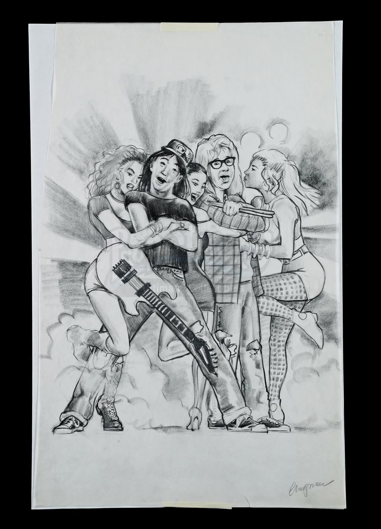 This lot will be auctioned on Tuesday, June 29th. The auction will begin at 9:00am PDT and lots are sold sequentially via live auctioneer; tune in to the live streaming broadcast on auction day to follow the pace. Note other lots in the auction may close on June 30th or July 1st.  Hand-Drawn poster concept artwork by Dan Chapman for Penelope Spheeris' comedy Wayne's World. Suburban rock fans Wayne (Mike Meyers) and Garth (Dana Carvey) dealt with new fame when their public access show became popular.   Rendered in mixed media on white illustration paper, this black and white image depicts Wayne and Garth with several women on a smoke-filled stage and is signed by Chapman along with a letter of authenticity from him. It exhibits signs of wear from age and use, including tape remnants, but remains in excellent overall condition. Dimensions: 17" x 11" (43.25 cm x 28 cm)  Sold without copyright; see notice in the Buyer's Guide.  Estimate: $800 - 1,200
