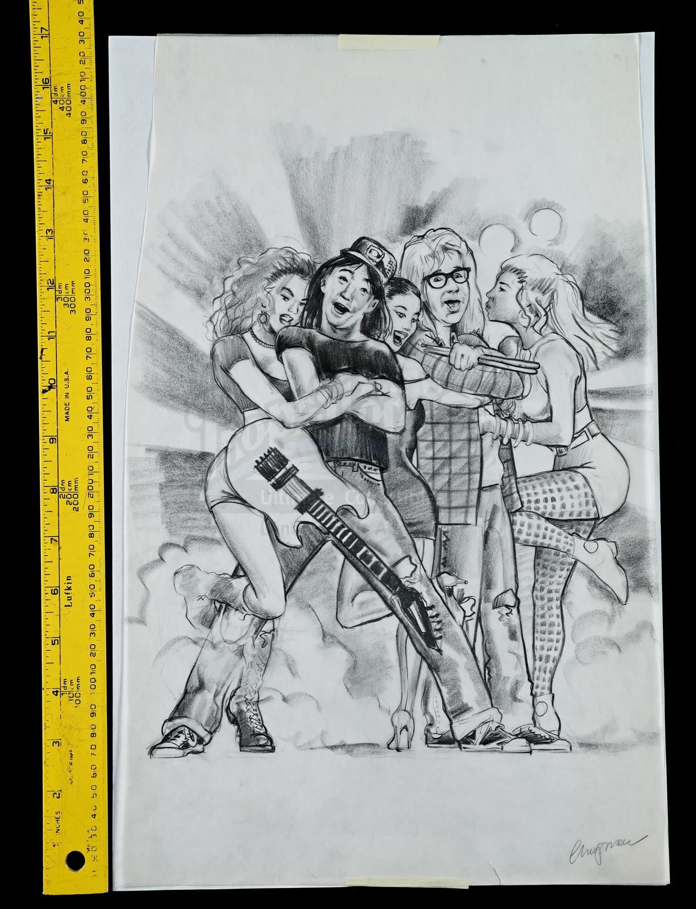 This lot will be auctioned on Tuesday, June 29th. The auction will begin at 9:00am PDT and lots are sold sequentially via live auctioneer; tune in to the live streaming broadcast on auction day to follow the pace. Note other lots in the auction may close on June 30th or July 1st. Hand-Drawn poster concept artwork by Dan Chapman for Penelope Spheeris' comedy Wayne's World. Suburban rock fans Wayne (Mike Meyers) and Garth (Dana Carvey) dealt with new fame when their public access show became popular. Rendered in mixed media on white illustration paper, this black and white image depicts Wayne and Garth with several women on a smoke-filled stage and is signed by Chapman along with a letter of authenticity from him. It exhibits signs of wear from age and use, including tape remnants, but remains in excellent overall condition. Dimensions: 17" x 11" (43.25 cm x 28 cm) Sold without copyright; see notice in the Buyer's Guide. Estimate: $800 - 1,200