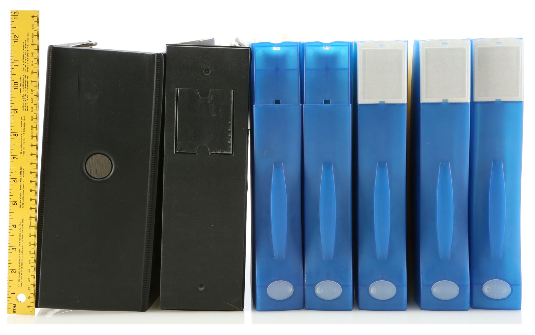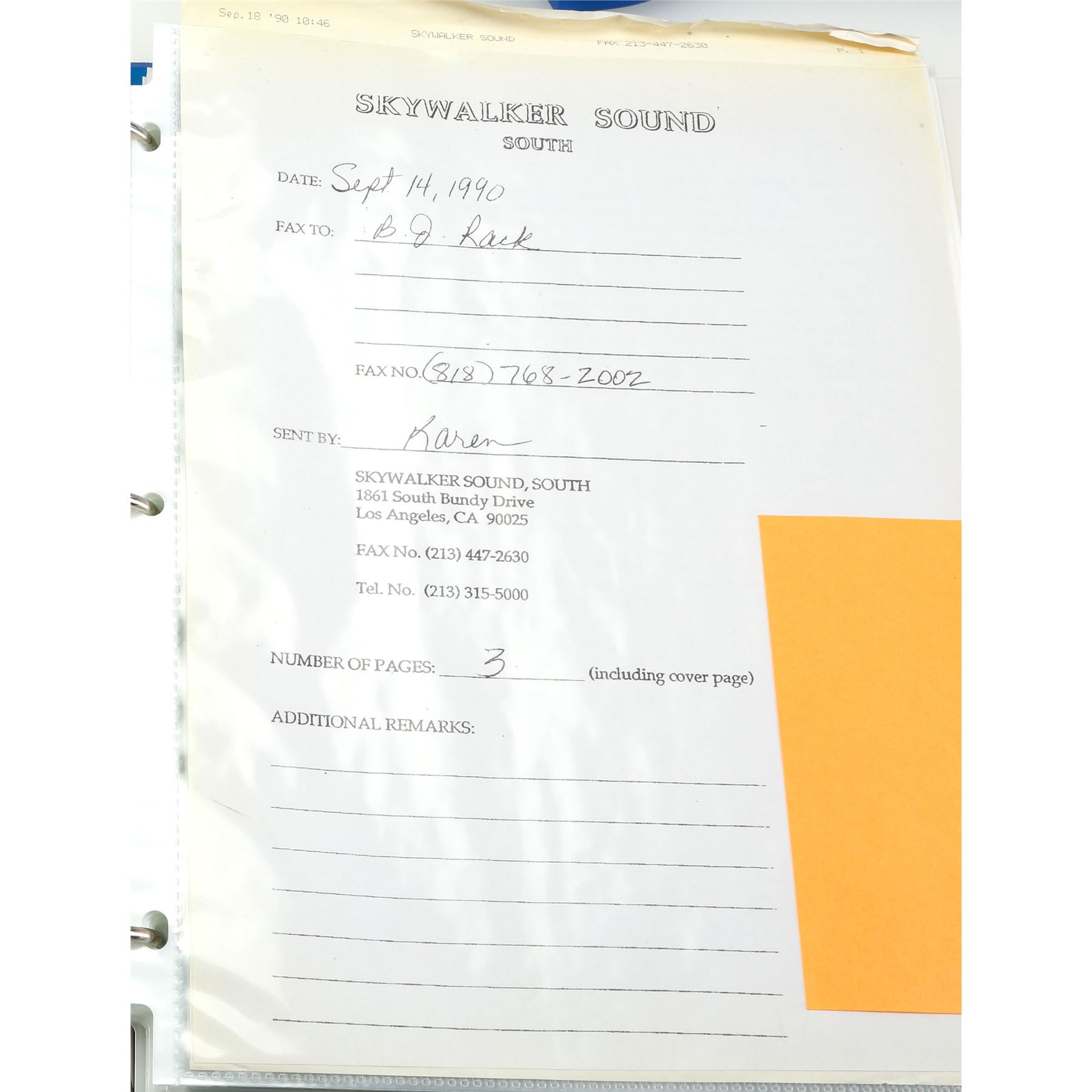 This lot features two large black binders, five smaller blue binders, and paperwork without binders. Three binders include storyboard copies of different sequences depicted in the film and some sequences omitted from the film's final cut. The rest of the binders and paperwork include a 124-page production script dated July 18, 1990 with the production code and date stamped on each page, various memos to the film's director and producers, invoices, approval sheets, faxes, visual effects lists, breakdown sheets, and production schedules. The lot exhibits some signs of wear from use and age, including edge wear and creasing. Dimensions: (largest) 29.25 cm x 31.75 cm x 12.25 cm (11.5" x 12.5" x 4.75")