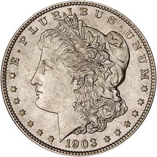 1903 Morgan Dollar. The grade seems more or less to sum up the situation with this 1903: the stupendous example offered here not only shatters the normally seen striking woes for the issue, but its sparkling satin surfaces border on perfection. (#7284)