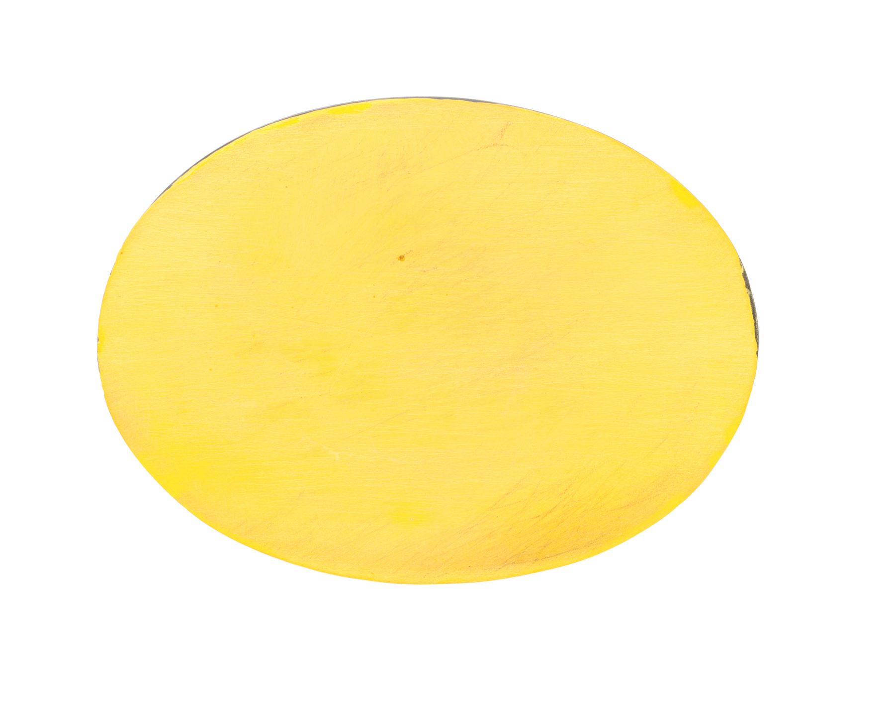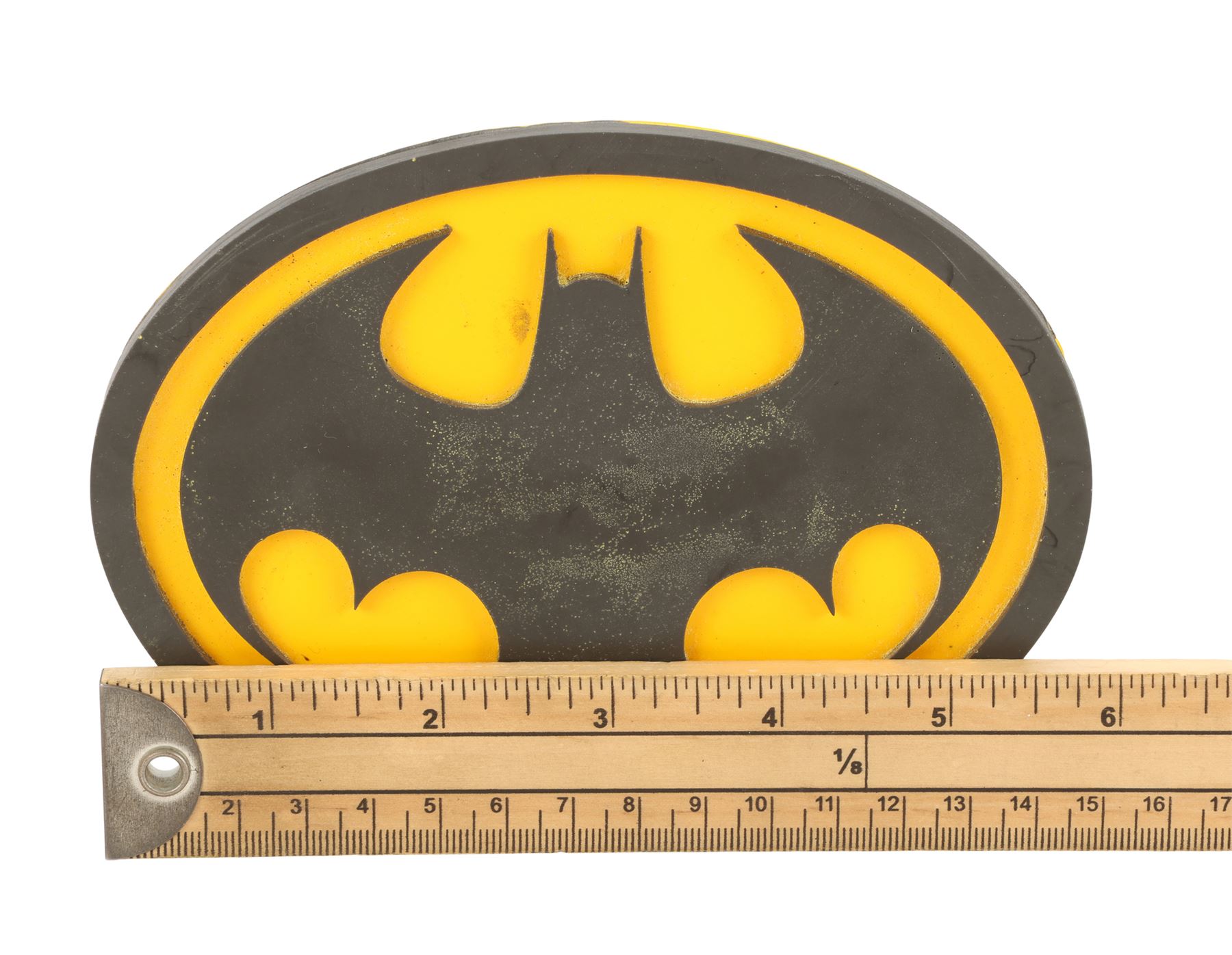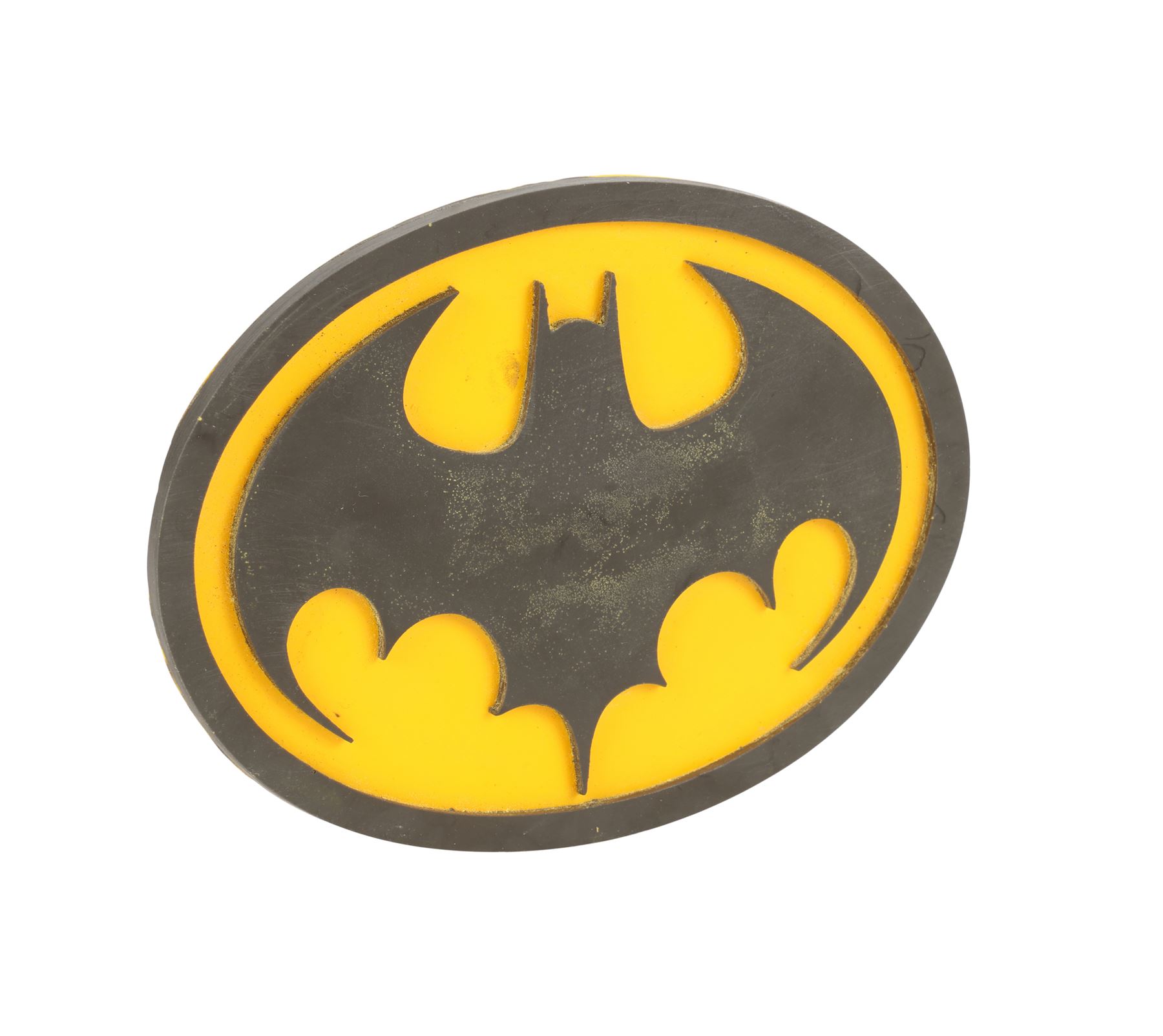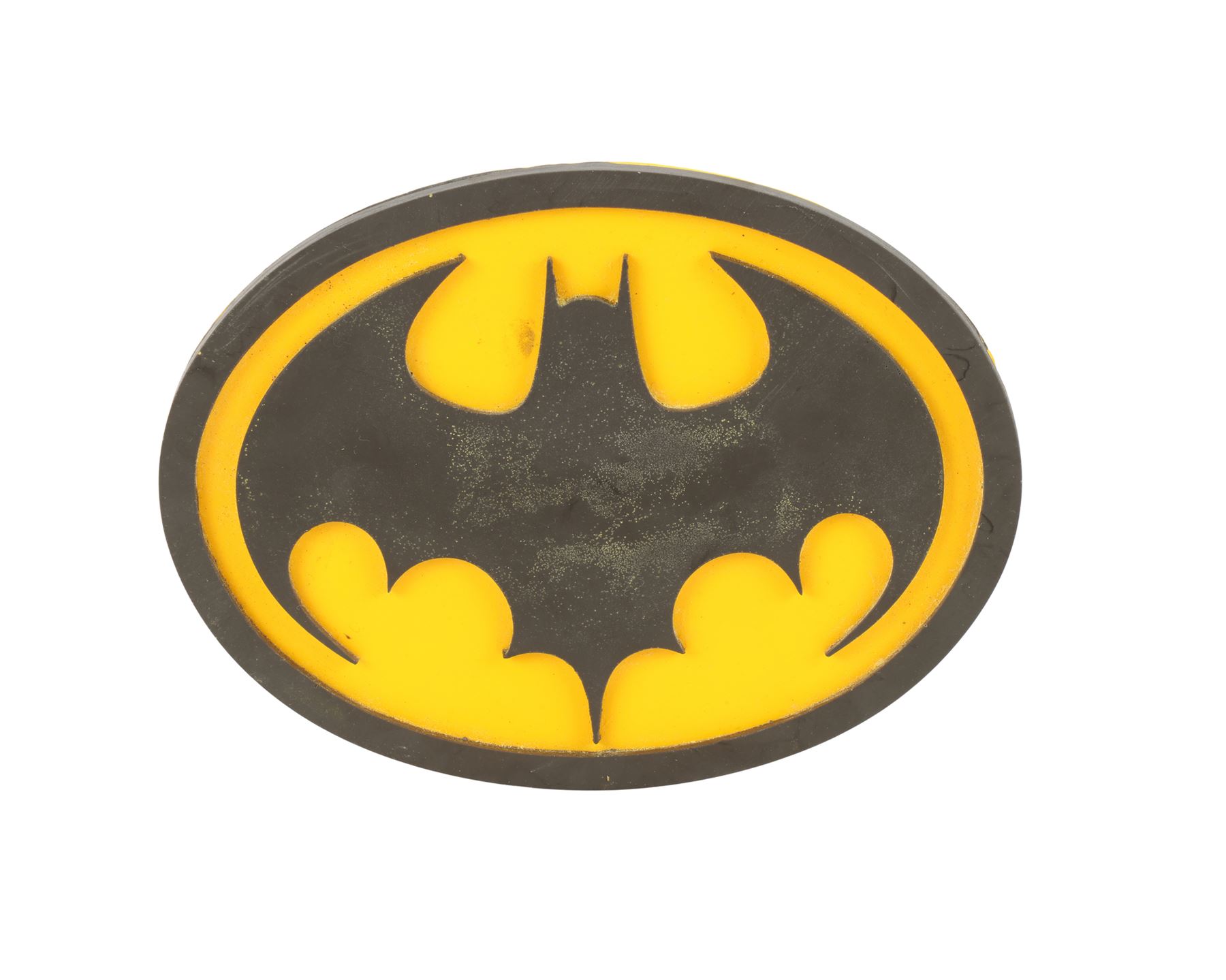 A production-made Batman (Michael Keaton) emblem from Tim Burton's superhero film Batman. While fighting crime and defending Gotham City from the depraved Joker (Jack Nicholson), Batman wore the iconic emblem in the centre of his batsuit's chest. This resin emblem features a raised bat logo painted black against a yellow backing with a raised black edge. The lot exhibits some minor scuffs at the top of the emblem's raised edge above the bathead. Dimensions: 15 cm x 11.5 cm x 1 cm (6" x 4 1/2" x 1/2")