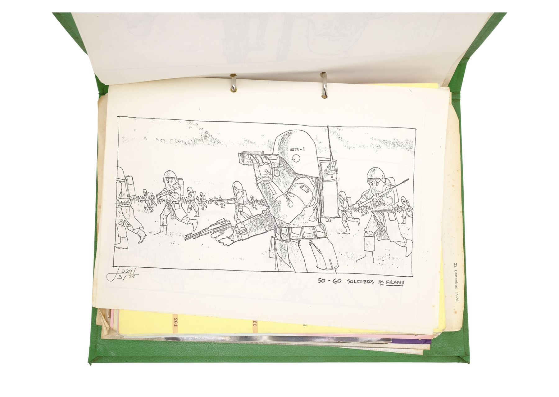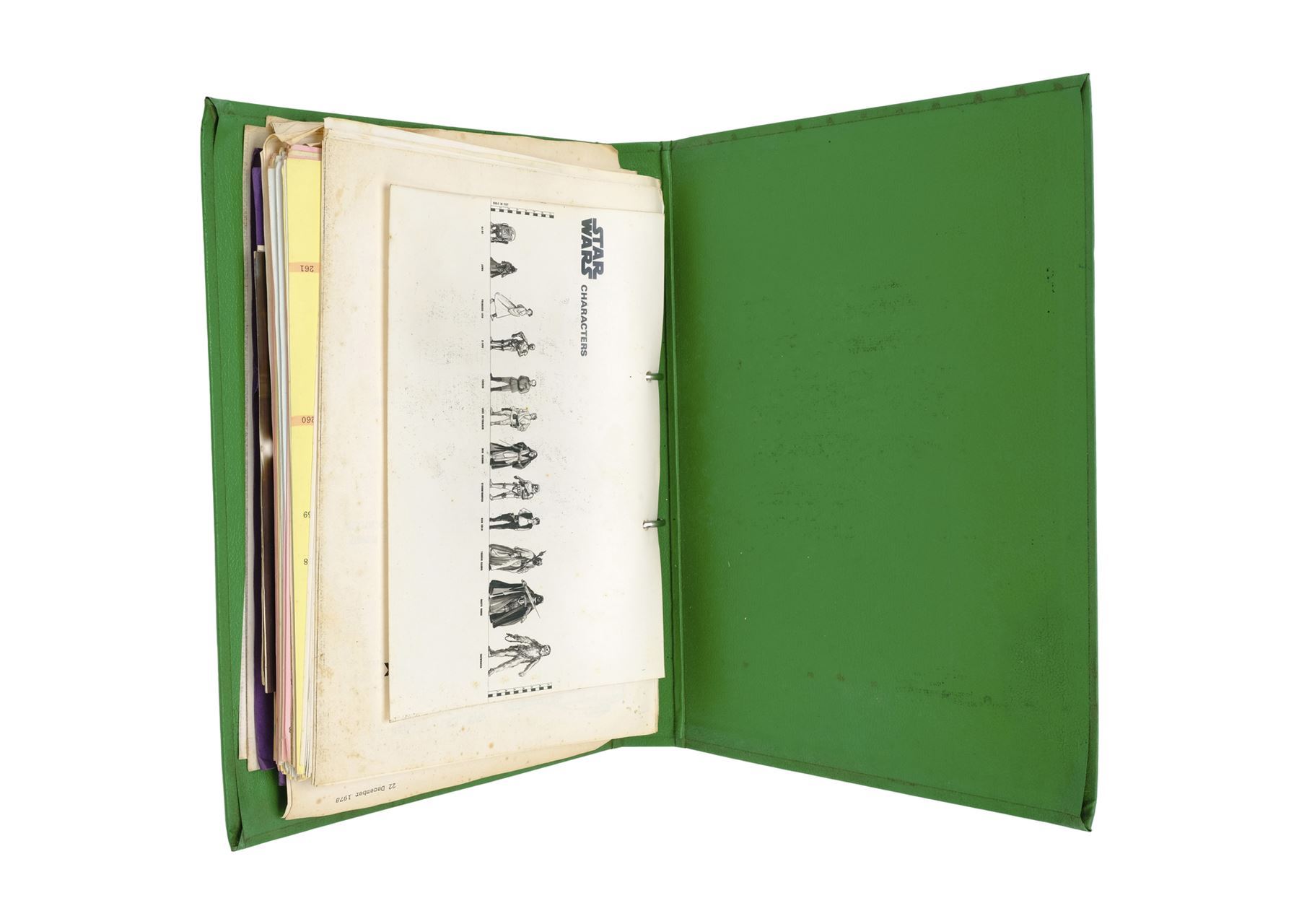 This lot includes numerous materials never before publicly seen within a 221-page green vinyl binder featuring: two highlighted and handwritten annotated scripts; typed correspondences to Ford from production supervisor Bruce Sharman and property master Frank Bruton; a Norwegian location prop list of copied illustrations; storyboard copies; black-and-white printed photo references; and various other notes with handwritten annotations. This lot exhibits discoloration and minor stains from age. Dimensions: 9.75" x 13.5" x 1.5" (25 cm x 34.5 cm x 4 cm)