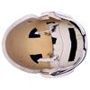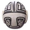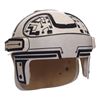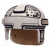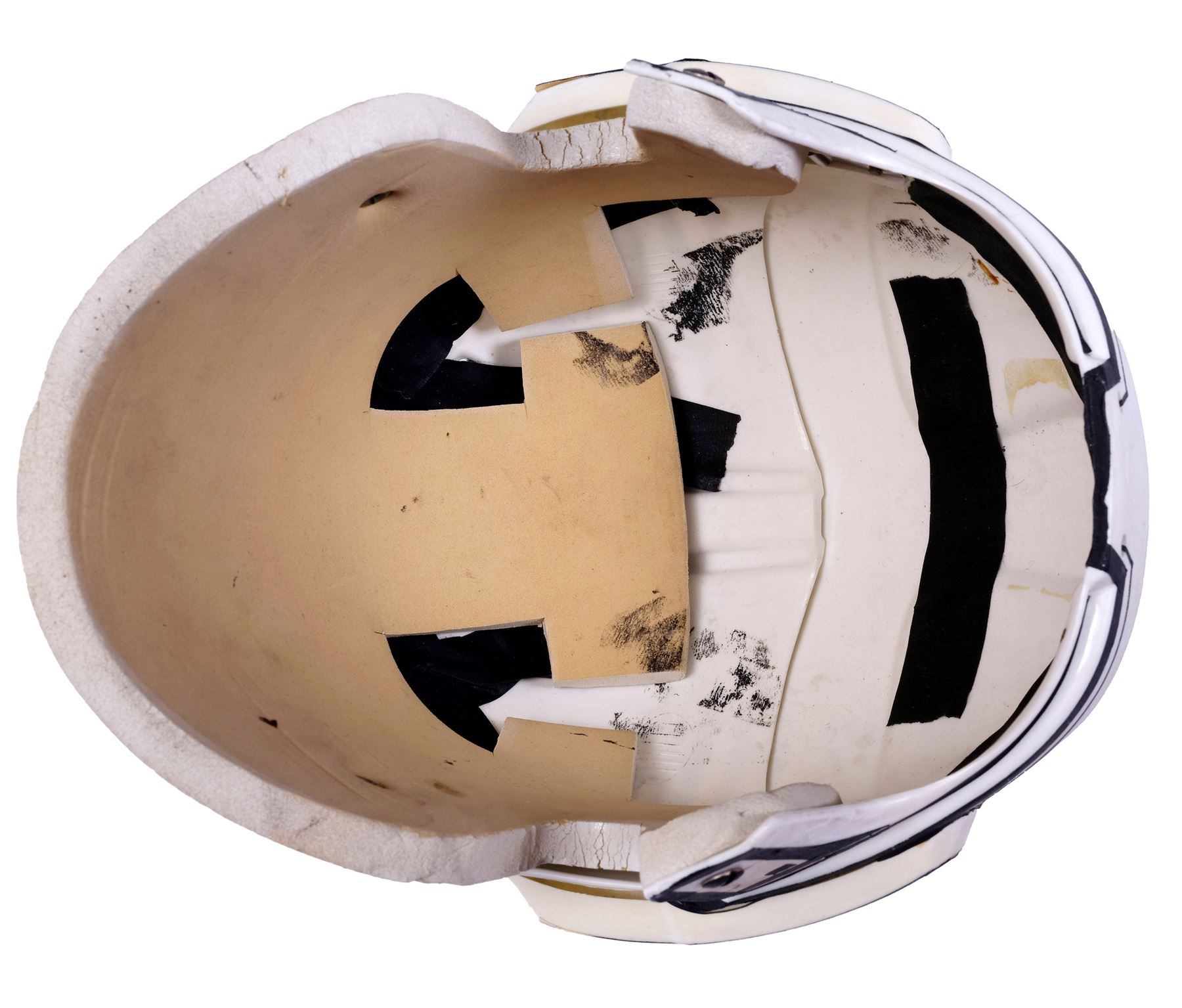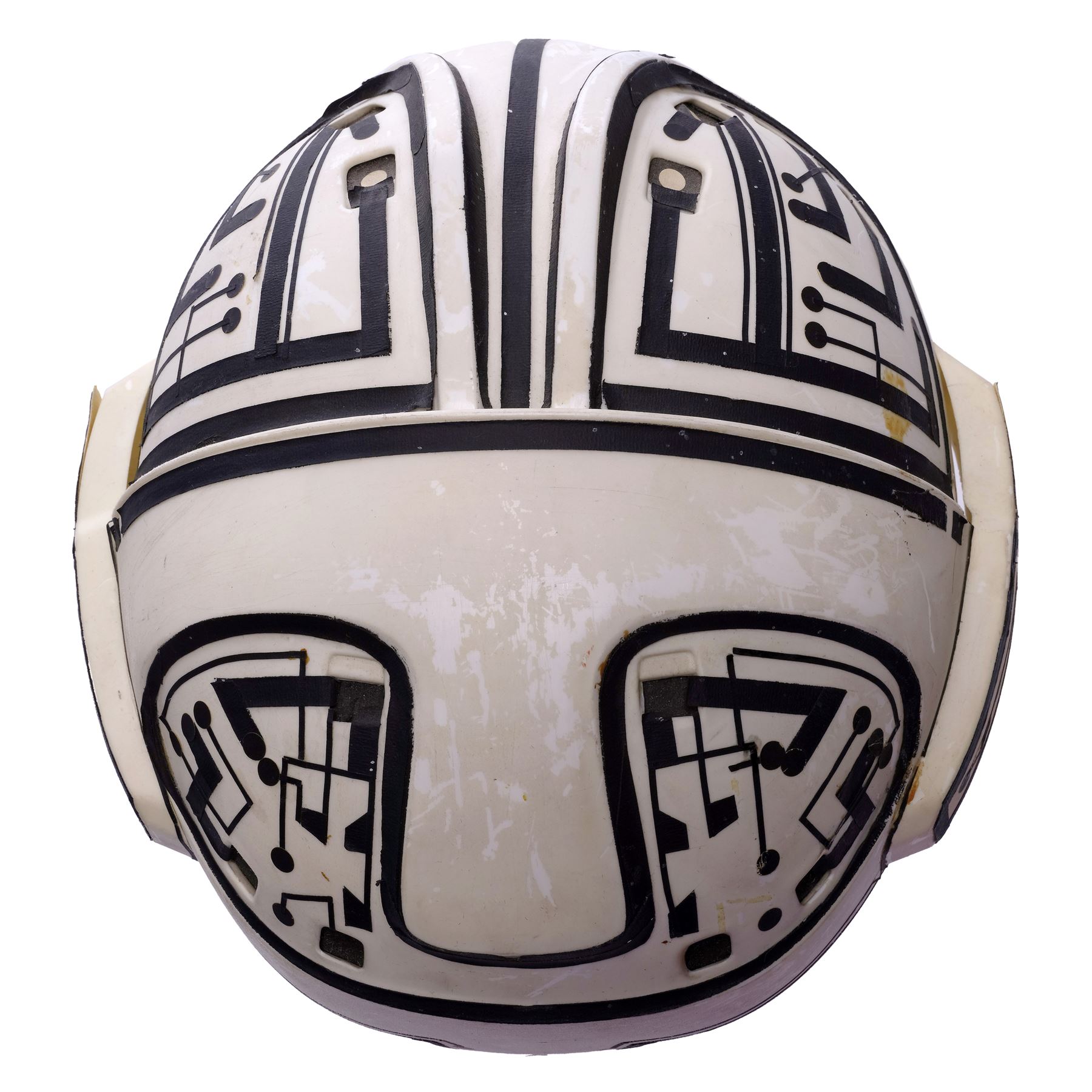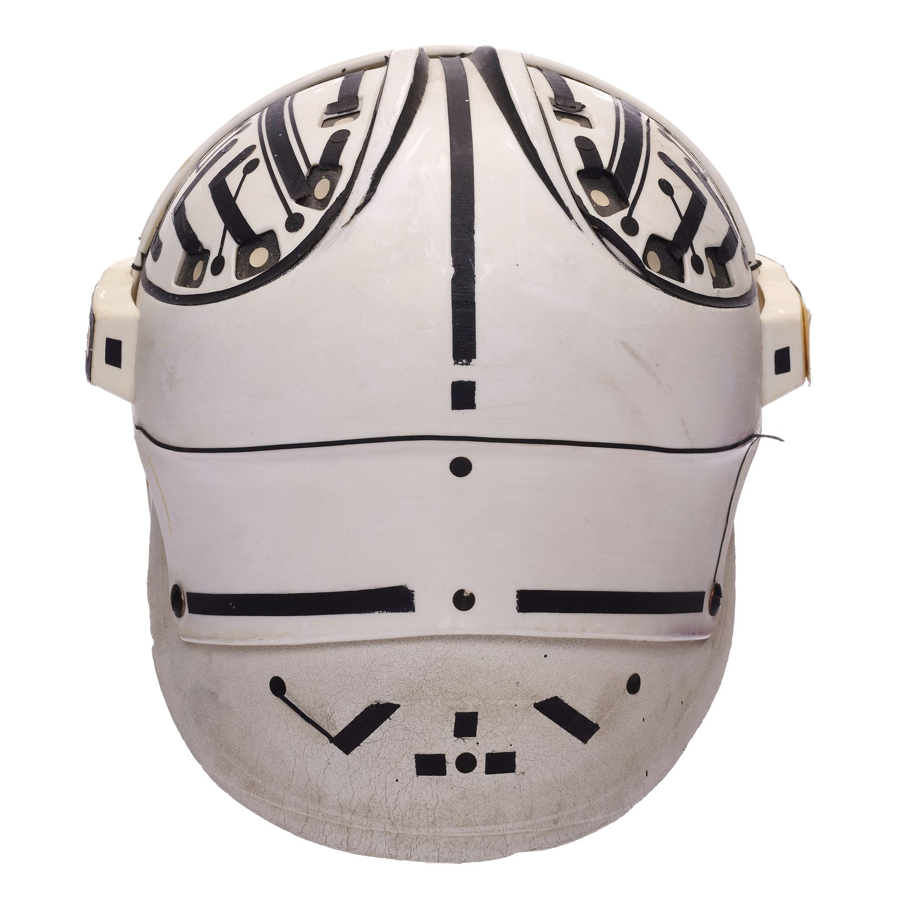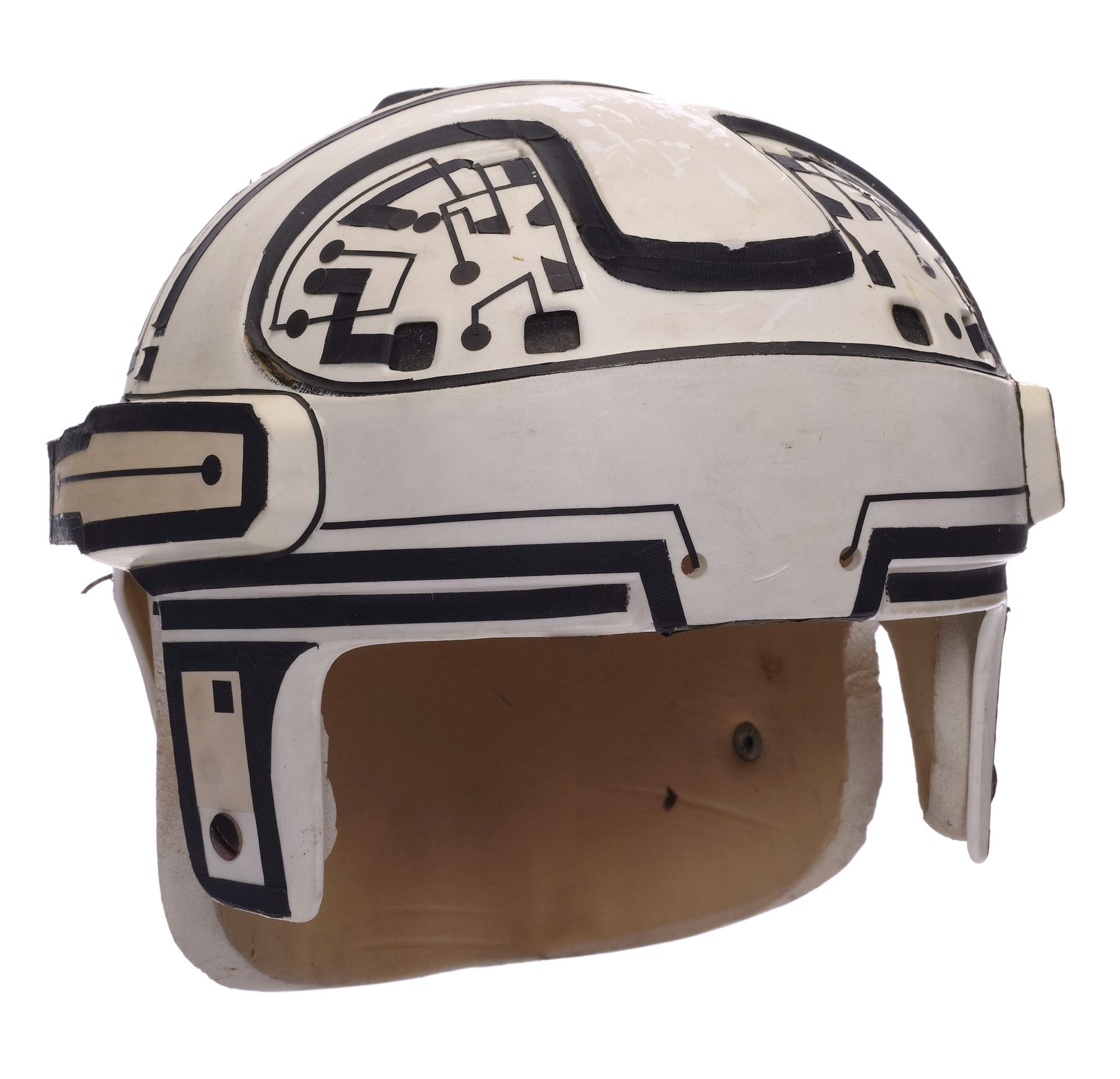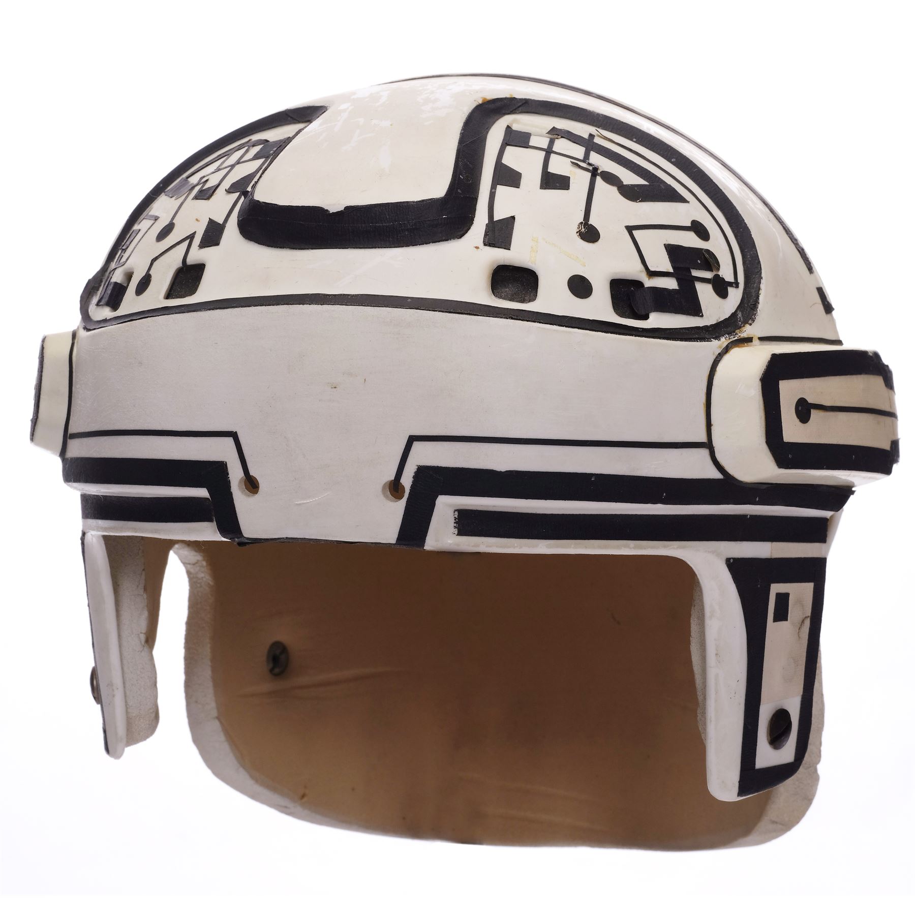 This custom-made helmet is made of white vacuum-formed plastic covered in intricate circuit-board decals made from black tape, and the inside is lined with white foam. The helmet exhibits wear from use and age, including scuffing, discolouration, peeling tape, and adhesive residue.