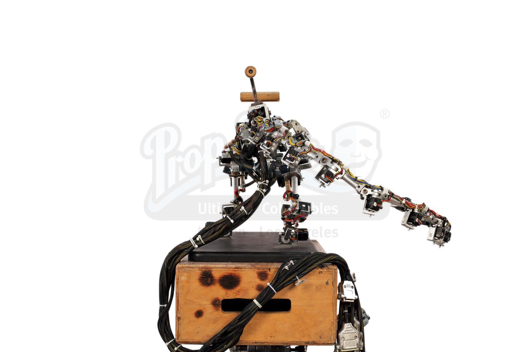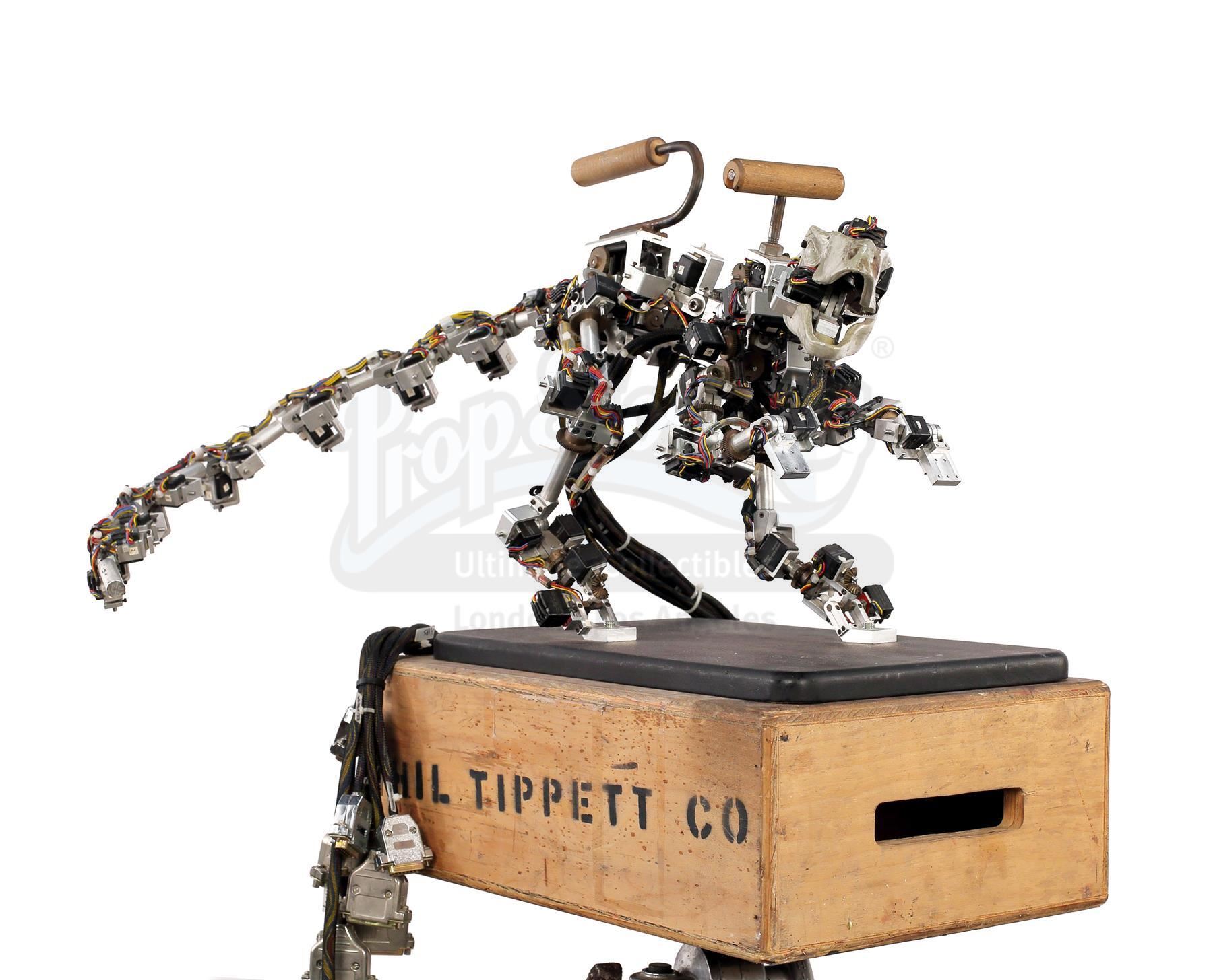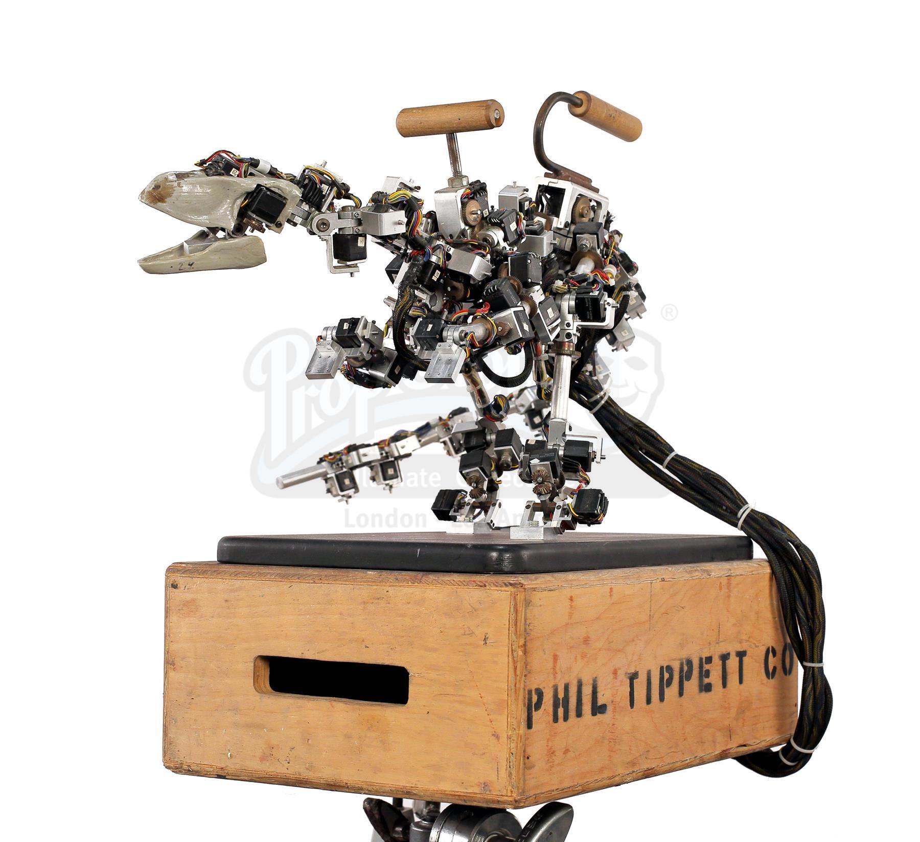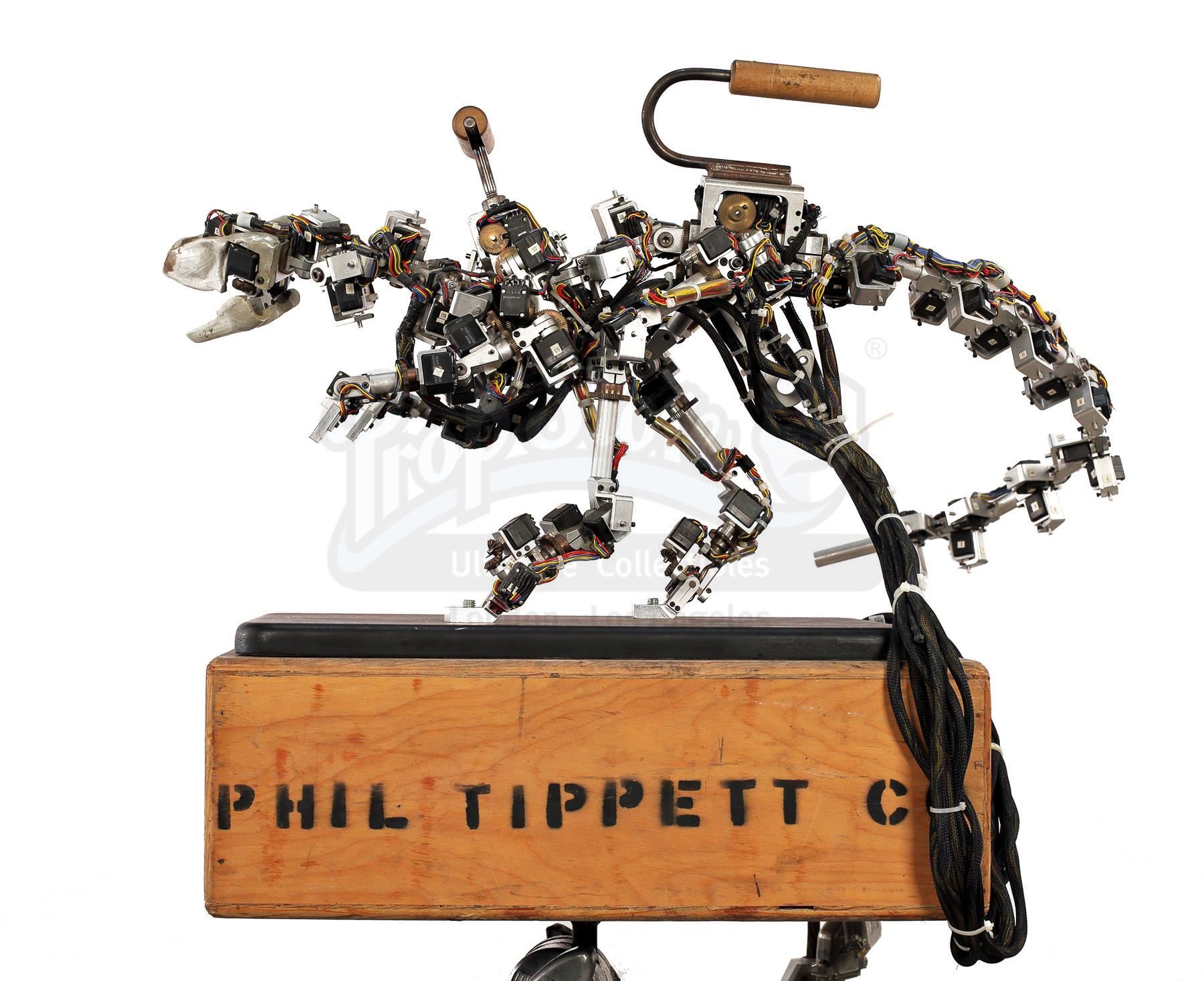 This raptor D.I.D. features a custom-machined metal stop motion armature that is wired throughout with sensors and encoders, affixed with two wooden handles, and mounted to a wooden display base painted black. The wiring is secured with zip-ties and leads to metal multi-pin connectors. This armature is in good overall condition with minimal wear from production and age, including flaking paint and some disconnected wiring. This lot comes from Tippett, who along with Dennis Muren, Michael Lantieri, and Stan Winston received an Academy Award for Visual Effects for his work on the film. The D.I.D. contributed heavily to the award winning work and helped combine art and technology for a breakthrough in cinema effects. Includes a letter of authenticity from Phil Tippett.