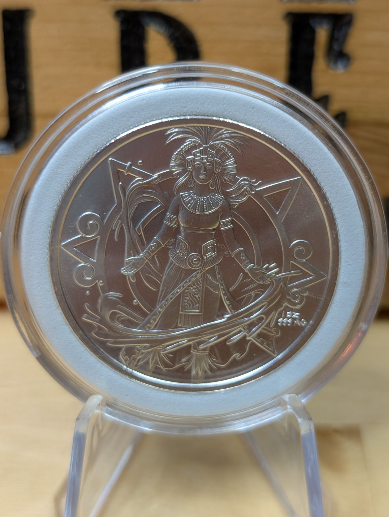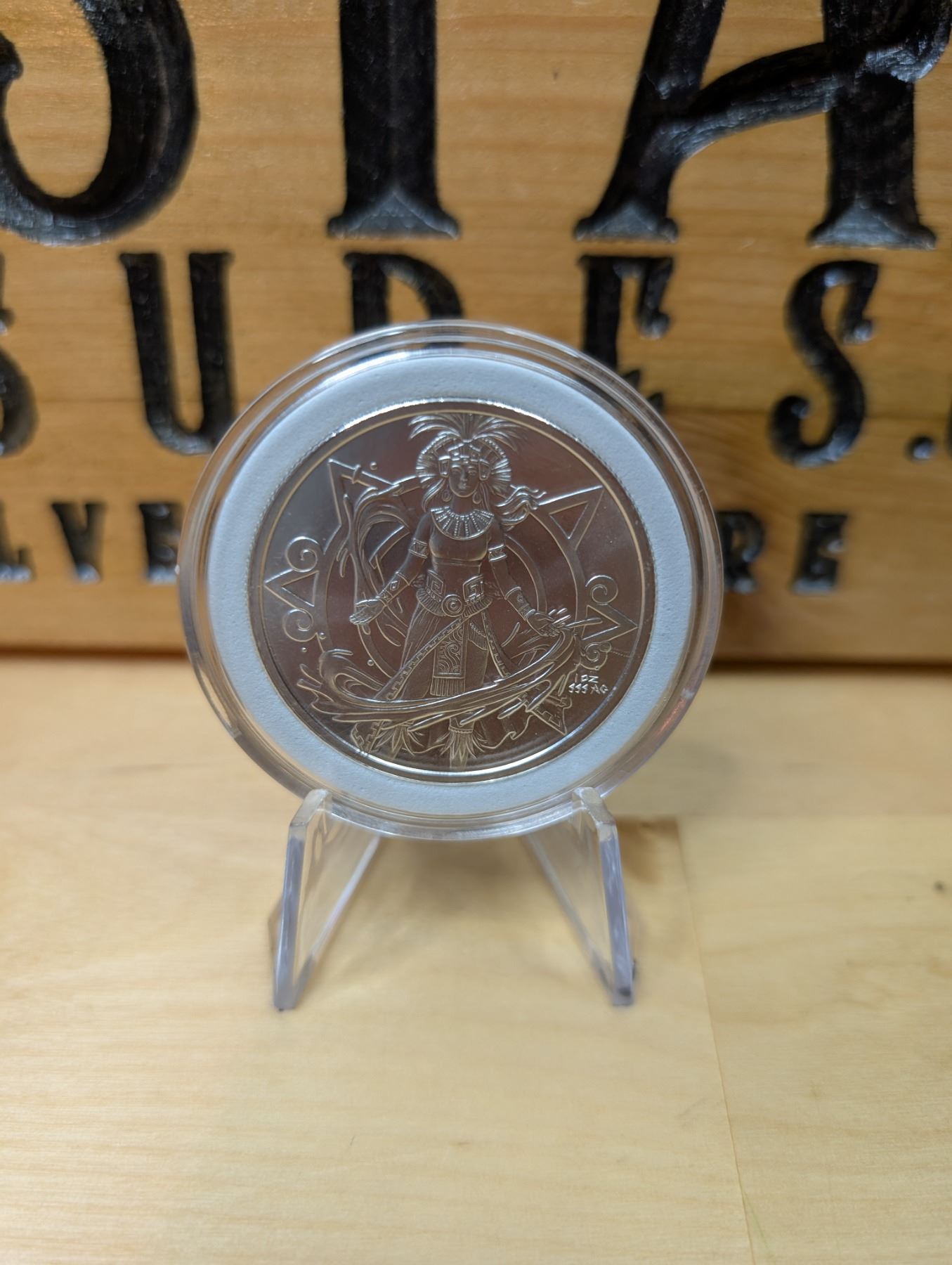 The 1 oz Aztec Goddess Silver Round is a 1-ounce, 99.9% pure silver round, often featuring a design inspired by an Aztec goddess, such as Coatlicue or another prominent figure from Aztec mythology. The round typically showcases intricate artwork, highlighting the goddess's powerful symbolism. These rounds are popular among collectors and investors for their unique design, cultural significance, and high silver content.