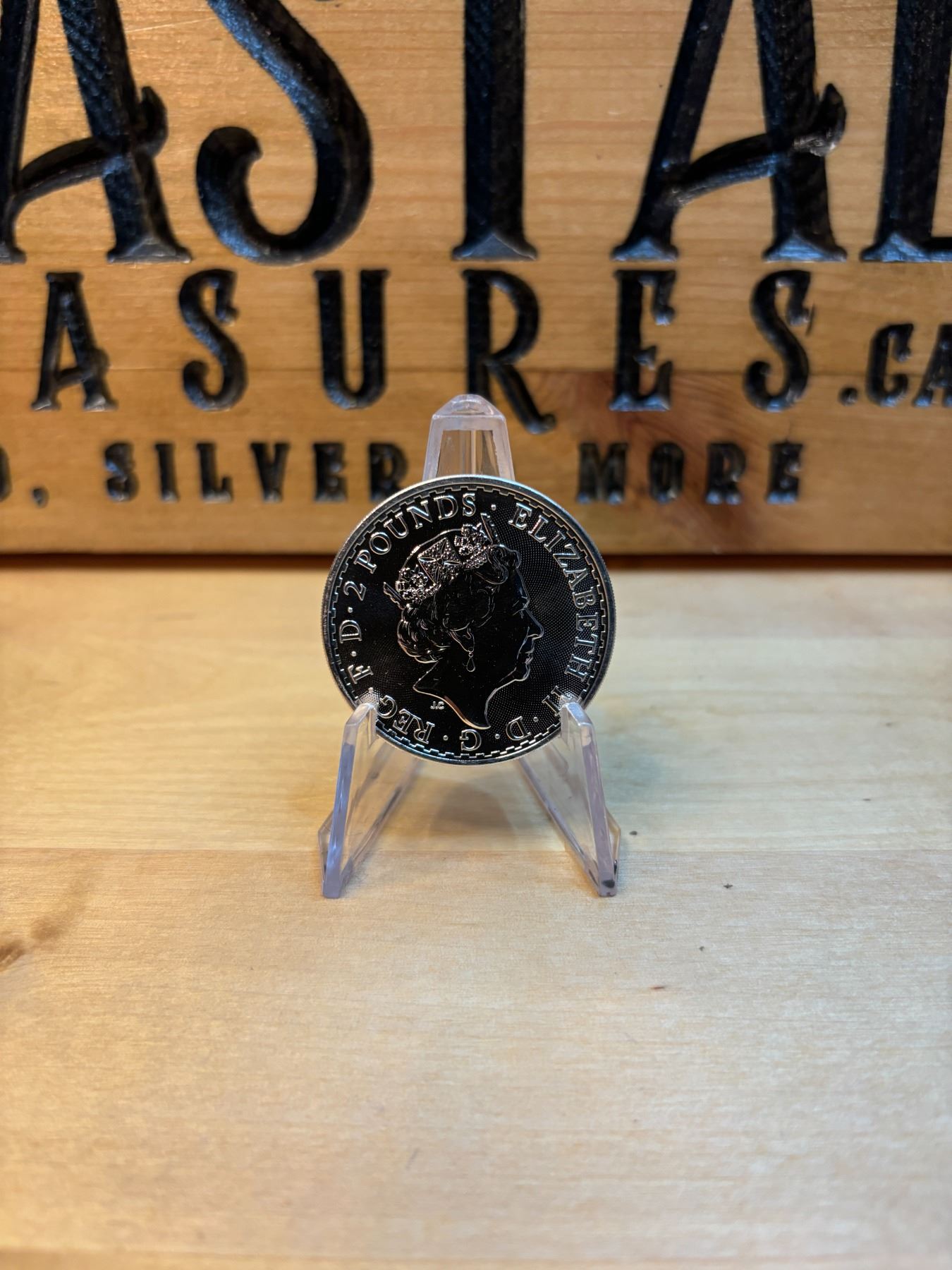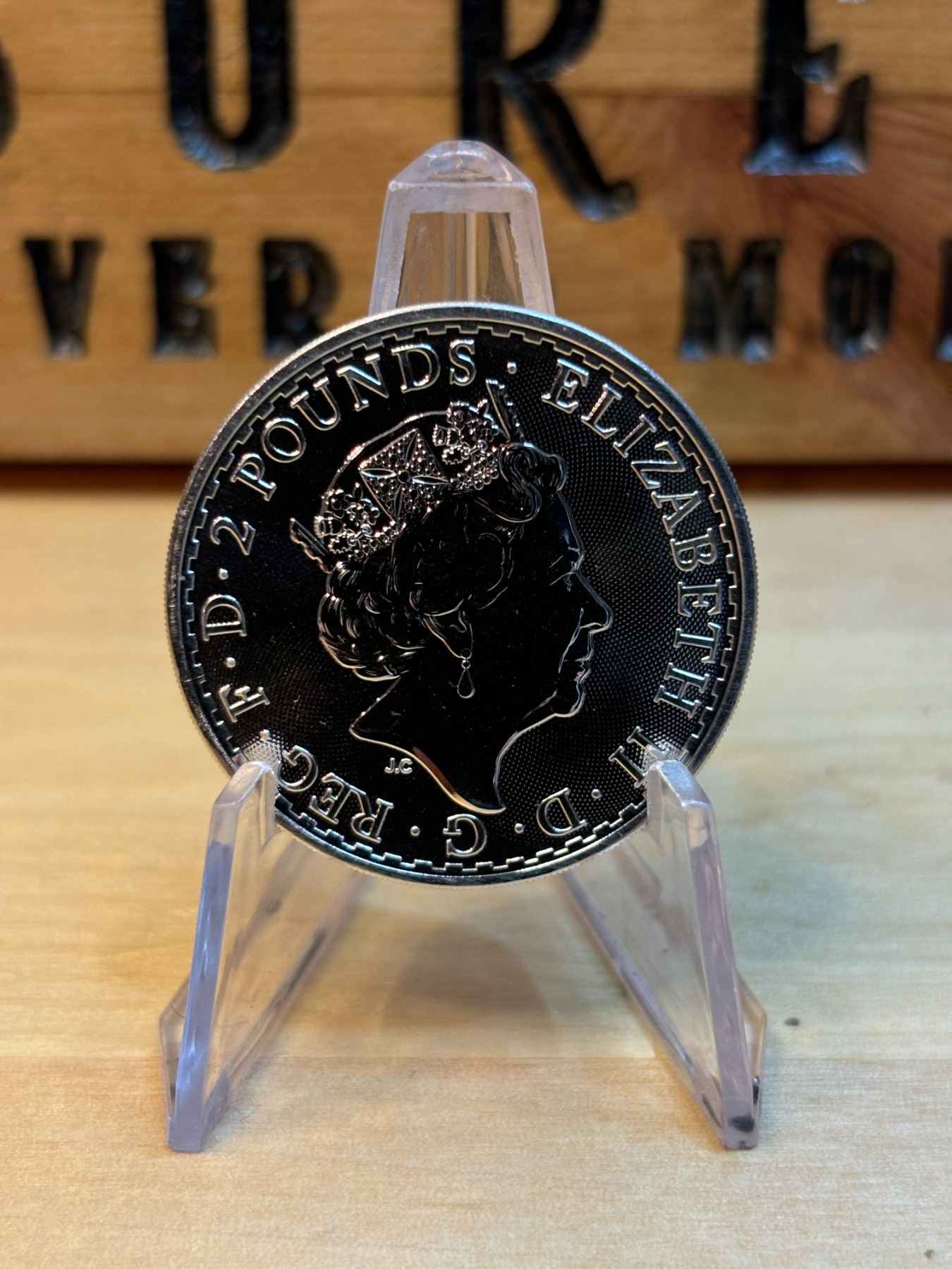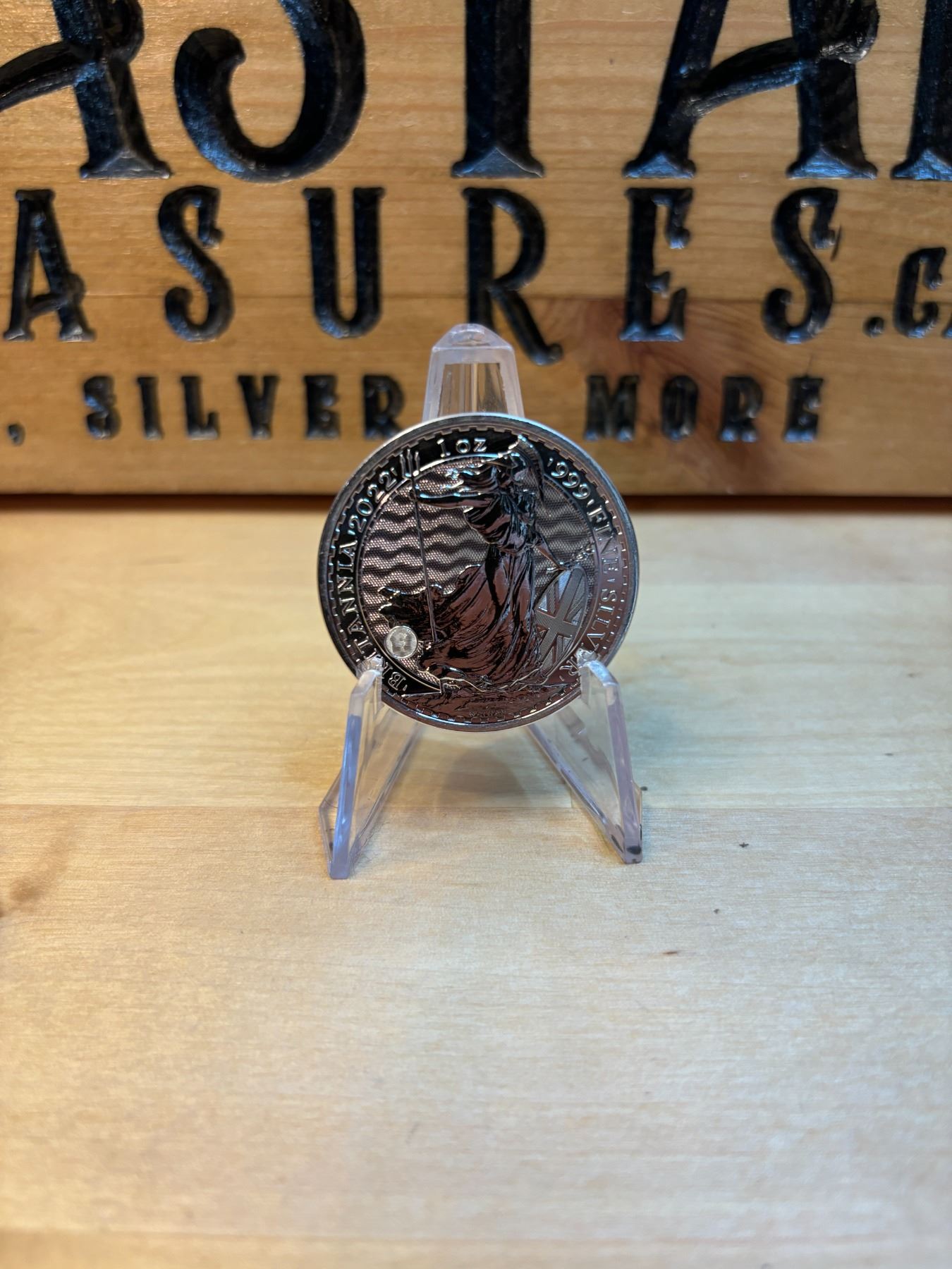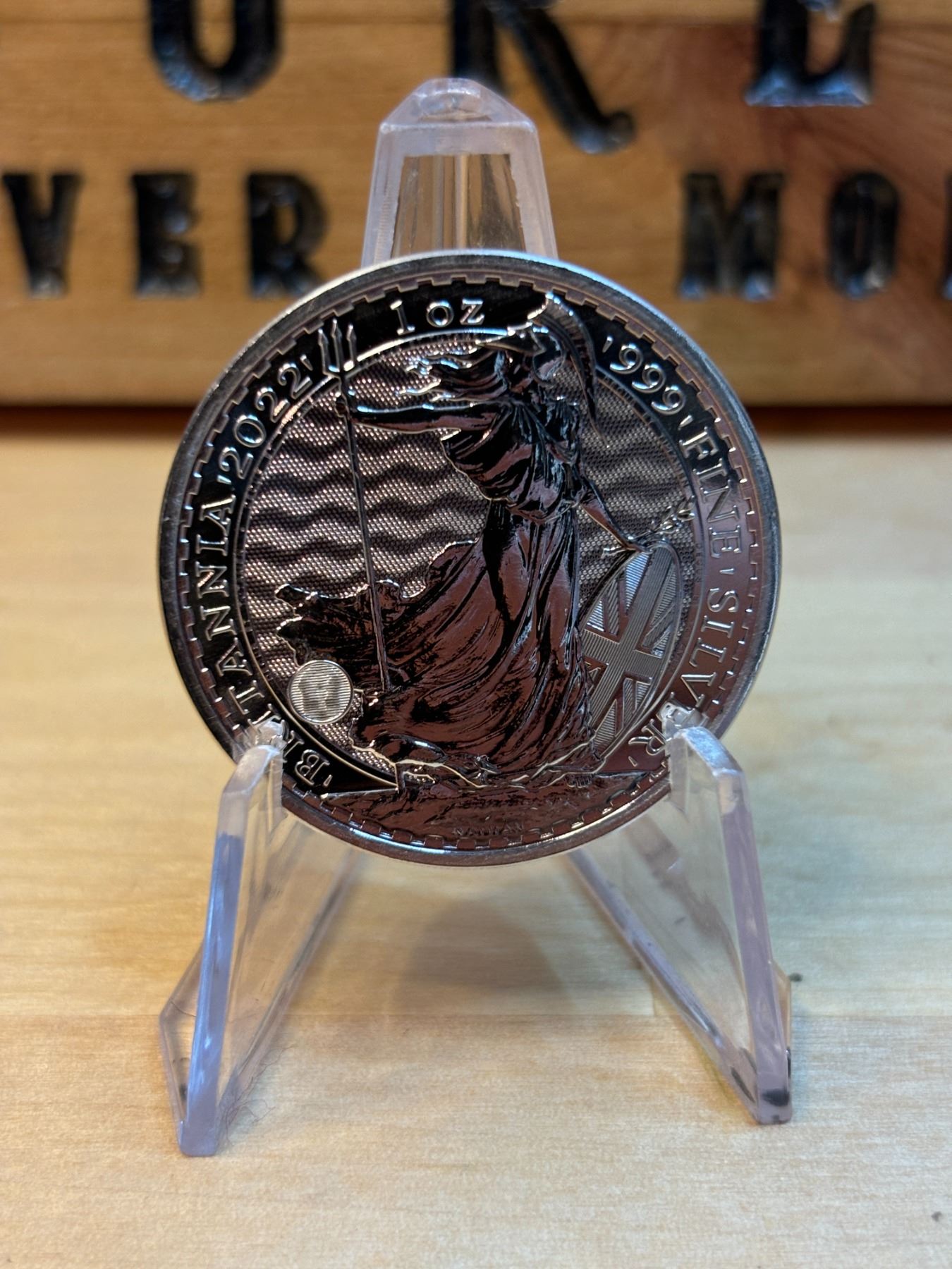 The 1 oz Britannia 2022 Silver coin is a popular bullion coin minted by the Royal Mint in the United Kingdom. Made from 99.99% pure silver, it features the iconic Britannia design on the reverse, symbolizing strength and unity, with Britannia holding a trident and shield. The obverse typically displays an effigy of Queen Elizabeth II. With a weight of 1 ounce (31.1035 grams) and a diameter of 38.61 mm, the 2022 edition is part of an annual series that attracts both collectors and investors due to its high purity, historical significance, and beautiful design.