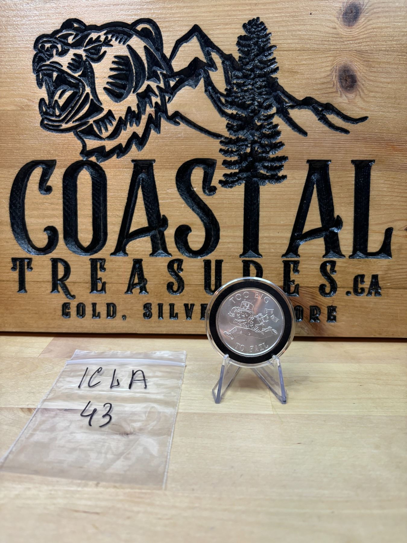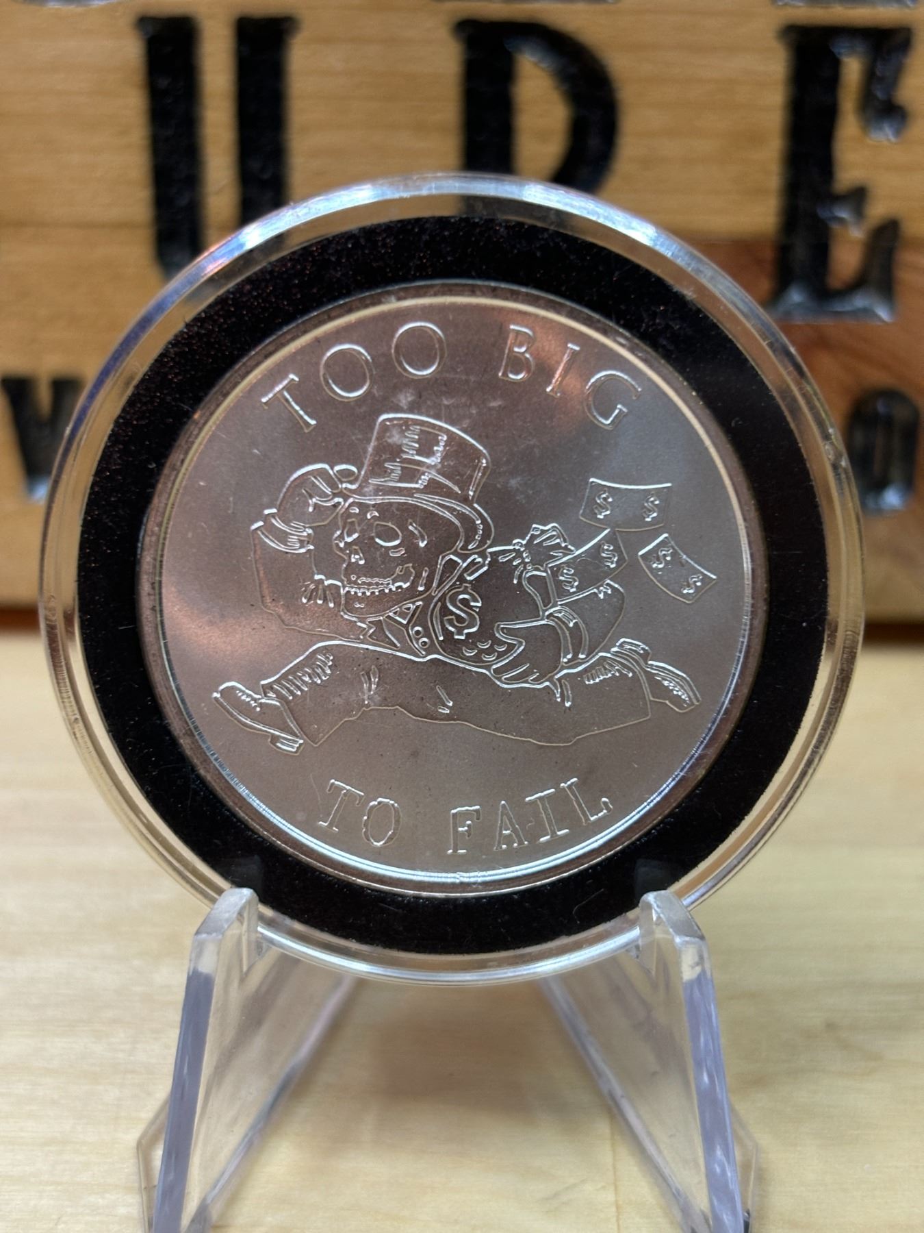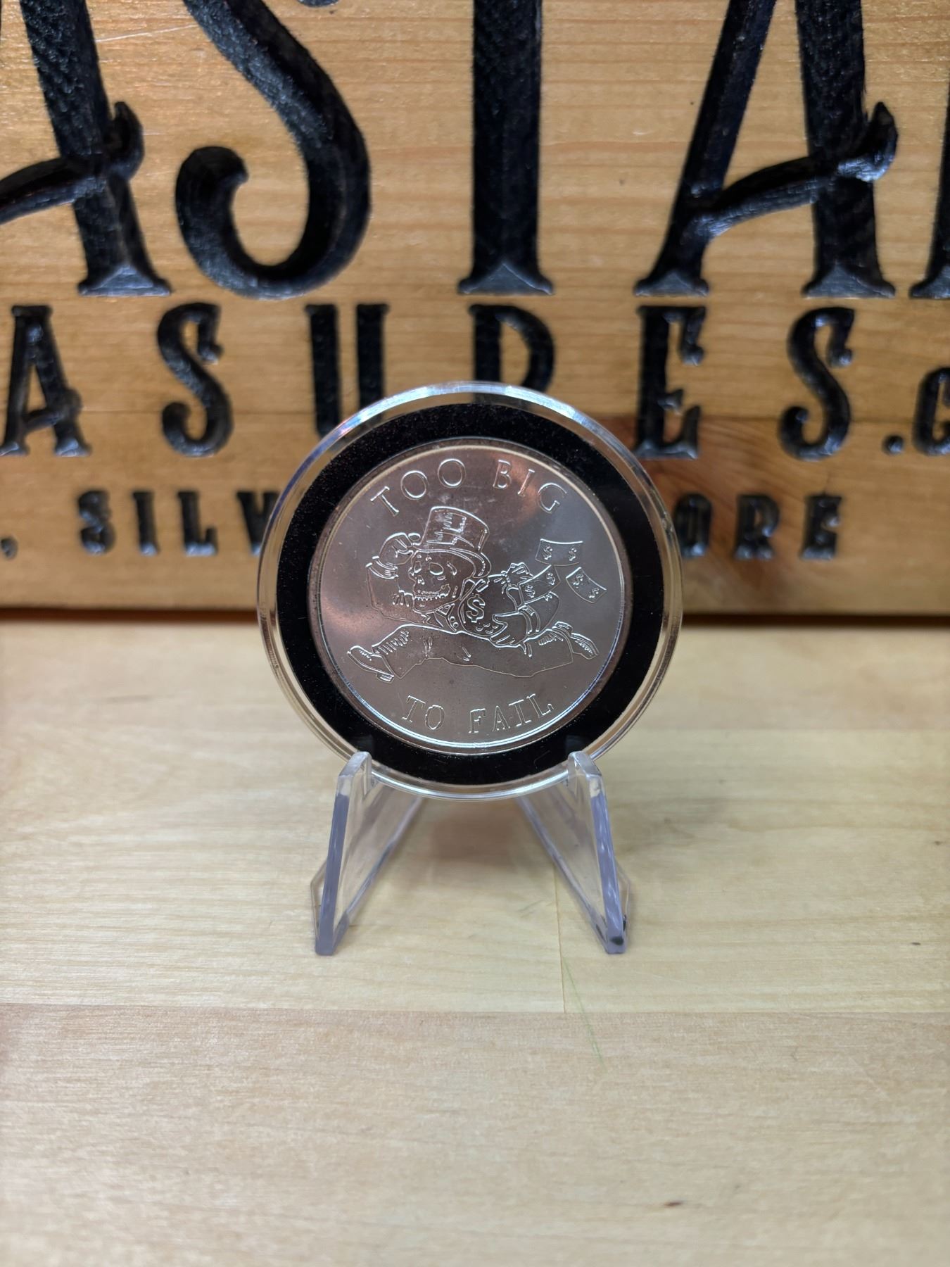 The 1 oz Too Big to Fail Silver Round (2014) is a .999 fine silver round weighing 1 ounce (31.1 grams). This round features the phrase "Too Big to Fail" along with images symbolizing large financial institutions and the global financial crisis. It was released as a satirical commentary on the 2008 financial crash and the idea that certain institutions were too large to be allowed to fail. The round is popular among collectors and investors due to its historical relevance and silver content. Like other silver rounds, it has no face value but is valued based on its silver purity and collectible appeal.