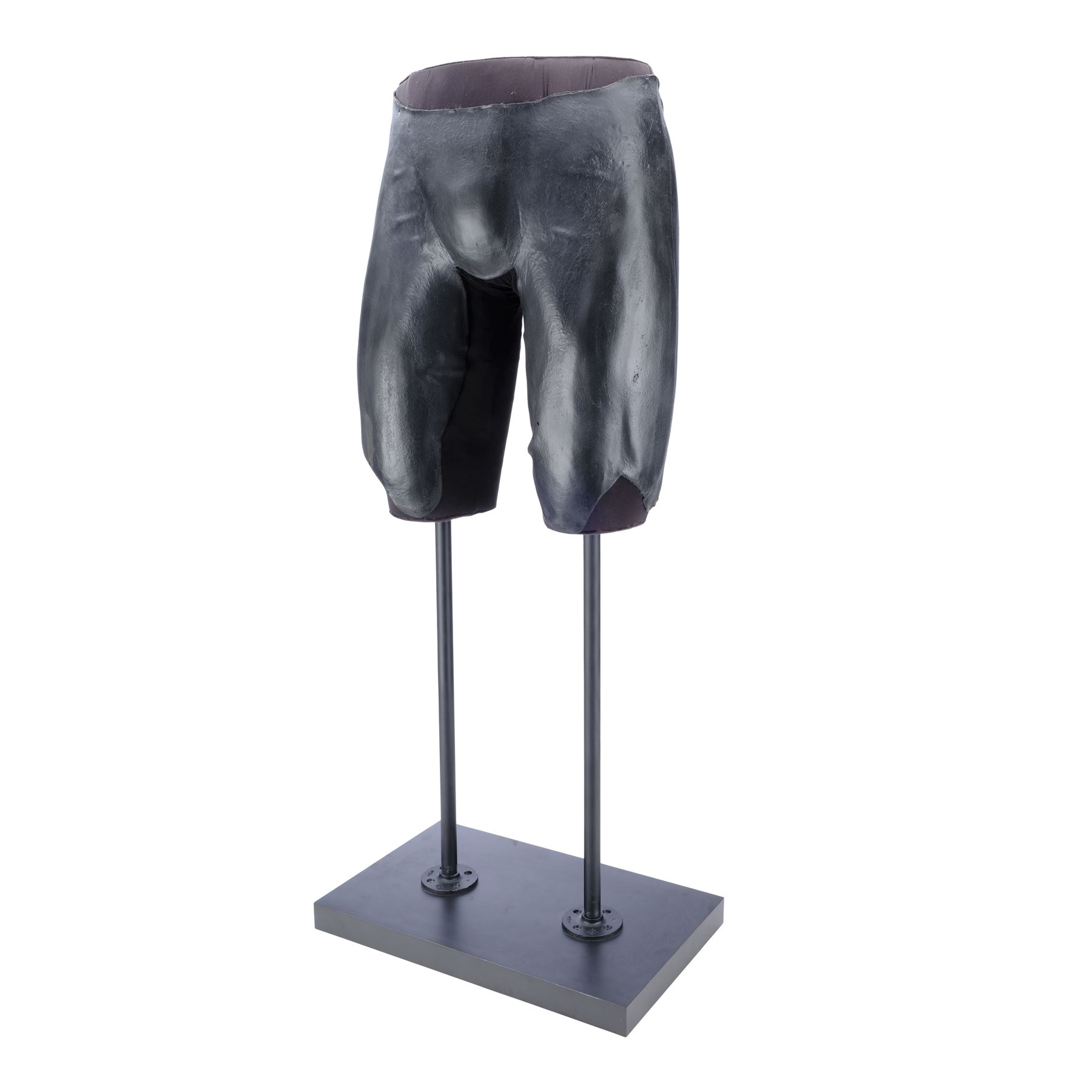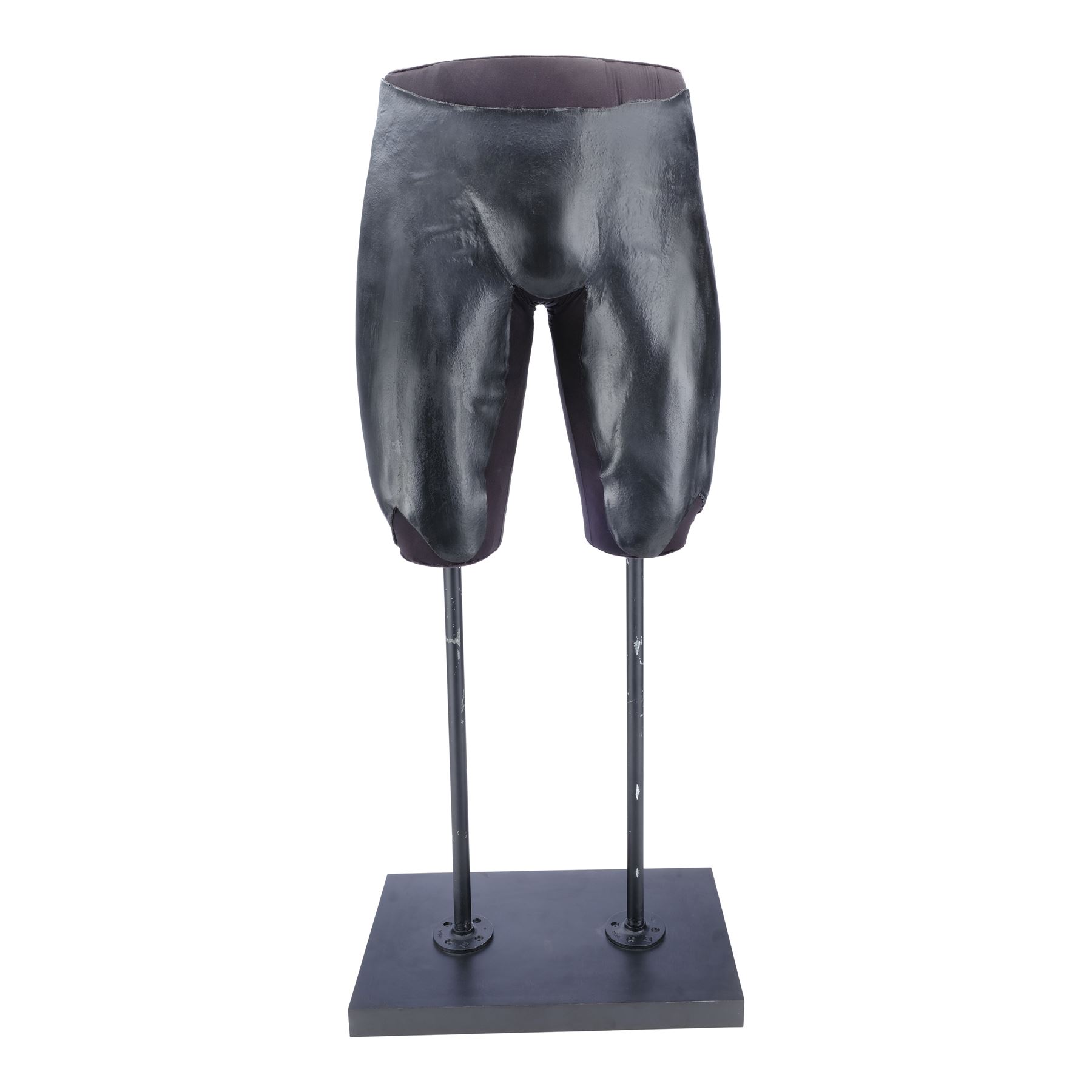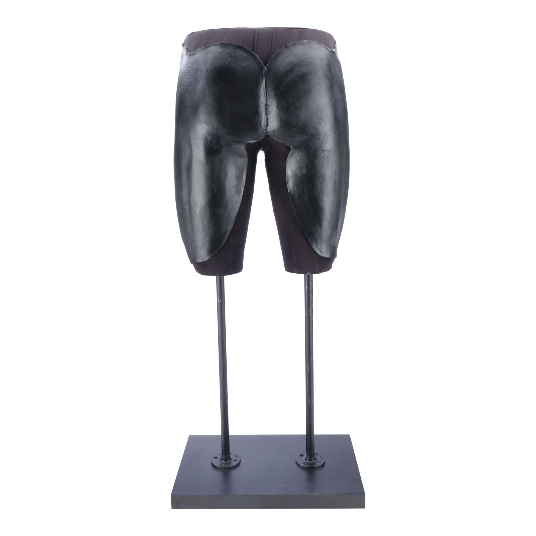 This lot consists of black foam latex front and back upper leg armour, made for production but ultimately unused, that have been mounted to a mannequin section attached by two black metal poles to a black wooden base. They exhibit some signs of age, including denting in the foam and wear along the edges, and the display exhibits paint wear. Dimensions: (displayed) 66.25 cm x 51 cm x 45.75 cm (26" x 20" x 18")