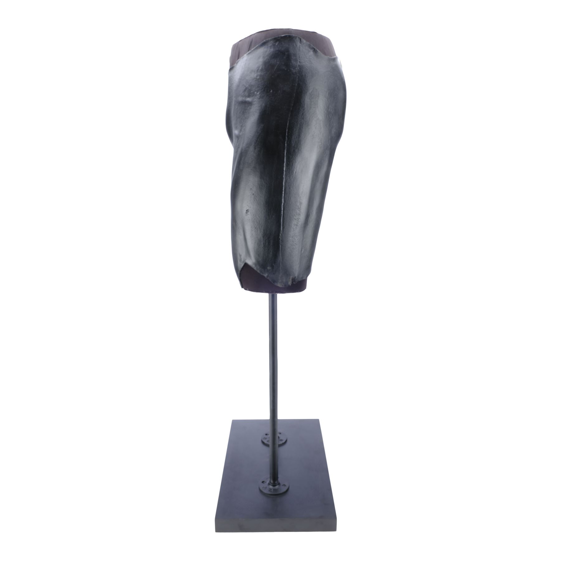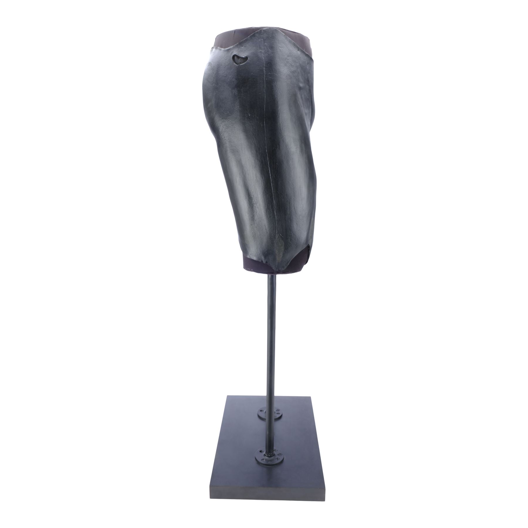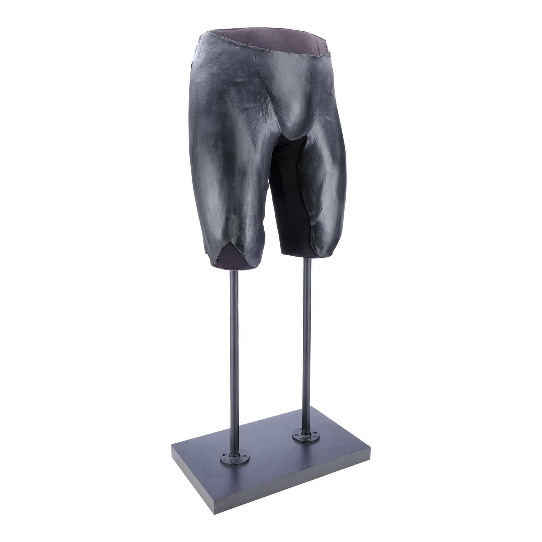 This lot consists of black foam latex front and back upper leg armour, made for production but ultimately unused, that have been mounted to a mannequin section attached by two black metal poles to a black wooden base. They exhibit some signs of age, including denting in the foam and wear along the edges, and the display exhibits paint wear. Dimensions: (displayed) 66.25 cm x 51 cm x 45.75 cm (26" x 20" x 18")