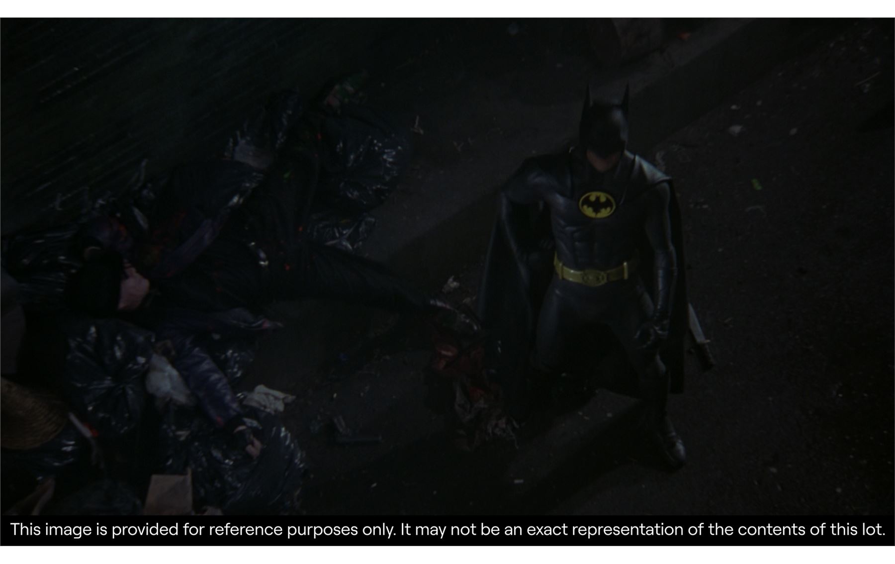 A display of production-made Batman (Michael Keaton) upper leg armour from Tim Burton's Batman. Batman's batsuit featured armour throughout that kept him safe while battling the criminals of Gotham City.