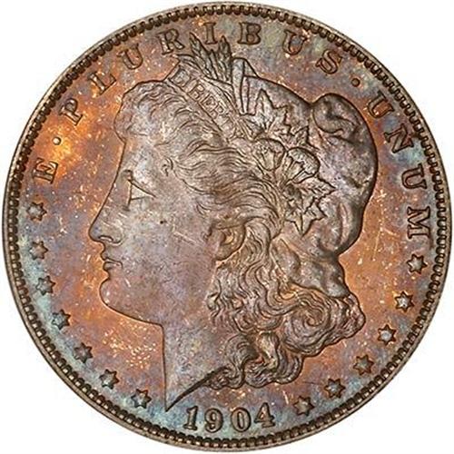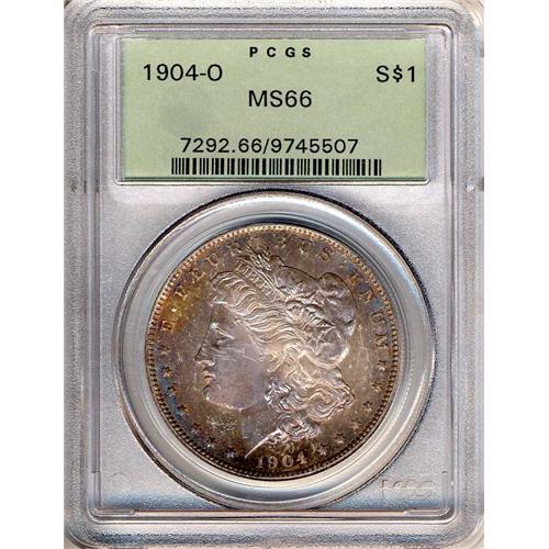 1904-O Morgan Dollar. "'Tis sweet," says Lord Byron, "to hear the watch-dog's honest bark." 'Tis even sweeter to contemplate owning such a resplendent MS66-graded coin whose "honest bark" is like music to the ear of the trained collector of well made, carefully preserved and graded silver dollars with resplendent toning. (#7292)