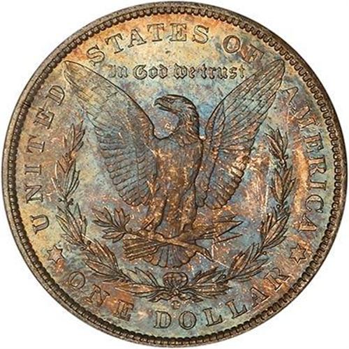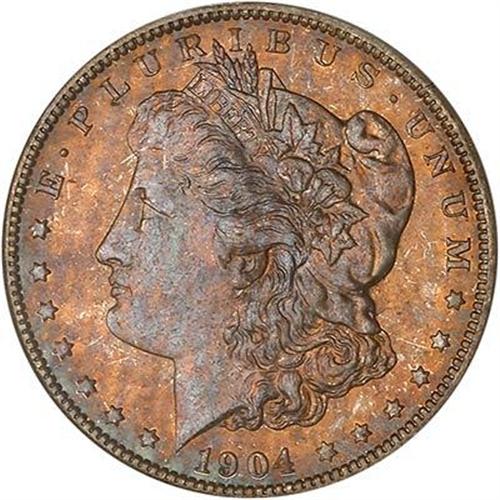 1904-O Morgan Dollar. Deeply toned and impressive, a two-sided gem whose colors combine the best elements of antique-silver patina. (#7292)