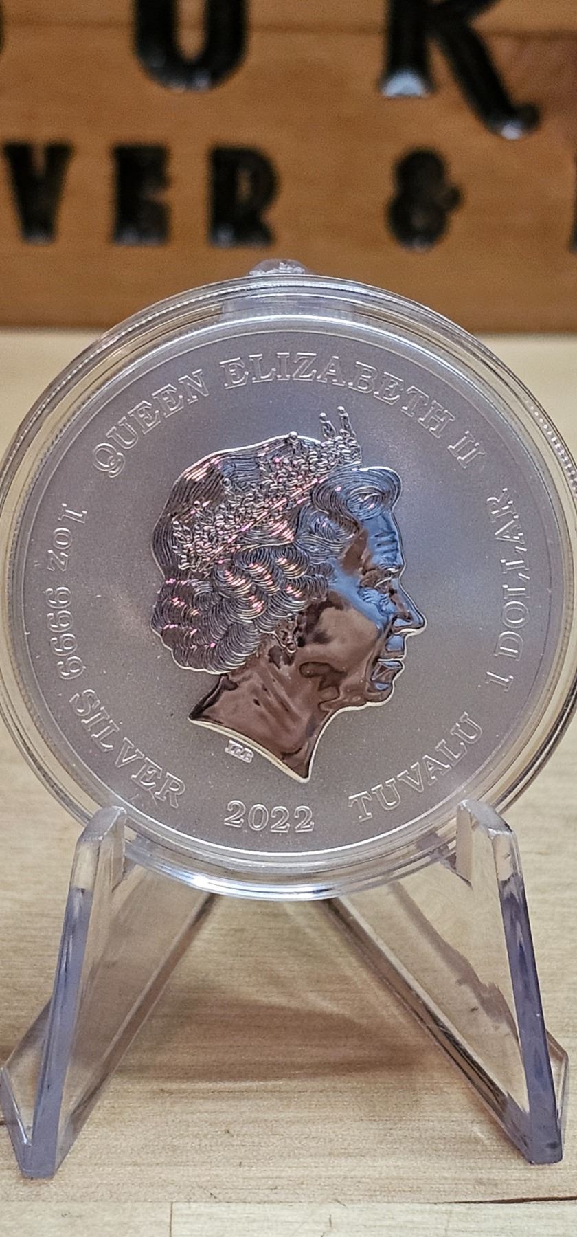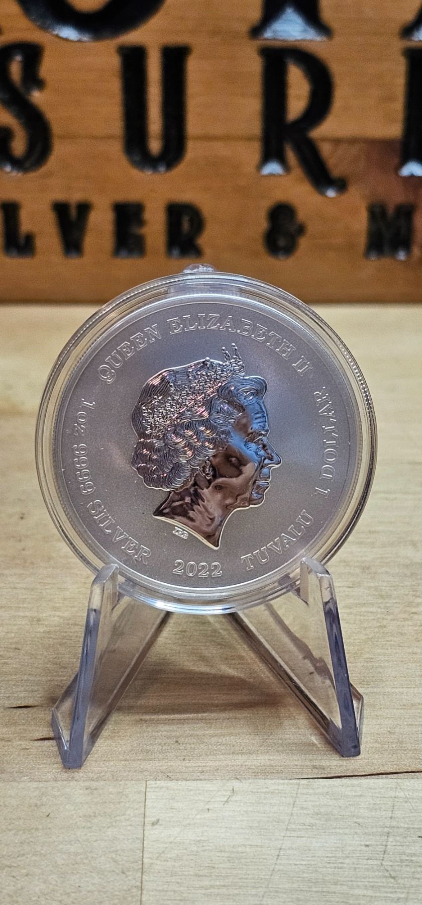 The 1 oz Phantom Tuvalu silver round features a captivating design that embodies mystery and elegance, often inspired by ghostly or phantom motifs. Struck from 99.9% pure silver, this round showcases intricate details that highlight its unique theme. With its limited mintage and artistic appeal, it attracts both collectors and investors. The Phantom Tuvalu silver round is a striking addition to any silver collection, blending artistry with the intrinsic value of silver.
