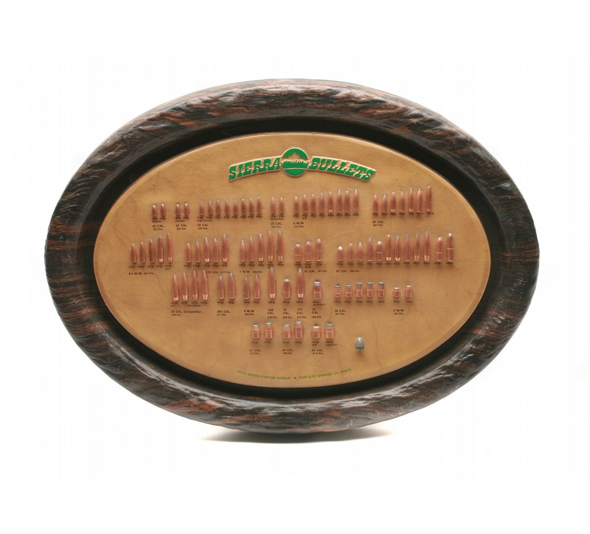 Oval faux wood frame Sierra Bullets board display - features bullets from .22 caliber to .45 caliber - 85 bullets in total - ready to hang - 23" diameter - non-ffl - 25VVFKIL031