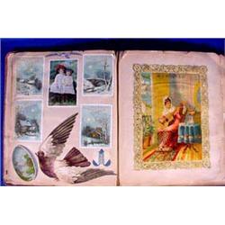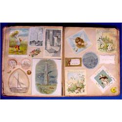 Victorian Trade Card and Scrap Book. Album has many trade cards depicting children, travels and historical views. Also there are many scraps of German die cuts. The tail end of the album features paper from Montpelier, Vermont. Much of the paper has damage, but a nice original scrap book. Ca. 1900. 14.75"x12". Est. $100 - $200.