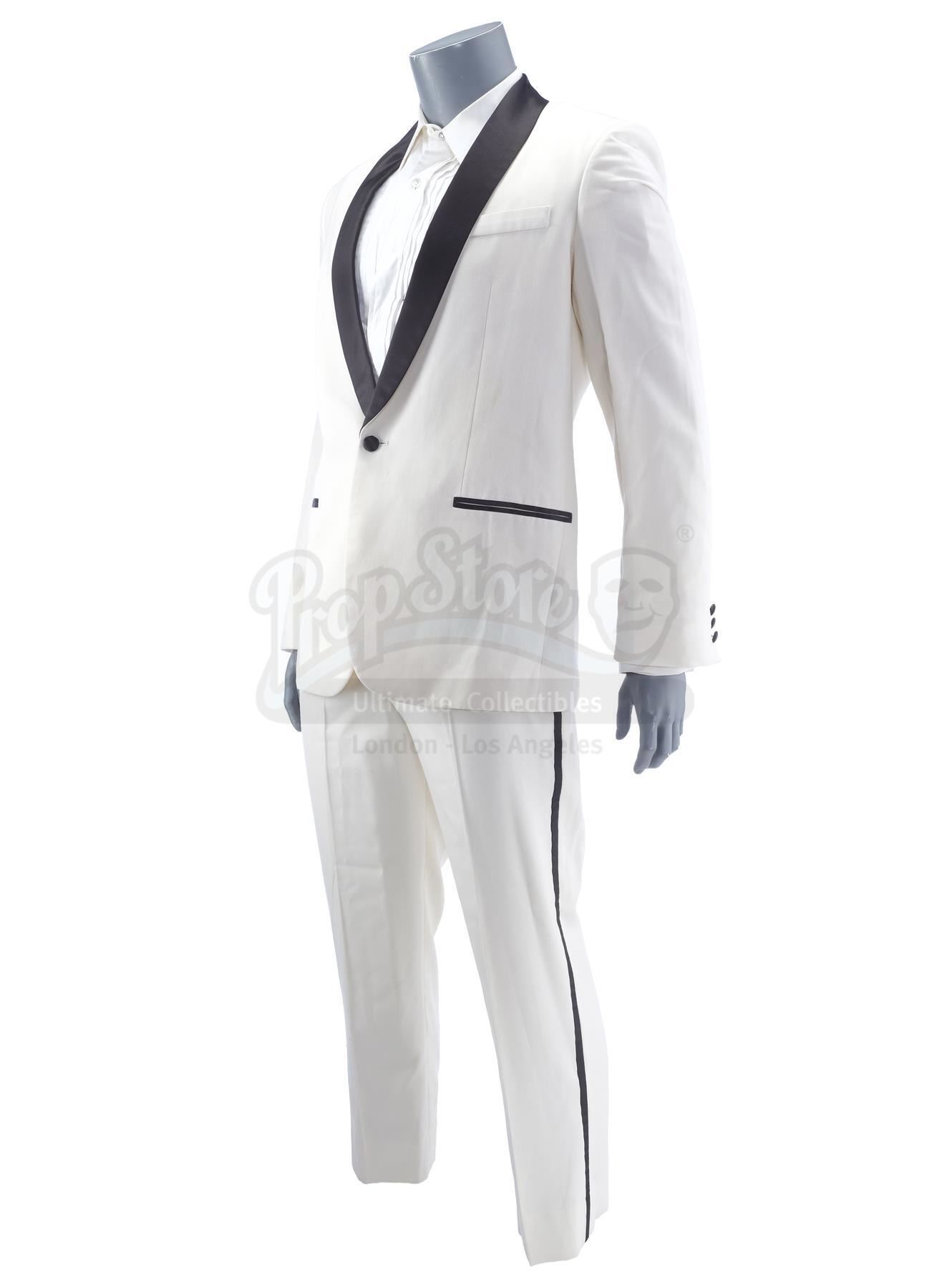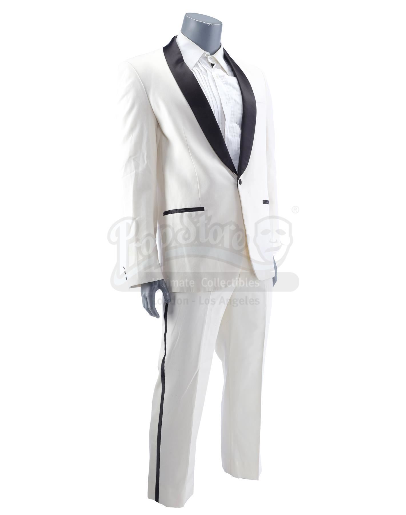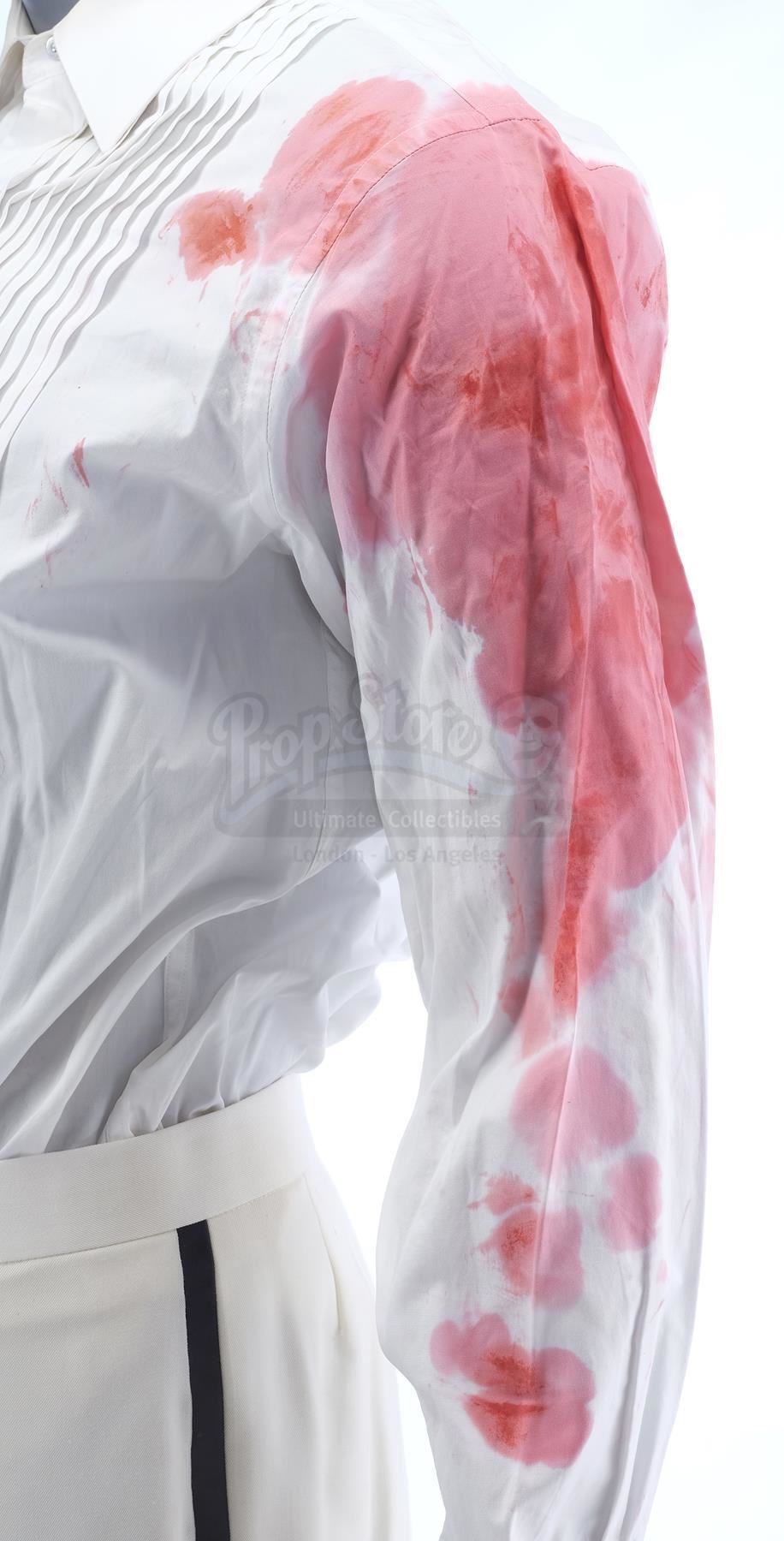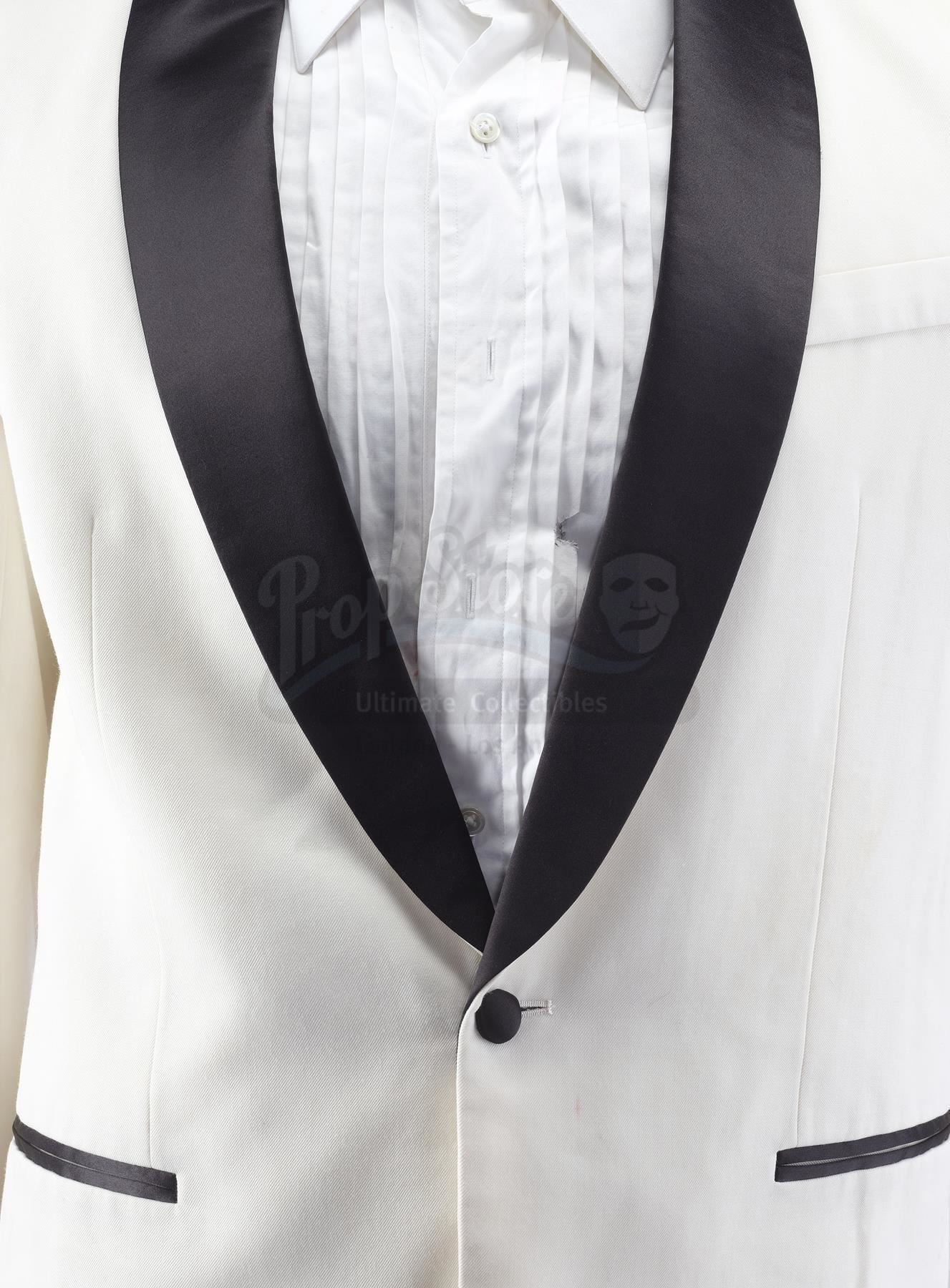 This lot will be auctioned on Wednesday, June 30th. The auction will begin at 9:00am PDT and lots are sold sequentially via live auctioneer; tune in to the live streaming broadcast on auction day to follow the pace. Note other lots in the auction may close on June 29th or July 1st. Jenko's (Channing Tatum) bloodied tuxedo from Phil Lord and Christopher Miller's action comedy 21 Jump Street. Jenko and his partner Schmidt (Jonah Hill) wore matching tuxedos when they went undercover at the Sagan Hill School prom. This costume consists of a white silk-lined wool slim-fit tuxedo jacket (size 16 1/2 - 35) marked "J" with black trim and black fabric-covered buttons, matching tapered pants, and a blood-stained white cotton ruffled dress shirt with bullet holes. It is in good overall condition with some signs of wear from production, including light staining throughout and fraying to the pant hems. Estimate: $800 - 1,200