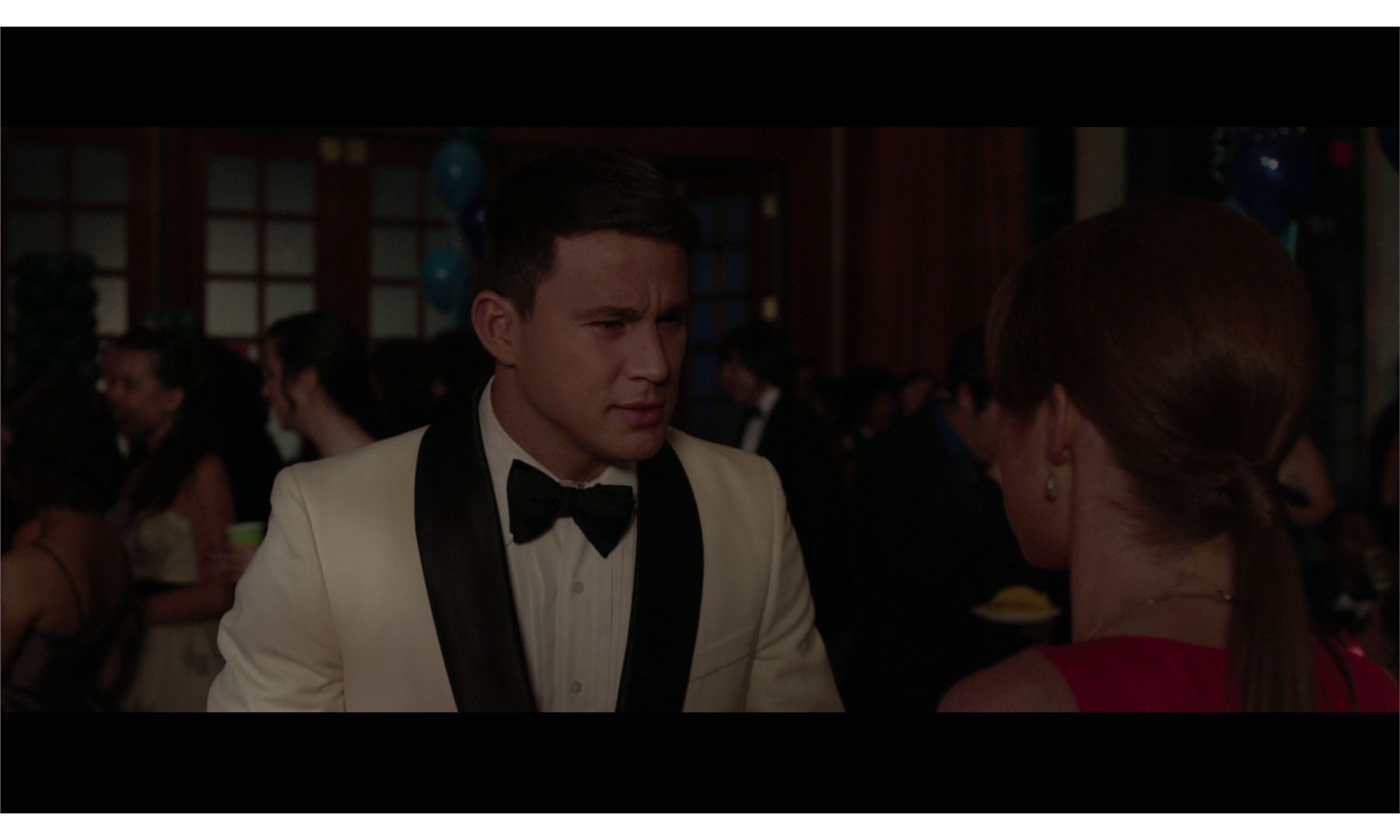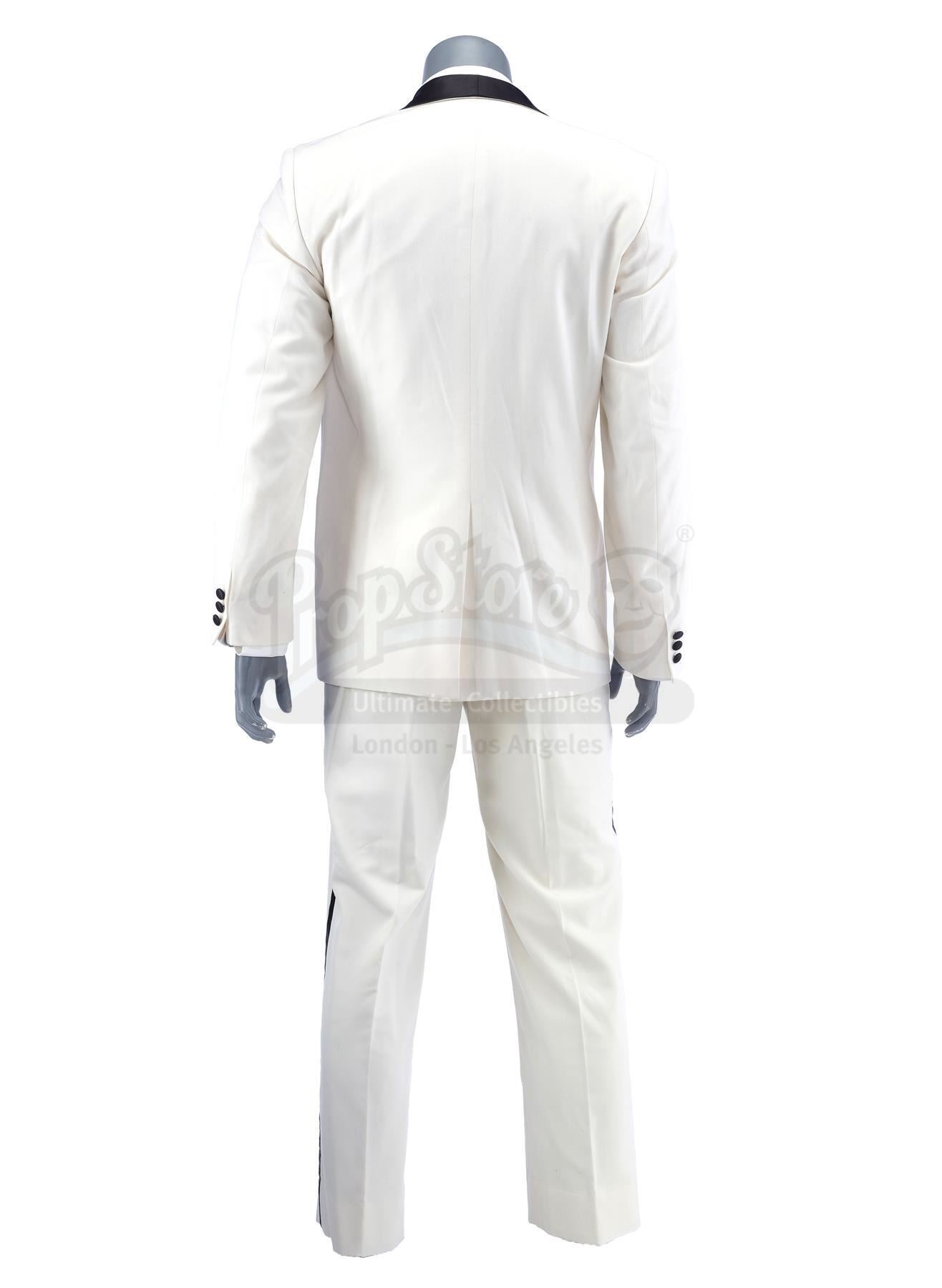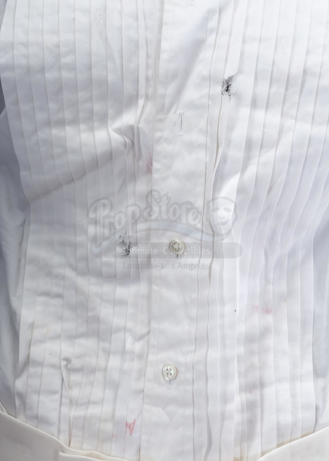 This lot will be auctioned on Wednesday, June 30th. The auction will begin at 9:00am PDT and lots are sold sequentially via live auctioneer; tune in to the live streaming broadcast on auction day to follow the pace. Note other lots in the auction may close on June 29th or July 1st. Jenko's (Channing Tatum) bloodied tuxedo from Phil Lord and Christopher Miller's action comedy 21 Jump Street. Jenko and his partner Schmidt (Jonah Hill) wore matching tuxedos when they went undercover at the Sagan Hill School prom. This costume consists of a white silk-lined wool slim-fit tuxedo jacket (size 16 1/2 - 35) marked "J" with black trim and black fabric-covered buttons, matching tapered pants, and a blood-stained white cotton ruffled dress shirt with bullet holes. It is in good overall condition with some signs of wear from production, including light staining throughout and fraying to the pant hems. Estimate: $800 - 1,200