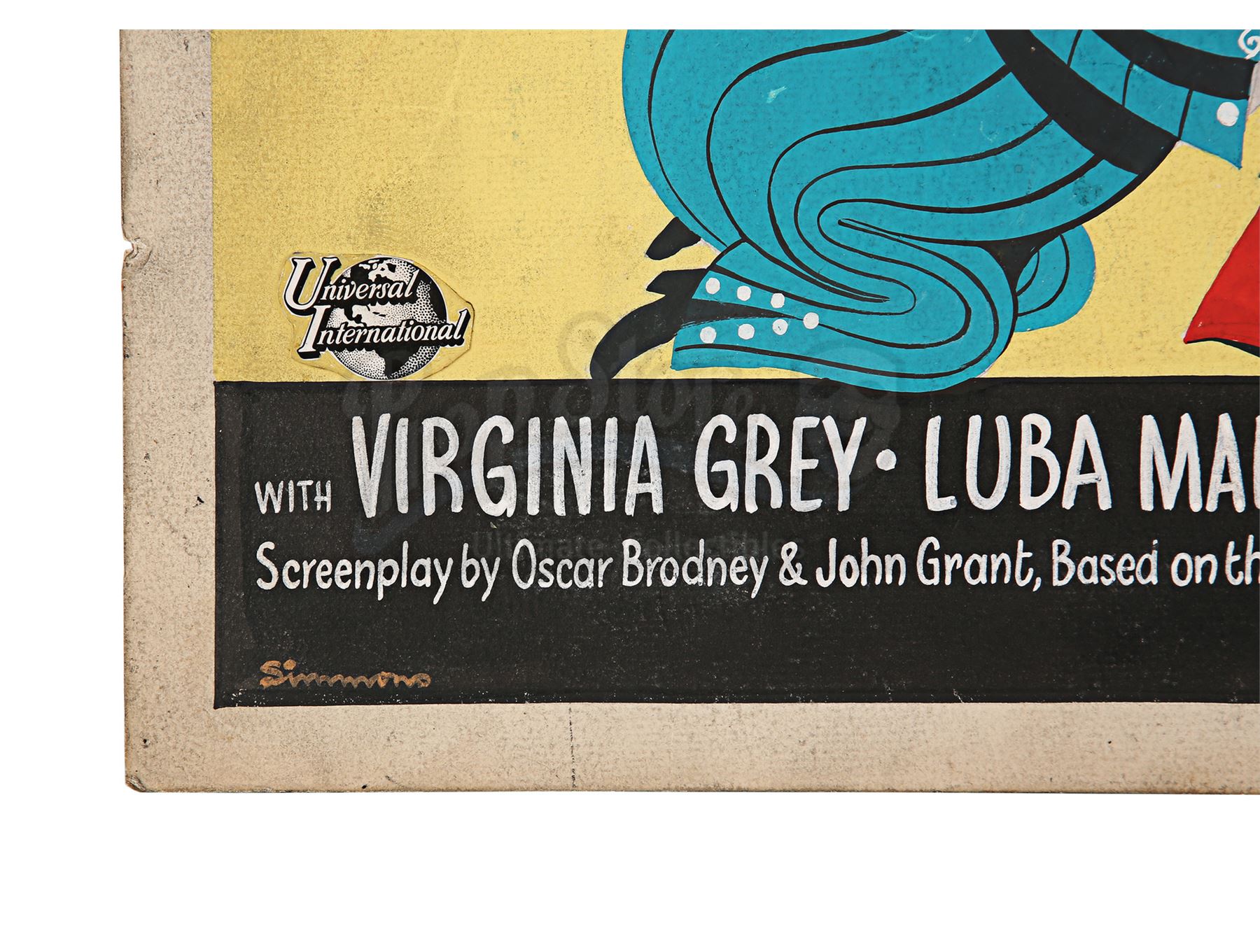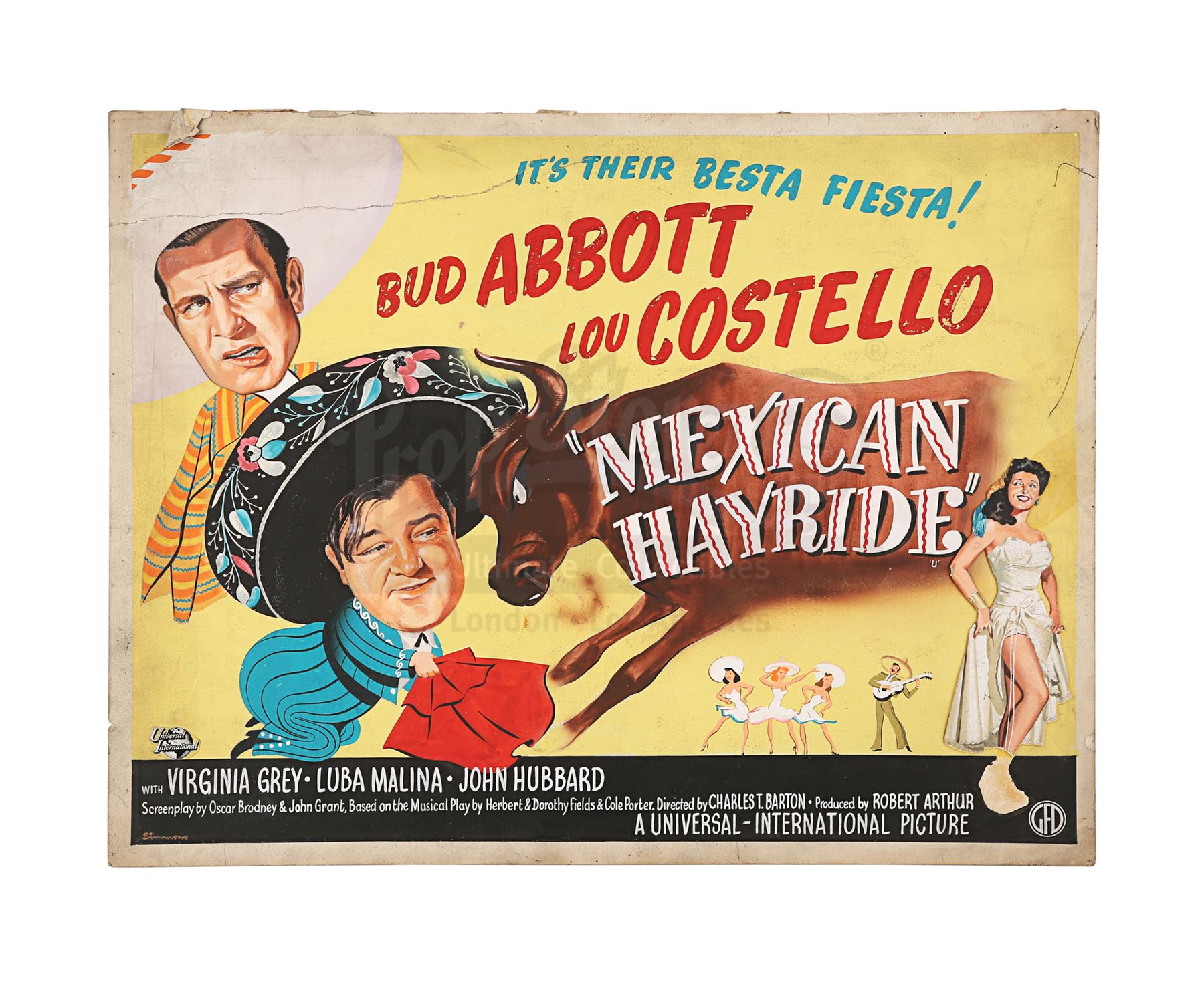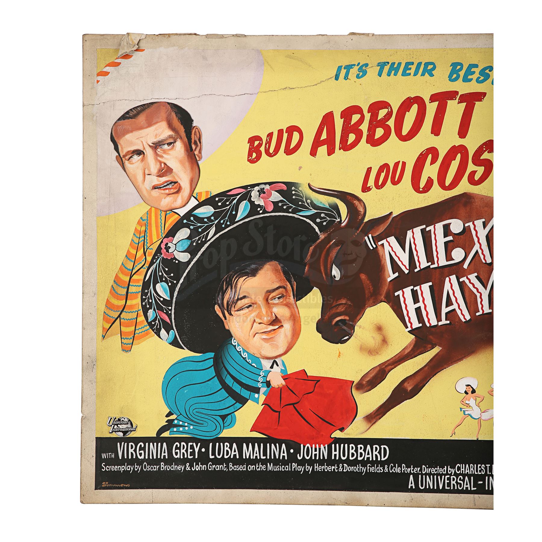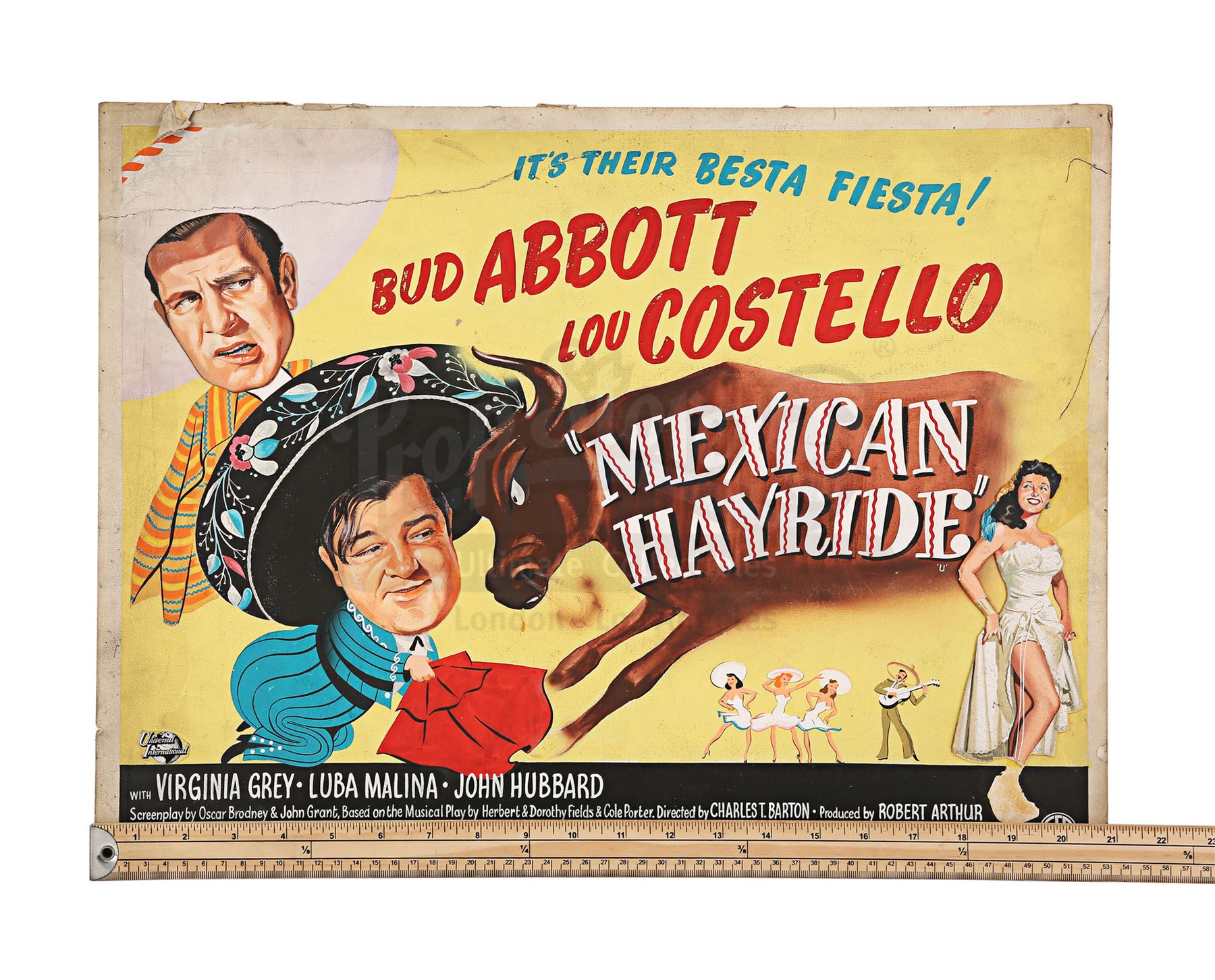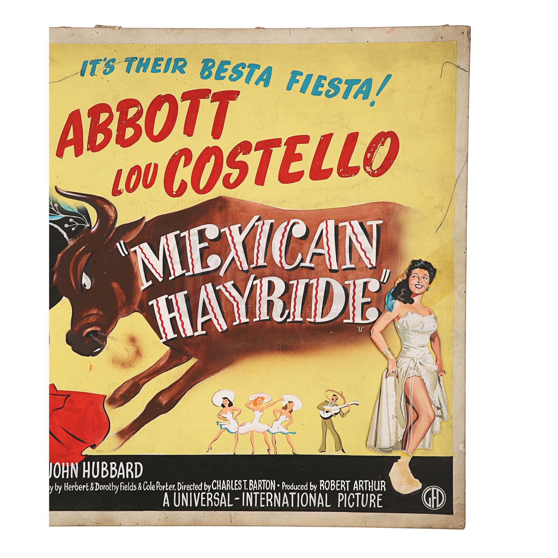 This lot will be auctioned on Wednesday, June 30th. The auction will begin at 9:00am PDT and lots are sold sequentially via live auctioneer; tune in to the live streaming broadcast on auction day to follow the pace. Note other lots in the auction may close on June 29th or July 1st. A hand-painted poster concept illustration from the promotion of Charles Barton's 1948 comedy Mexican Hayride. Originally from the collection of W.E. Berry, this illustration was used by printers to produce the U.K. Quad poster. The artwork is painted on board, with high-quality main character's faces, Dagmar (Luba Malina), and the Universal-International logo pasted onto the painting. The lot remains in overall fair overall condition and is torn in one corner. Dagmar's feet are missing, and parts of the pasted elements have begun to peel away. Dimensions: 15.75" x 20.75" (40 cm x 53 cm) Sold without copyright; see copyright notice in the Buyer's Guide. Estimate: $1,000 - 1,500