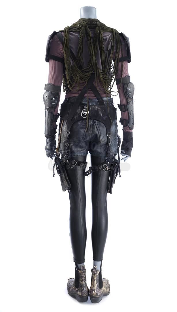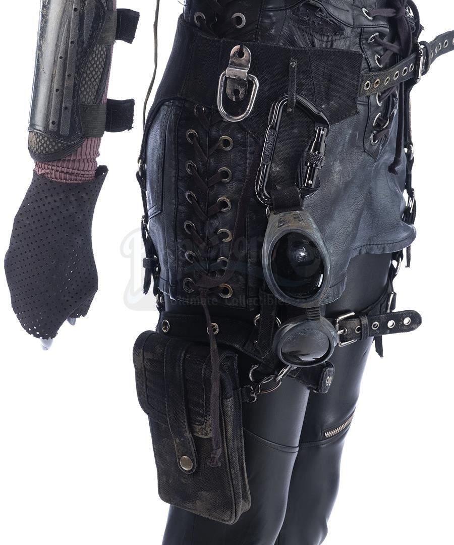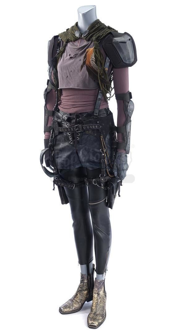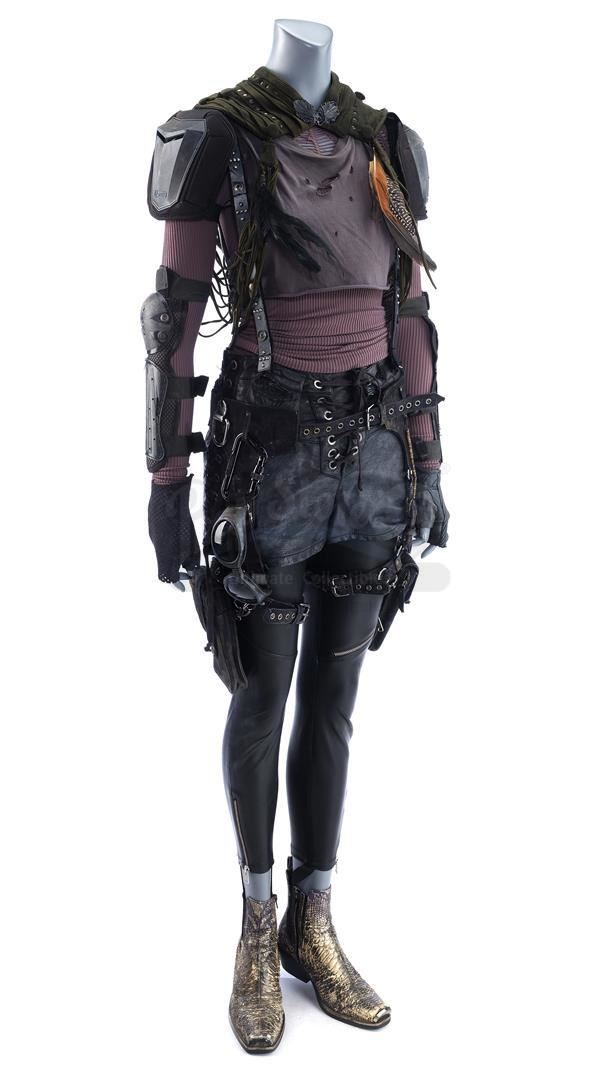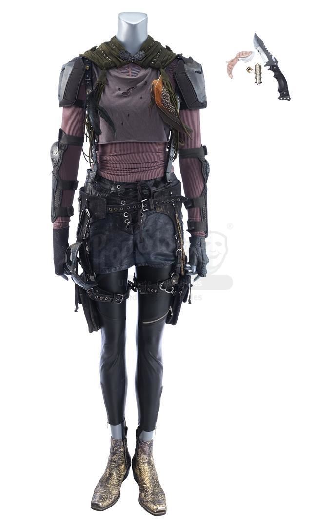 Snowflake's costume with a backpack, leaf knife and dagger from Season 6 of Marvel's Agents of S.H.I.E.L.D. Alien mercenary Snowflake wears her costume and uses an array of bladed weapons throughout the season as she hunts the Shrike under the command of Sarge. This lot consists of a metal stud earring inset with a faux gem; an olive and black cotton and nylon neck and shoulder protector with a metal clasp, tassels, looped underarms, and feather; a dark purple ribbed polyester blend shirt; a gray cotton tank top; a pair of black and brown nylon and cotton elbow pads with fastening strips; a black leather fingerless glove; a black leather fingerless mesh glove; three gold-colored metal earrings; a pair of black leather stunt shorts with lace-up sides; a pair of black canvas stunt garters affixed with a pair of black canvas pouches, brown beaded accents, and a black metal carabiner with a pair of black urethane and foam rubber goggles with blacked-out lenses; a pair of black leatherette pants with stirrups and metal zippers; a pair of black and beige snakeskin, rubber, and metal boots; a black and metal-colored rubber and resin knife; and a rose gold-colored rubber knife. It is in excellent overall condition with some minor wear on all items including scuffing on the boots, deliberately-added holes and adhesive remnants on the tank top and some paint chipping on the black knife.