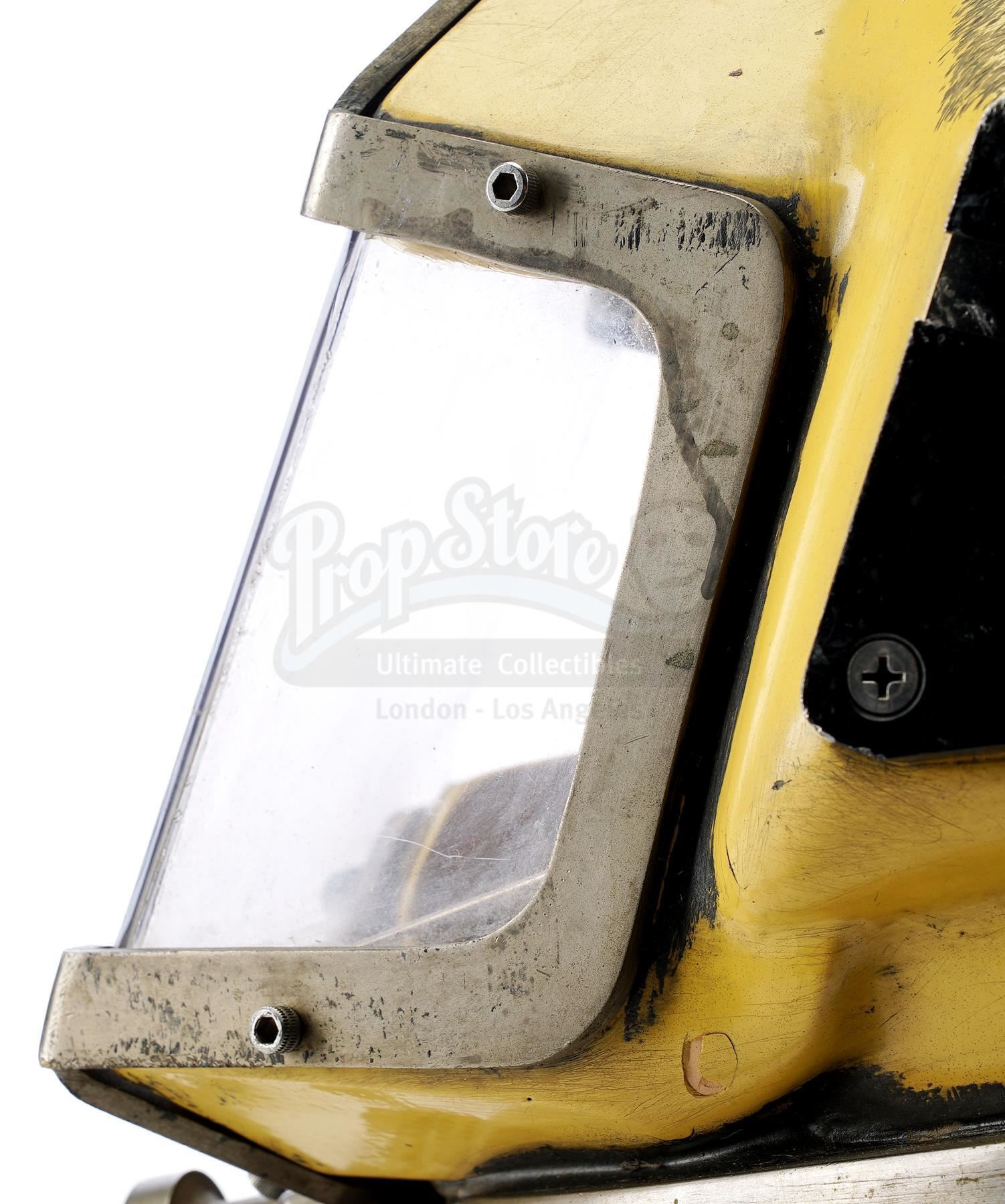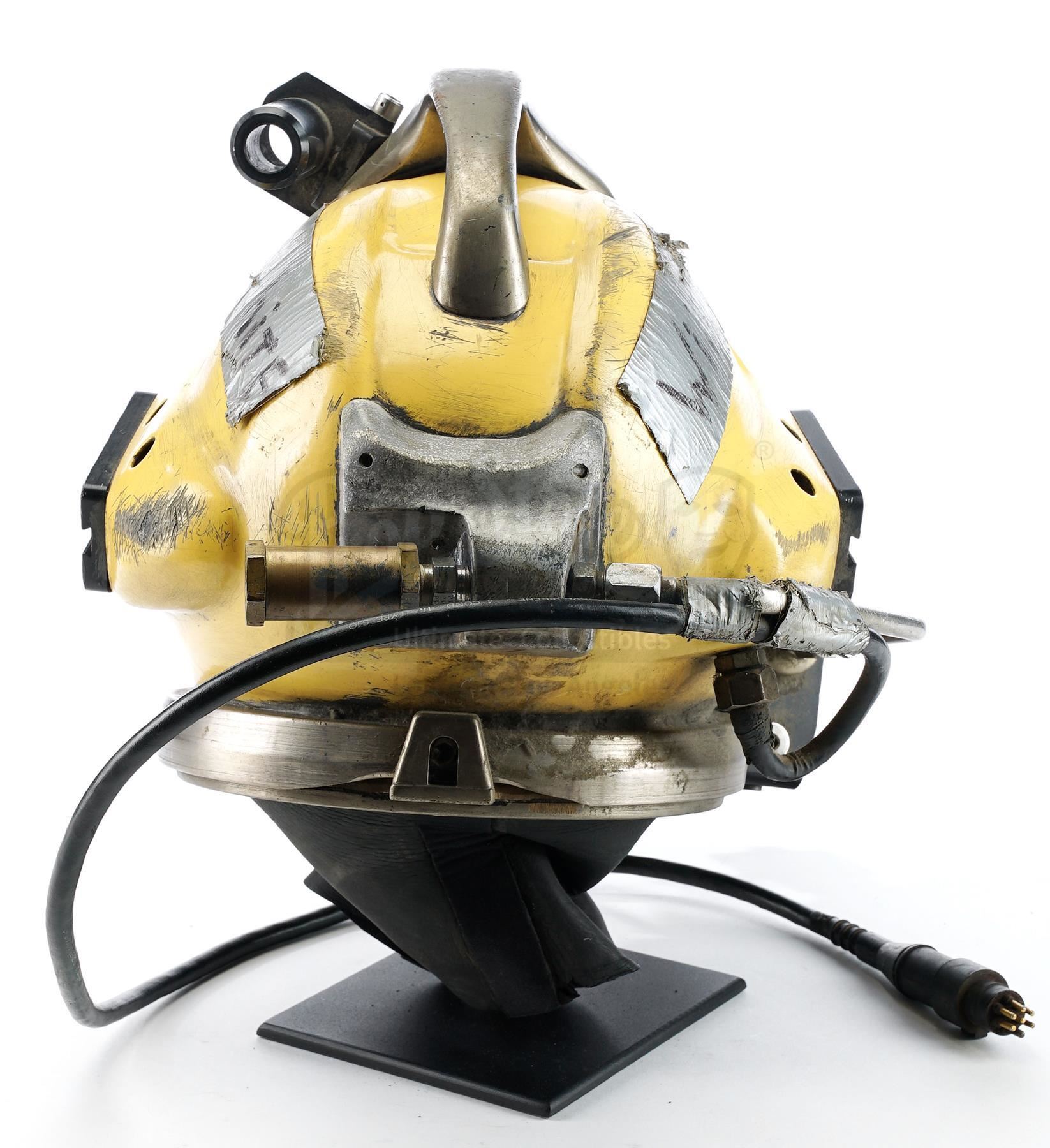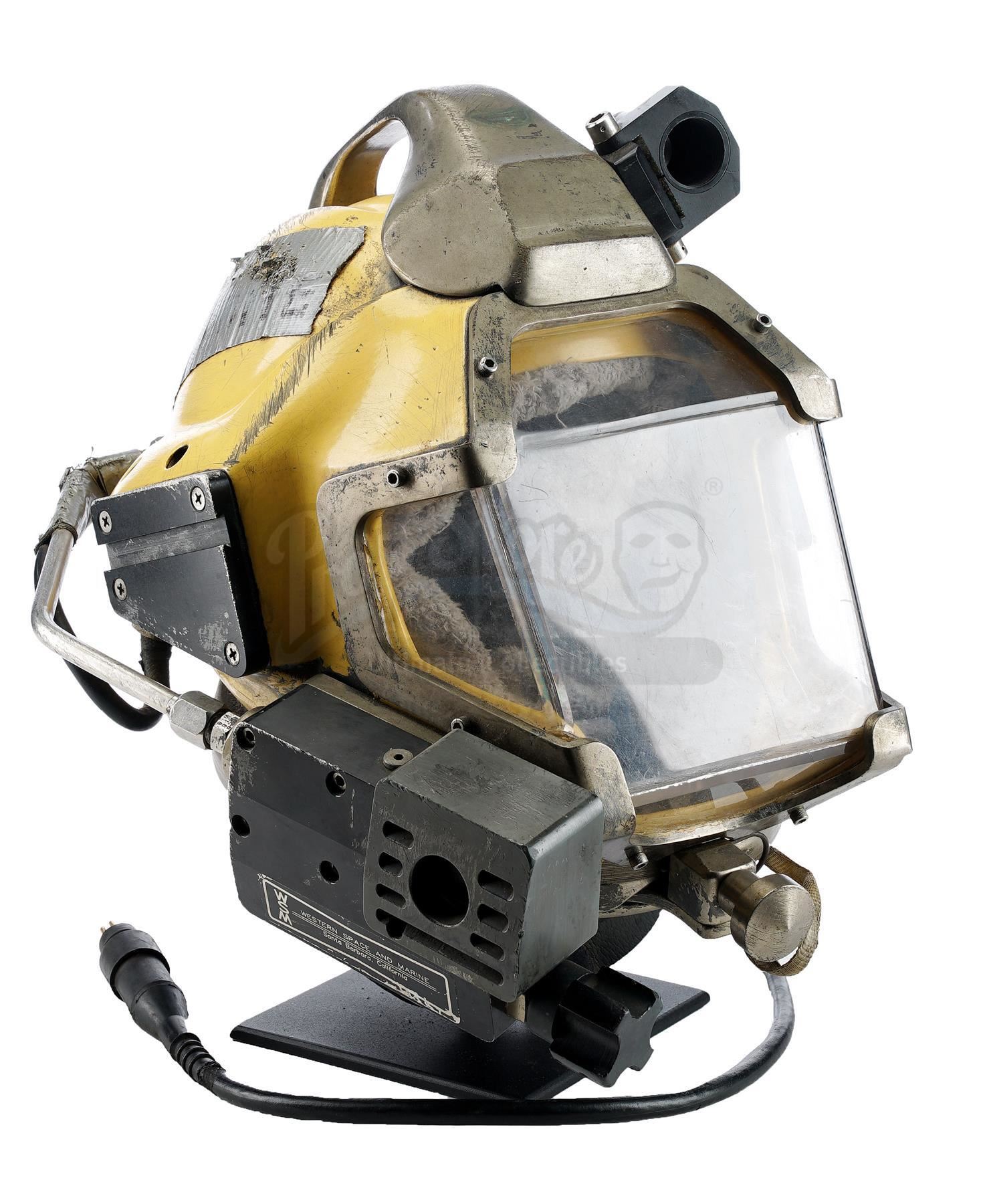 This lot will be auctioned on Wednesday, June 30th. The auction will begin at 9:00am PDT and lots are sold sequentially via live auctioneer; tune in to the live streaming broadcast on auction day to follow the pace. Note other lots in the auction may close on June 29th or July 1st. A diving helmet from James Cameron's sci-fi adventure The Abyss. When a NAVY submarine crashed in a deep underwater trench, Virgil Brigman (Ed Harris),Lt. Coffey (Michael Biehn) and their teams rescued survivors. Specially designed by Western Space and Marine, the custom helmet features a yellow metal deep sea diving helmet shell with rubber hoses, electrical metal tubes and a clear plastic face guard and aluminum handle at the top. The bottom rim has a black rubber gasket and the interior is padded with foam and covered in white terry cloth. It exhibits signs of wear from age and use, including paint chipping and rust, but remains in good overall condition. Dimensions: 18" x 11" x 12" (45.75 cm x 28 cm x 30.5 cm) Contains electronic components; see notice in the Buyer's Guide. Estimate: $2,000 - 3,000