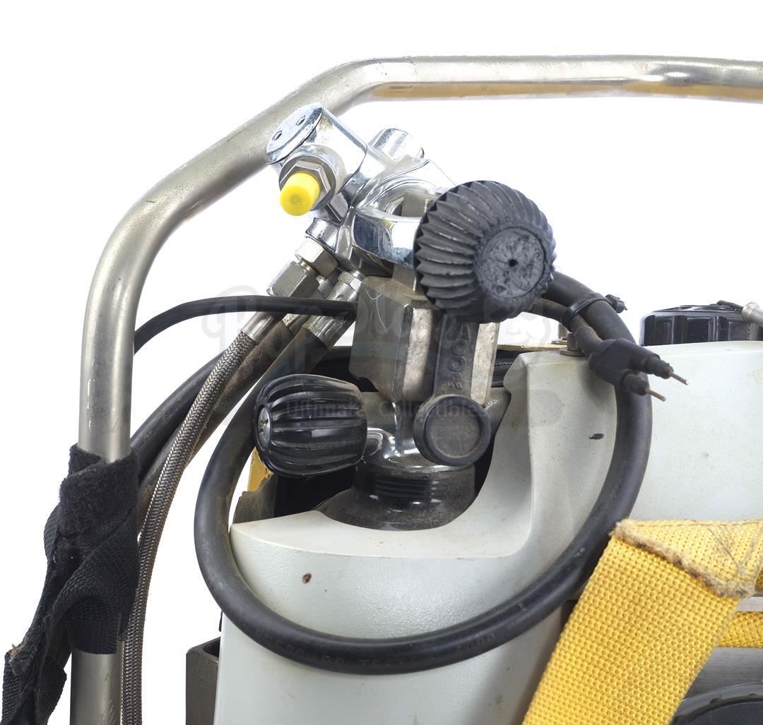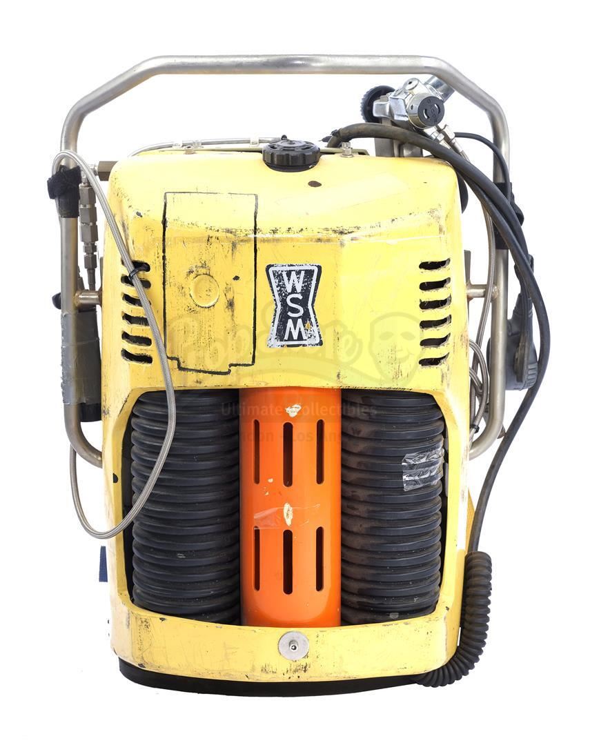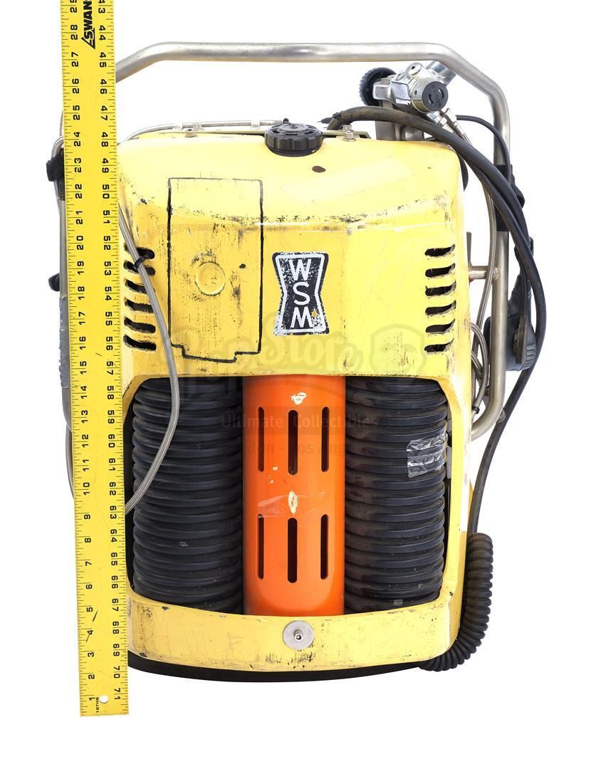 This lot will be auctioned on Wednesday, June 30th. The auction will begin at 9:00am PDT and lots are sold sequentially via live auctioneer; tune in to the live streaming broadcast on auction day to follow the pace. Note other lots in the auction may close on June 29th or July 1st.  A diving backpack from James Cameron's sci-fi adventure The Abyss. When a Navy submarine crashed underwater, oil drillers led by Virgil Brigman (Ed Harris) teamed with military personnel led by Lt. Coffey (Michael Biehn) to rescue survivors.  Specially designed by Western Space and Marine, these custom diving backpacks can be refilled while underwater, allowing the cast to be submerged longer. It features a yellow metal deep sea diving shell with a pair of black tank holders, rubber hoses, electrical metal tubes and yellow and blue nylon straps. It exhibits signs of wear from age and use, including paint chipping and rust, but remains in good overall condition. Dimensions: 20" x 12" x 30" (50.75 cm x 30.5 cm x 76.25 cm)  Contains electronic components; see notice in the Buyer's Guide.   Estimate: $1,500 - 2,500
