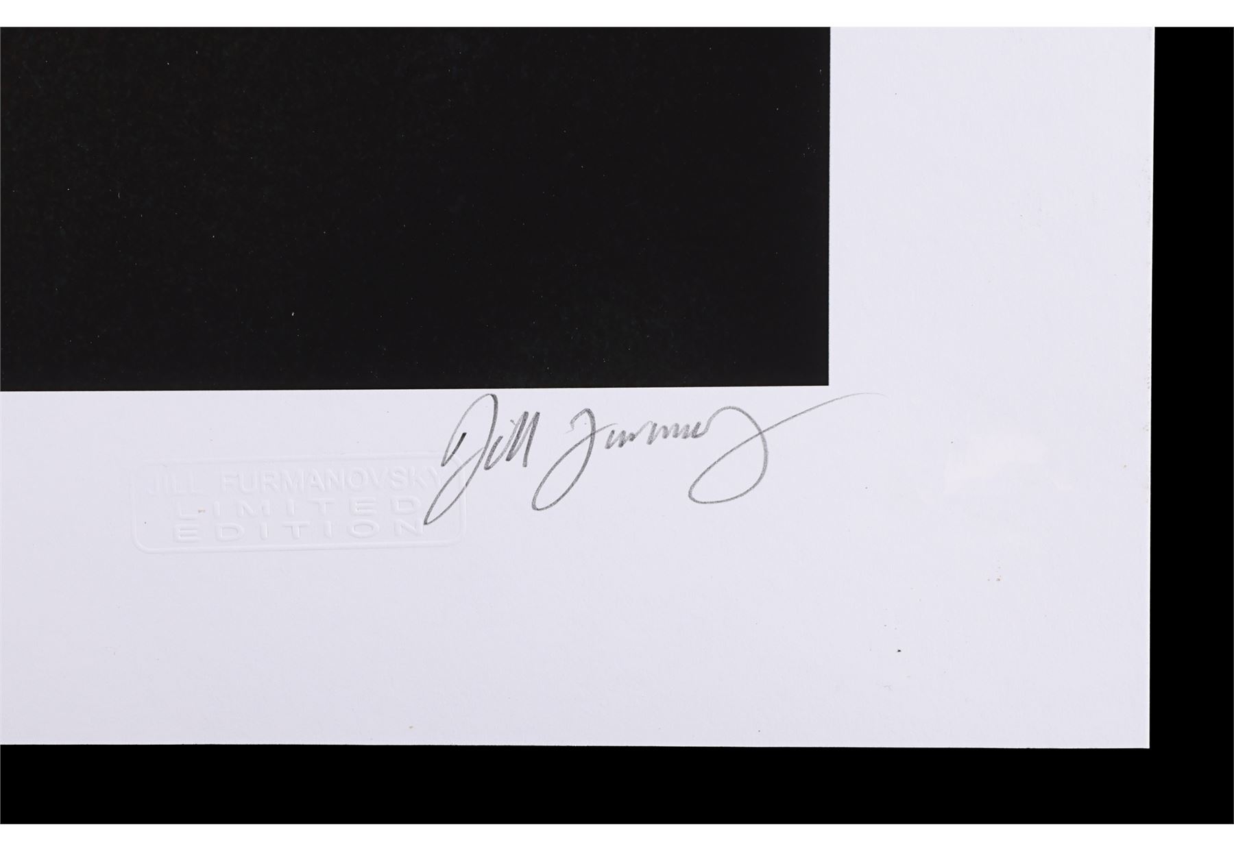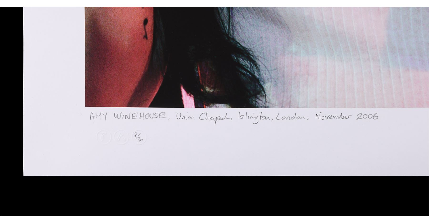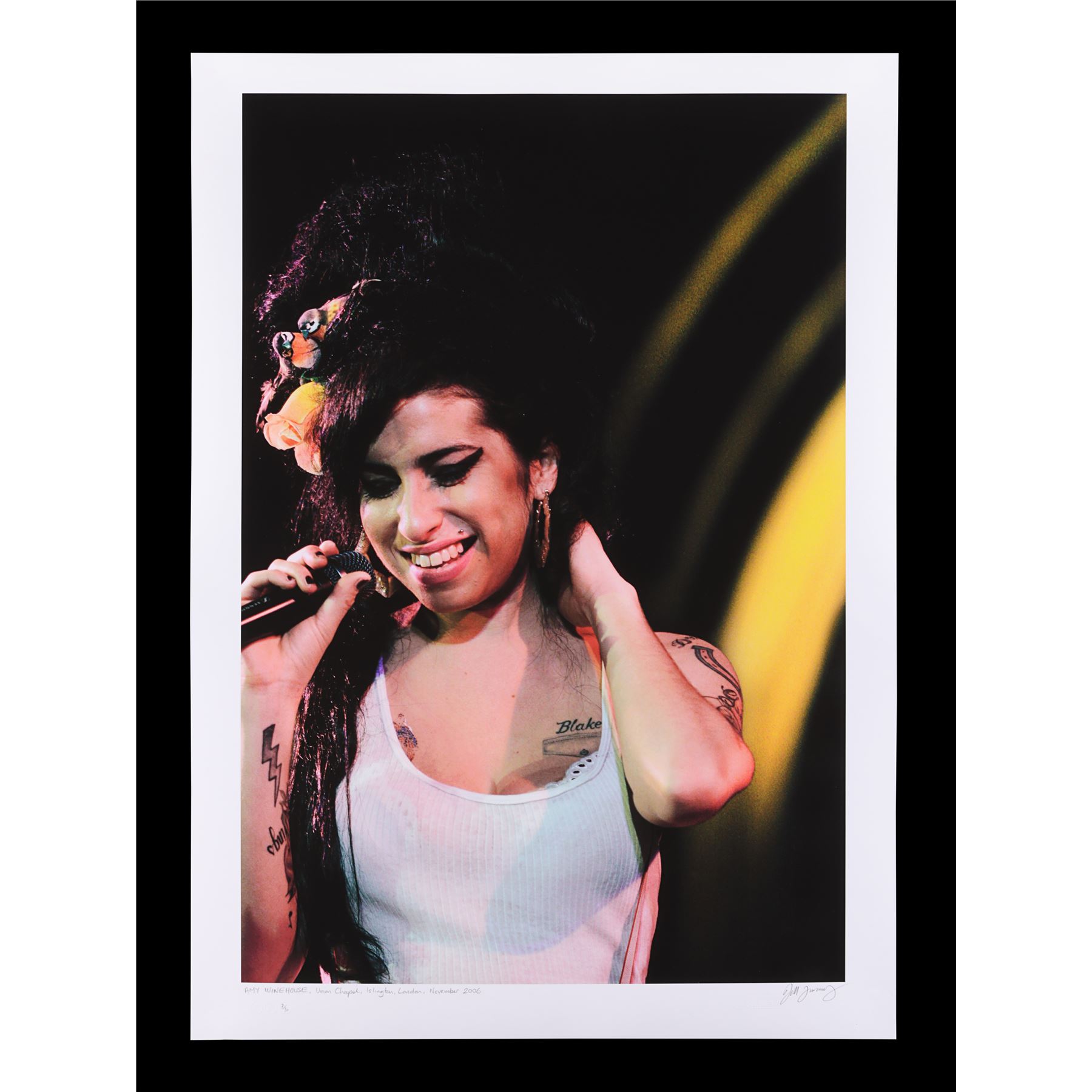 A limited edition photographic print featuring singer-songwriter Amy Winehouse. This mid-performance shot by acclaimed rock photographer Jill Furmanovsky was taken during Winehouse's concert at the Union Chapel in Islington, London, on 24 November 24 2006. This gig was one of a series of charity concerts known as the Little Noise Sessions, whose proceeds were donated to Mencap. The print shows Winehouse smiling as she looks down with a microphone in her hand. It is labelled "Amy Winehouse, Union Chapel, Islington, London, November 2006", hand-numbered "7/30" and signed by Furmanovsky in pencil. Included in the lot is a Rockarchive certificate of authenticity. Dimensions: 86 cm x 61 cm (33 3/4" x 24")
