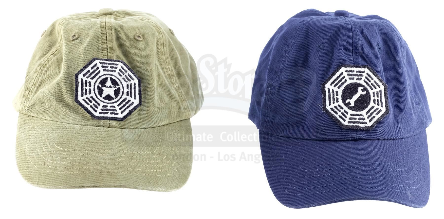 A Dharma Security jumpsuit and Dharma hats from the sci-fi television series Lost. In the episode "The Man Behind the Curtain" (320), Dharma Initiative members wore jumpsuits labeled with their names and professions.