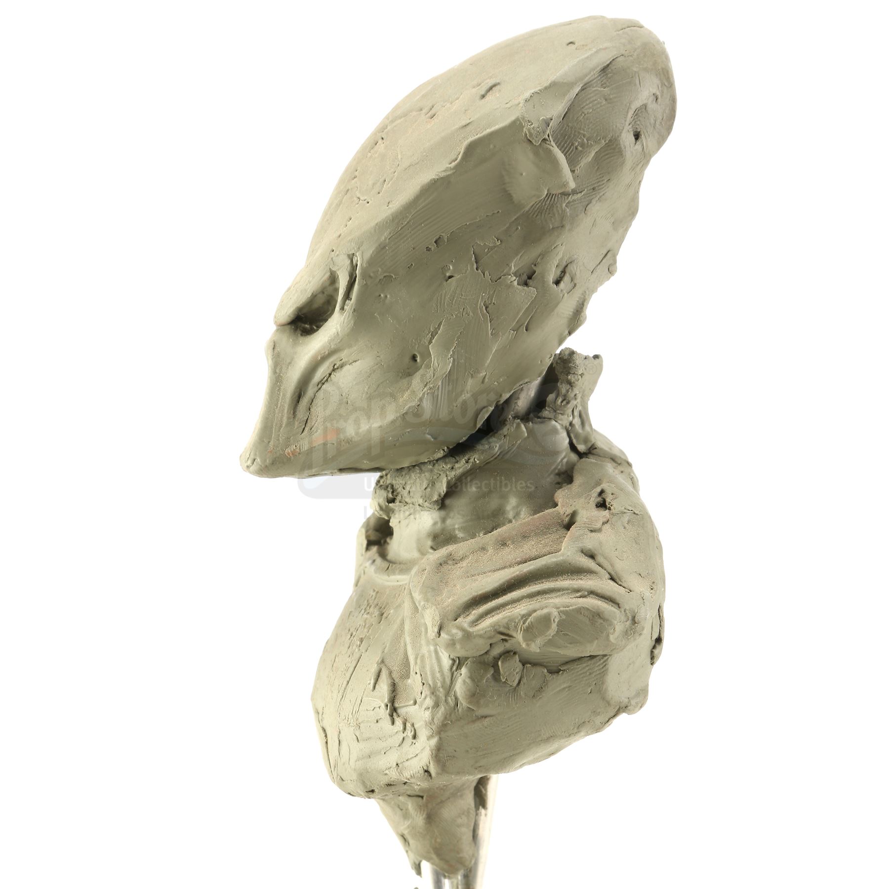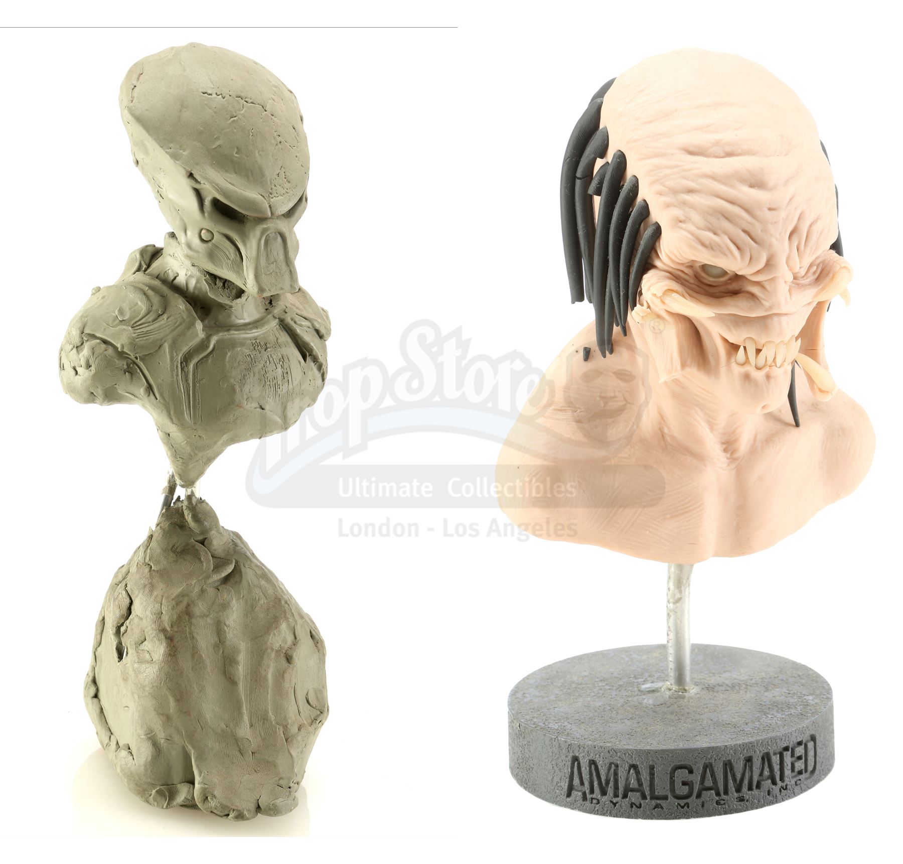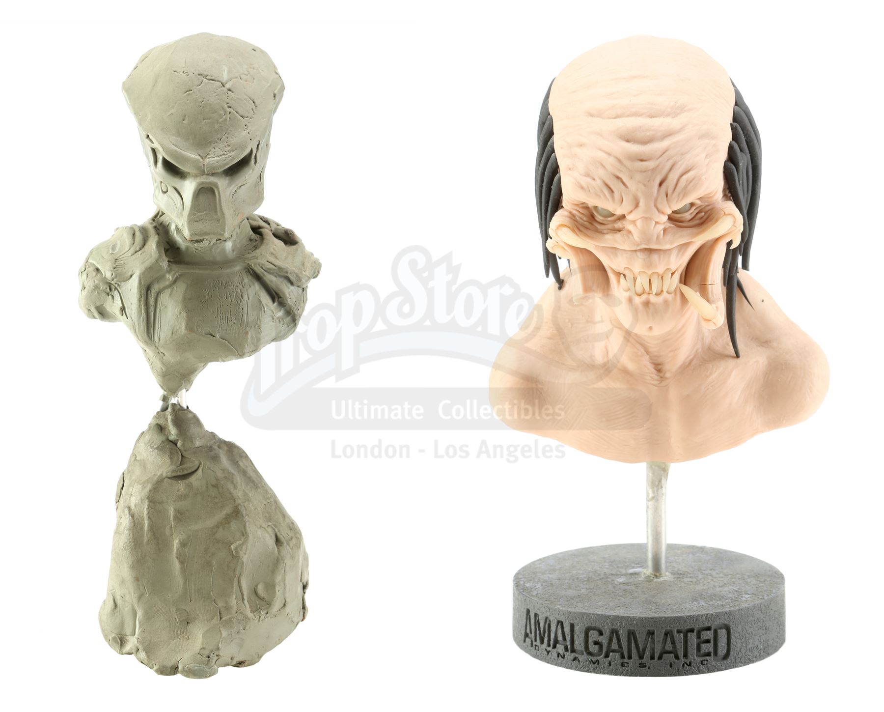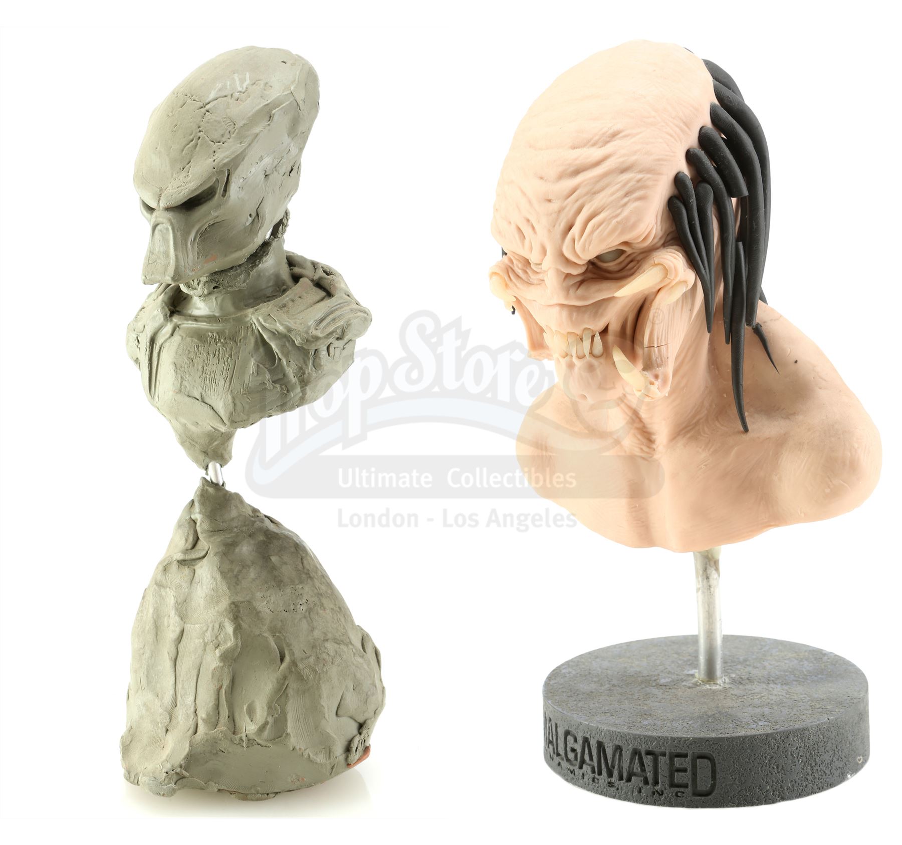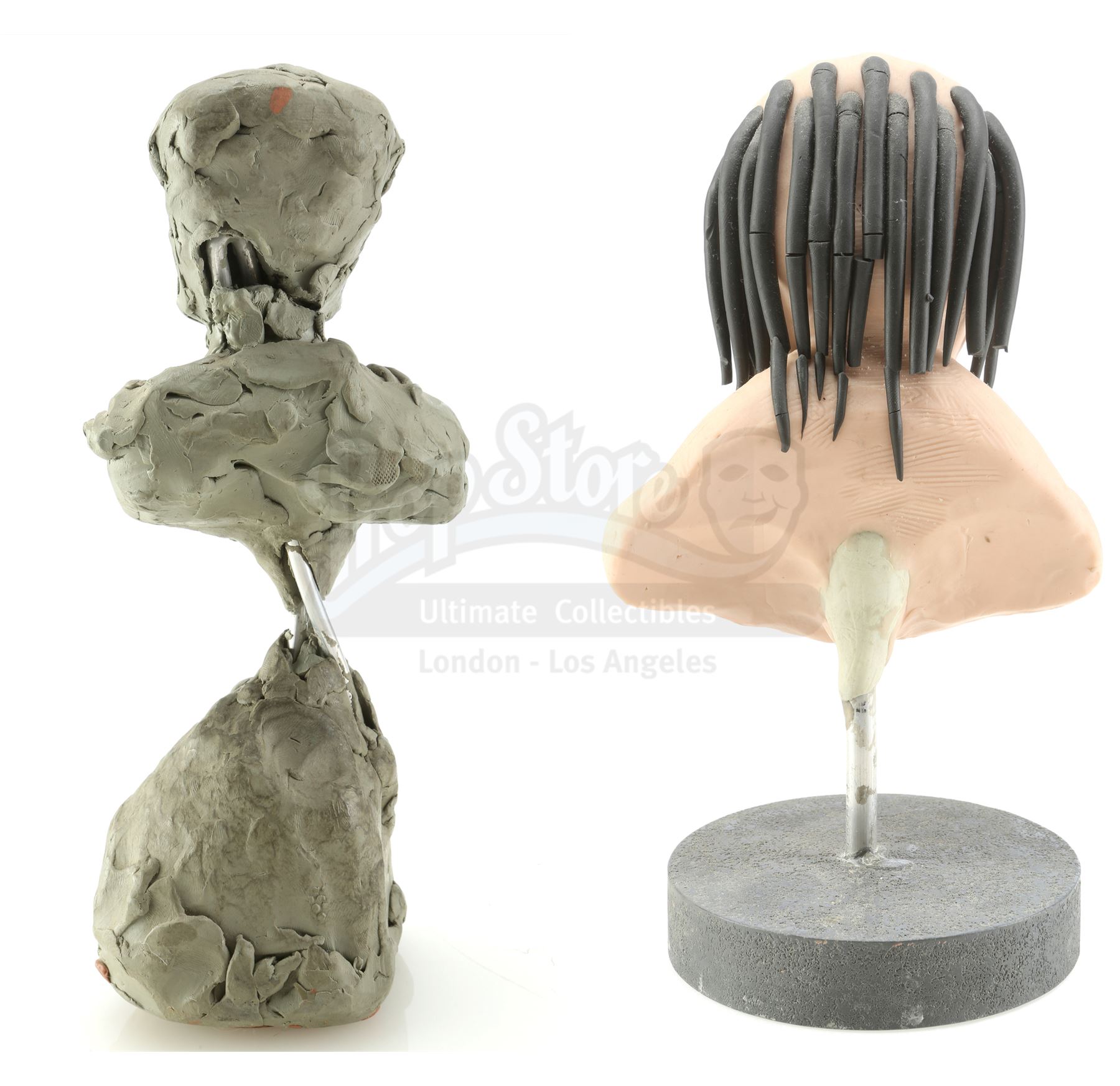 These hand-sculpted reference maquettes, made of sculpting compound over an armature, were designed and fabricated by Academy Award-winning special effects group Amalgamated Dynamics, Inc. (ADI). The pair is in fair but fragile overall condition with some missing elements and the clay head loose from its base.