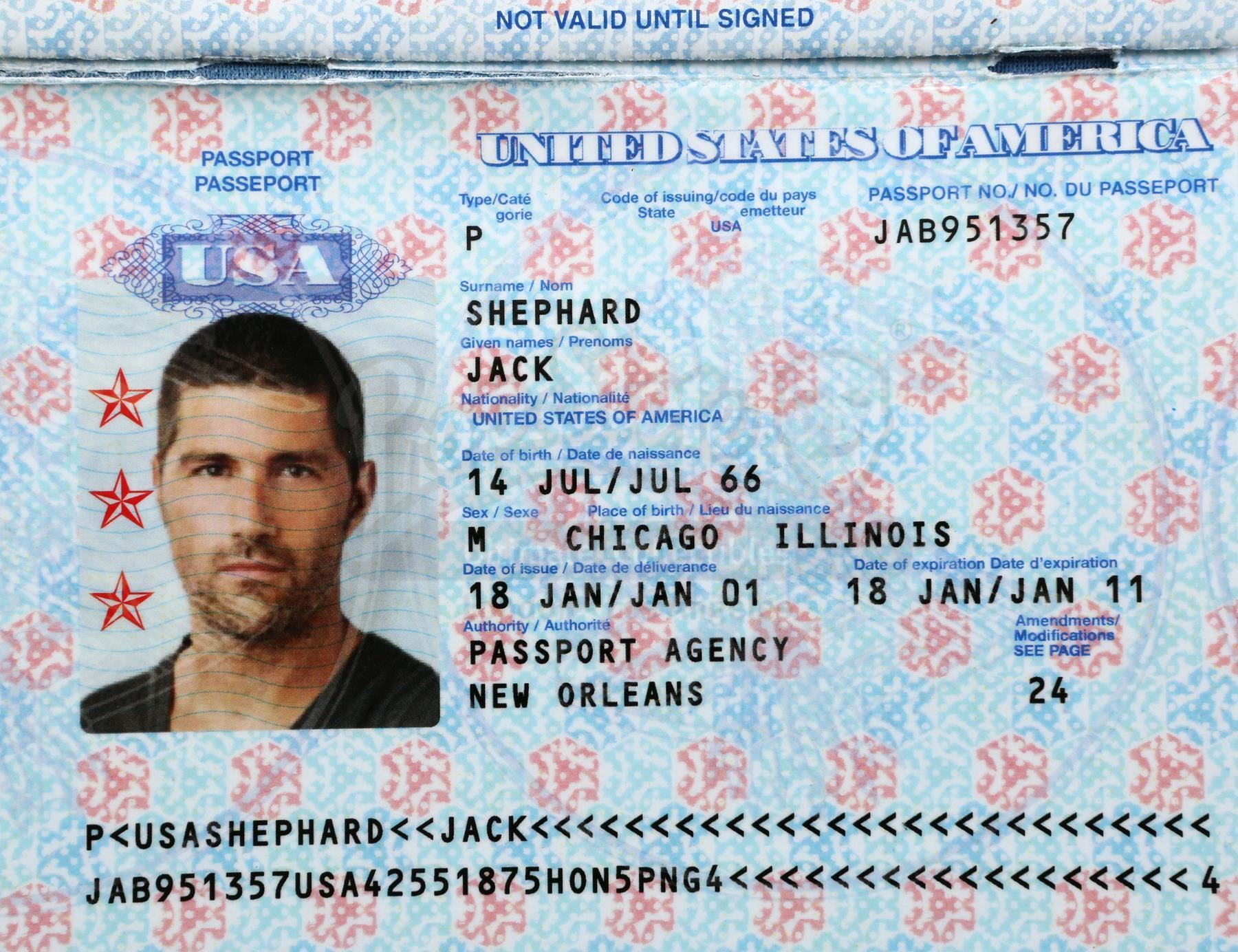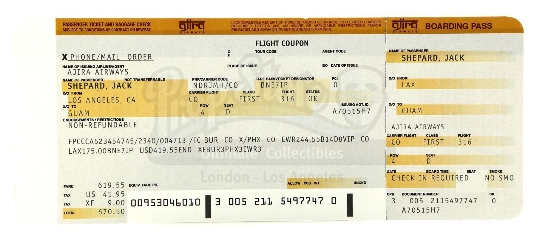 This lot includes Shephard's paper boarding pass with flight details for Flight 316 from LAX to GUAM marked in typeface, an Ajira Airways ticket booklet printed on glossy paper, and a blue paper United States passport issued in New Orleans on January 18, 2001 to Jack P. Shephard. It remains in excellent overall conditionDimensions (ticket): 4" x 8 1/2" (10.25 cm x 21.75 cm);