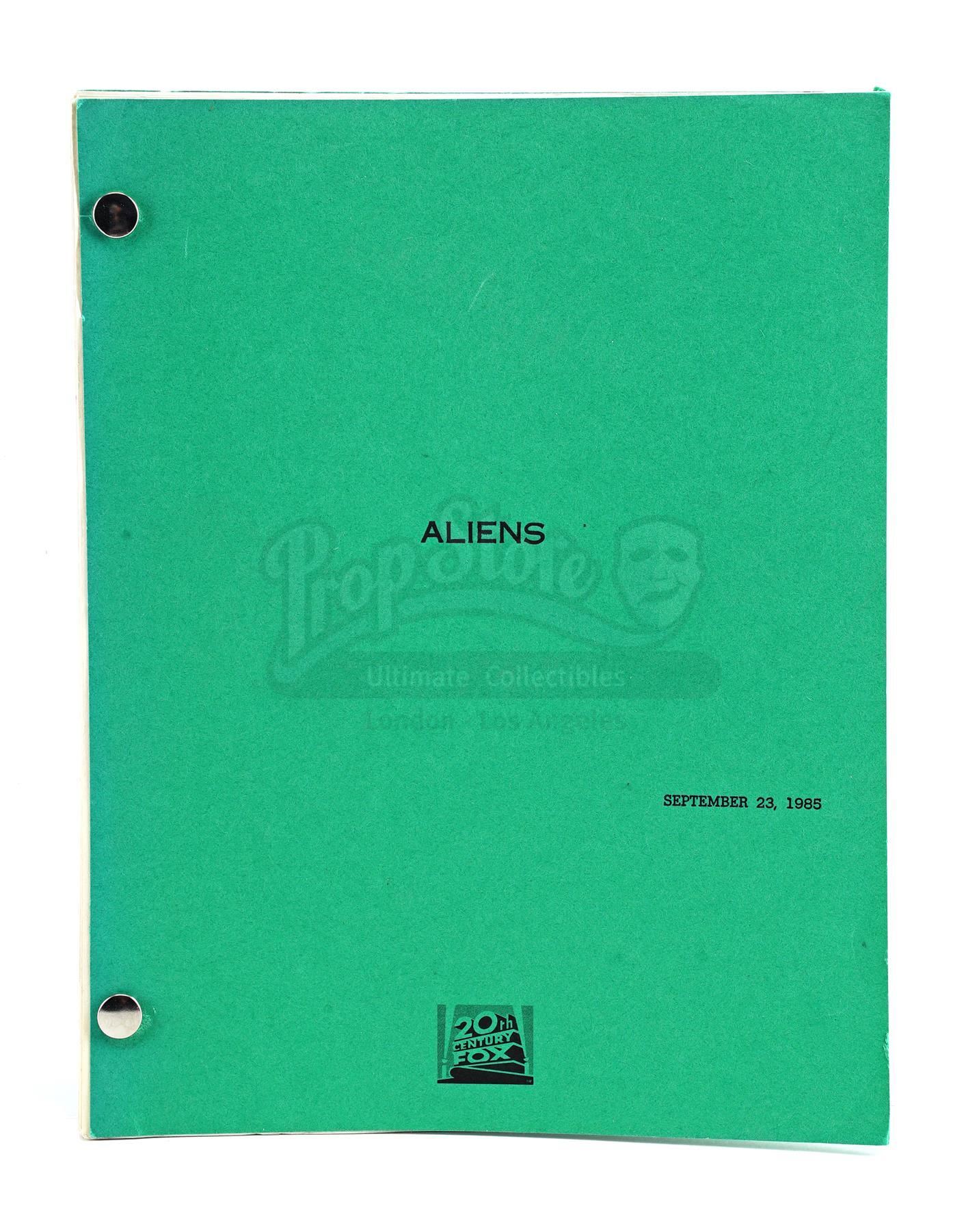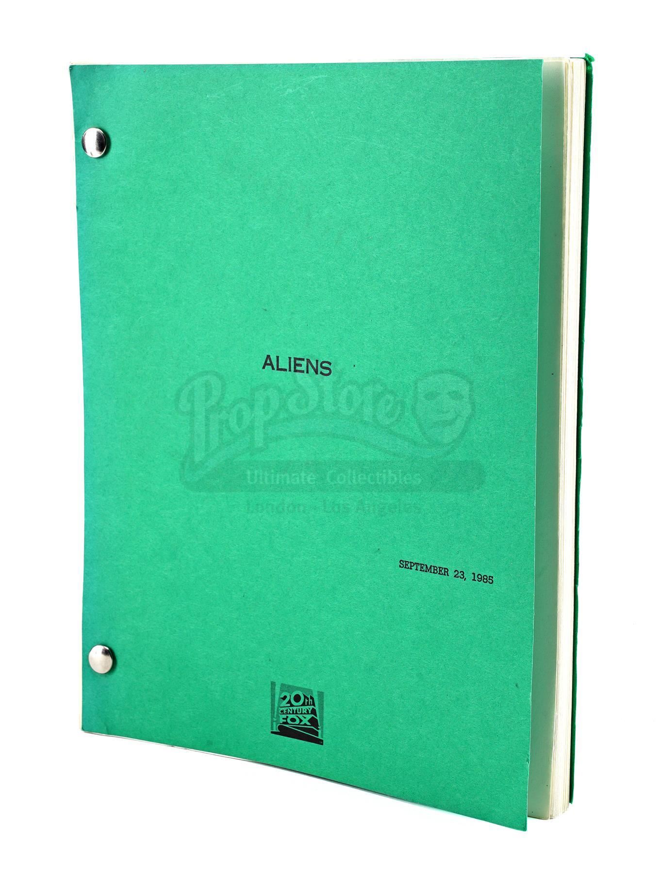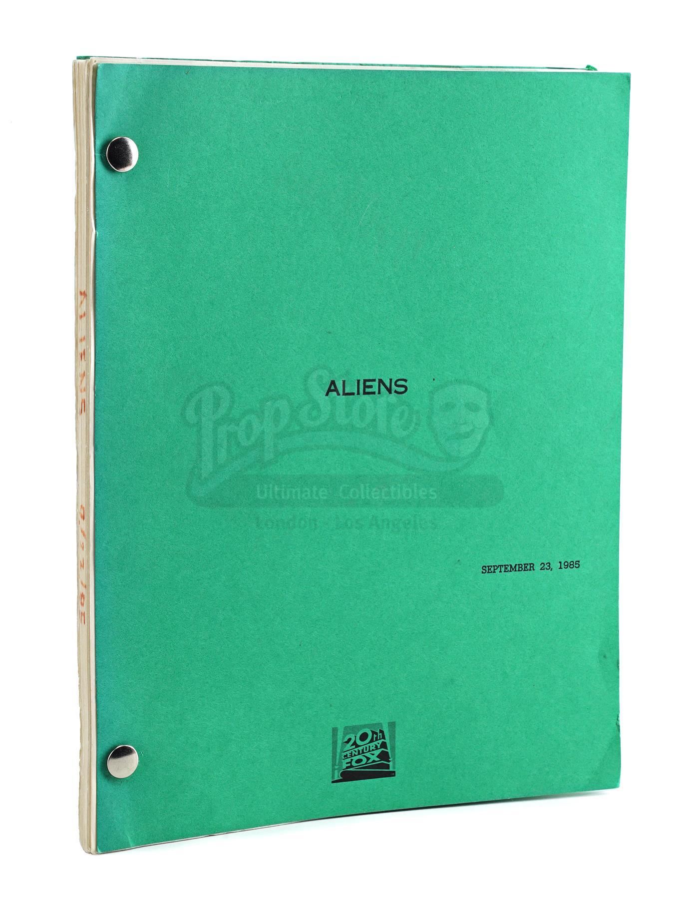 This lot will be auctioned on Wednesday, June 30th. The auction will begin at 9:00am PDT and lots are sold sequentially via live auctioneer; tune in to the live streaming broadcast on auction day to follow the pace. Note other lots in the auction may close on June 29th or July 1st. A bound final shooting script from the production of James Cameron's sci-fi horror sequel Aliens. Cameron also wrote the screenplay and co-wrote the story with David Giler and Walter Hill based on characters created by Dan O'Bannon and Ronald Shusett. This 20th Century Fox script, the final shooting draft dated "September 23, 1985," is bound with brass brads and features a green paper cover with "Aliens 9/23/85" written on the side. It is in good overall condition with some edge wear visible throughout. Dimensions: 11" x 8.5" x 1" (28 cm x 21.75 cm x 2.5 cm) Estimate: $600 - 800