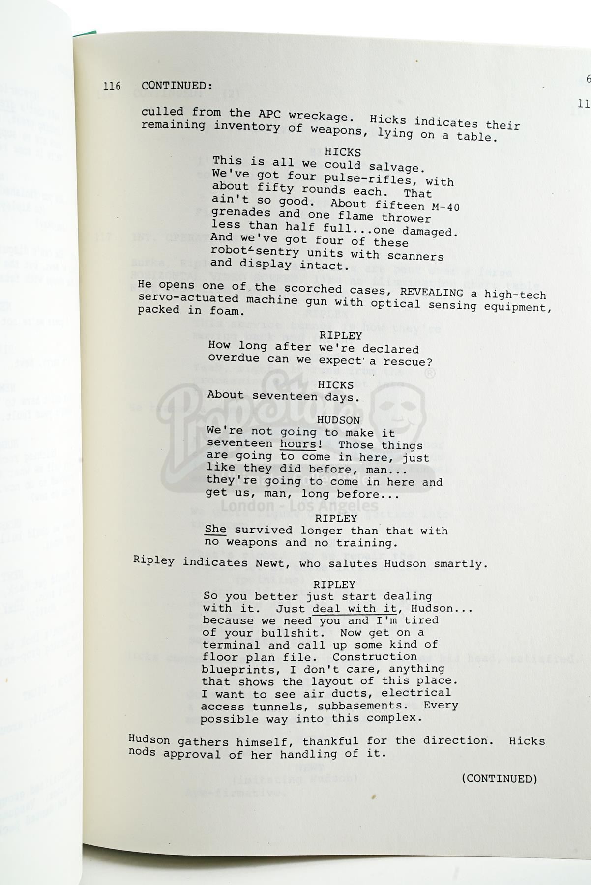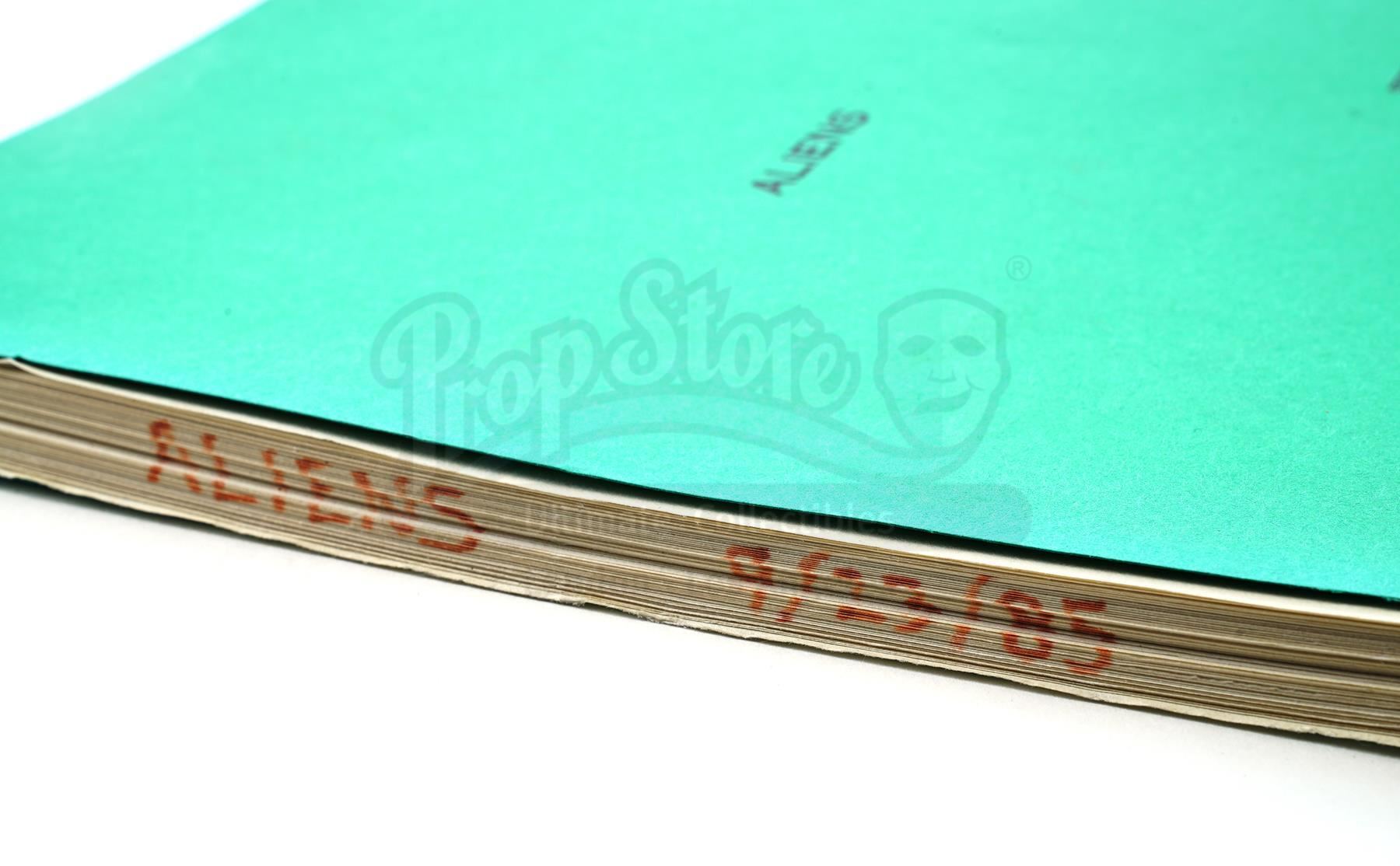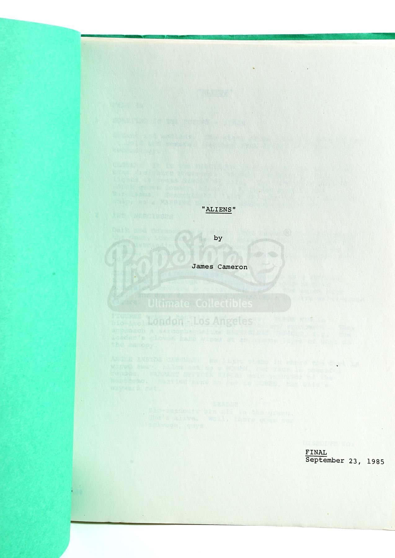 This lot will be auctioned on Wednesday, June 30th. The auction will begin at 9:00am PDT and lots are sold sequentially via live auctioneer; tune in to the live streaming broadcast on auction day to follow the pace. Note other lots in the auction may close on June 29th or July 1st. A bound final shooting script from the production of James Cameron's sci-fi horror sequel Aliens. Cameron also wrote the screenplay and co-wrote the story with David Giler and Walter Hill based on characters created by Dan O'Bannon and Ronald Shusett. This 20th Century Fox script, the final shooting draft dated "September 23, 1985," is bound with brass brads and features a green paper cover with "Aliens 9/23/85" written on the side. It is in good overall condition with some edge wear visible throughout. Dimensions: 11" x 8.5" x 1" (28 cm x 21.75 cm x 2.5 cm) Estimate: $600 - 800