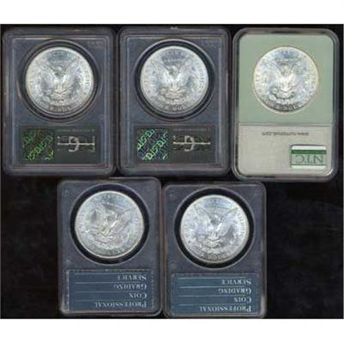Lot of Five 1904-O Morgan Dollars. Includes Numistrust MS66, NGC MS65, and NGC MS63 (3 pieces). (#7292)