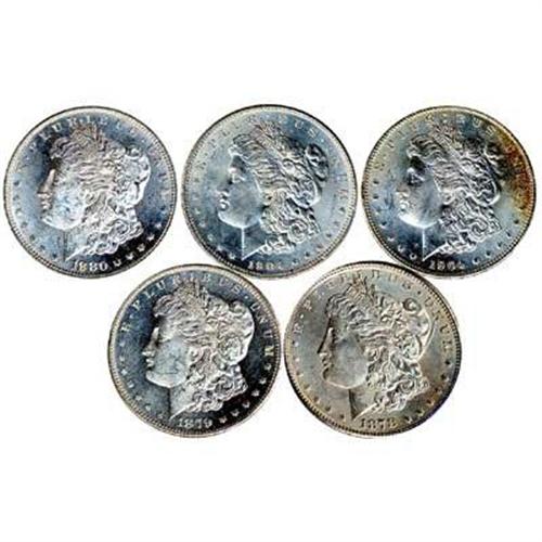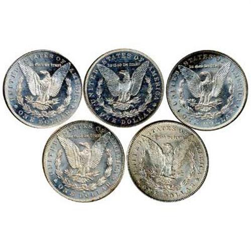 Lot of 5 Morgan Dollars.. 1878-S MS60, 1879-S MS63 PL obverse, 1880-S MS63 PL, 1904-O MS63 1904-O MS64 PL reverse.