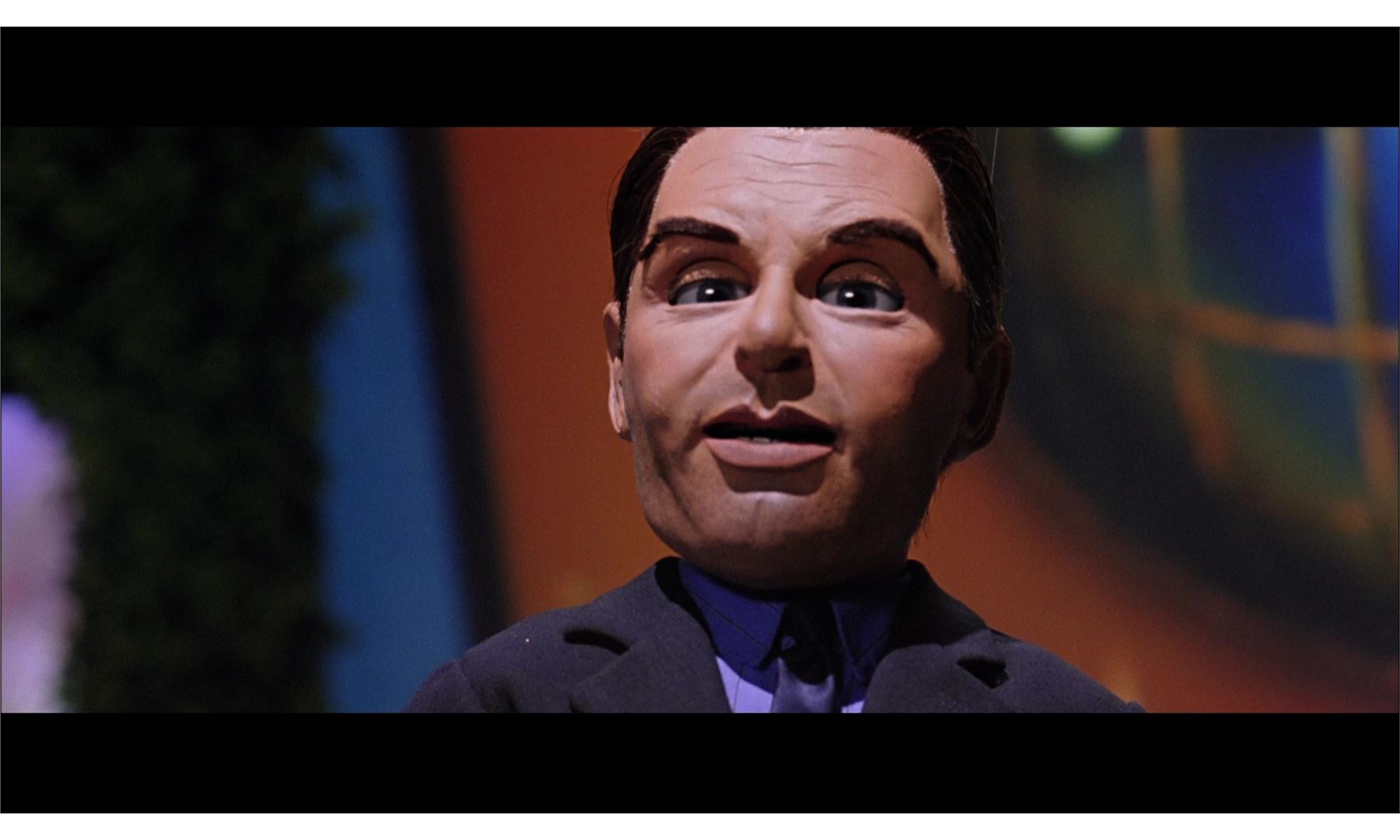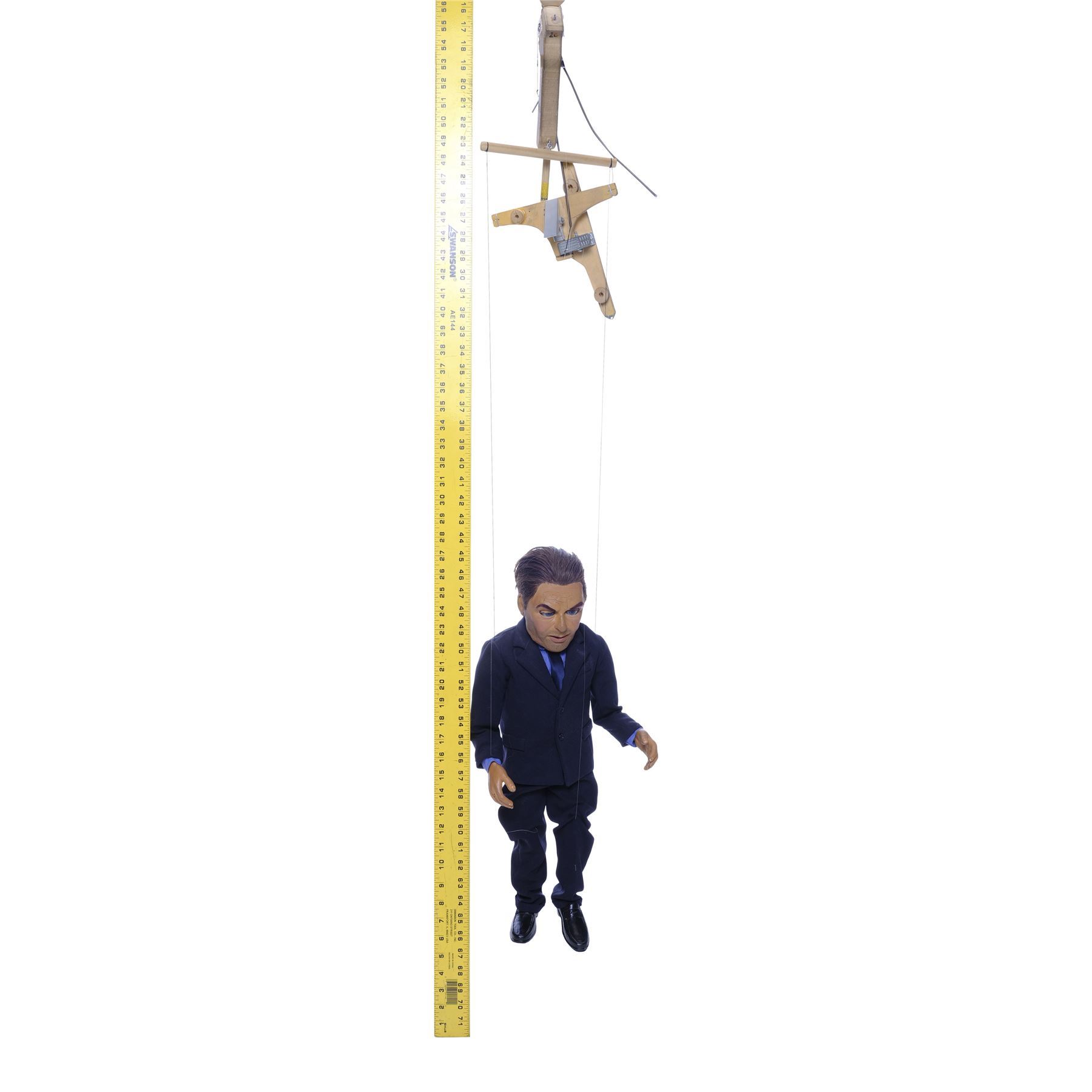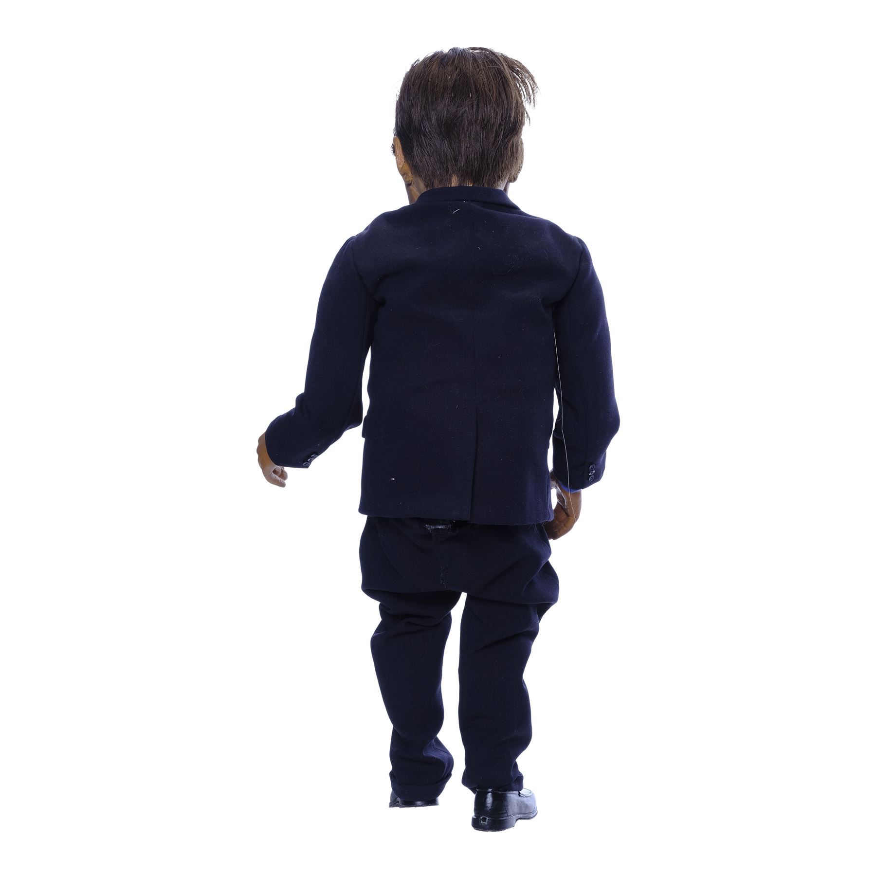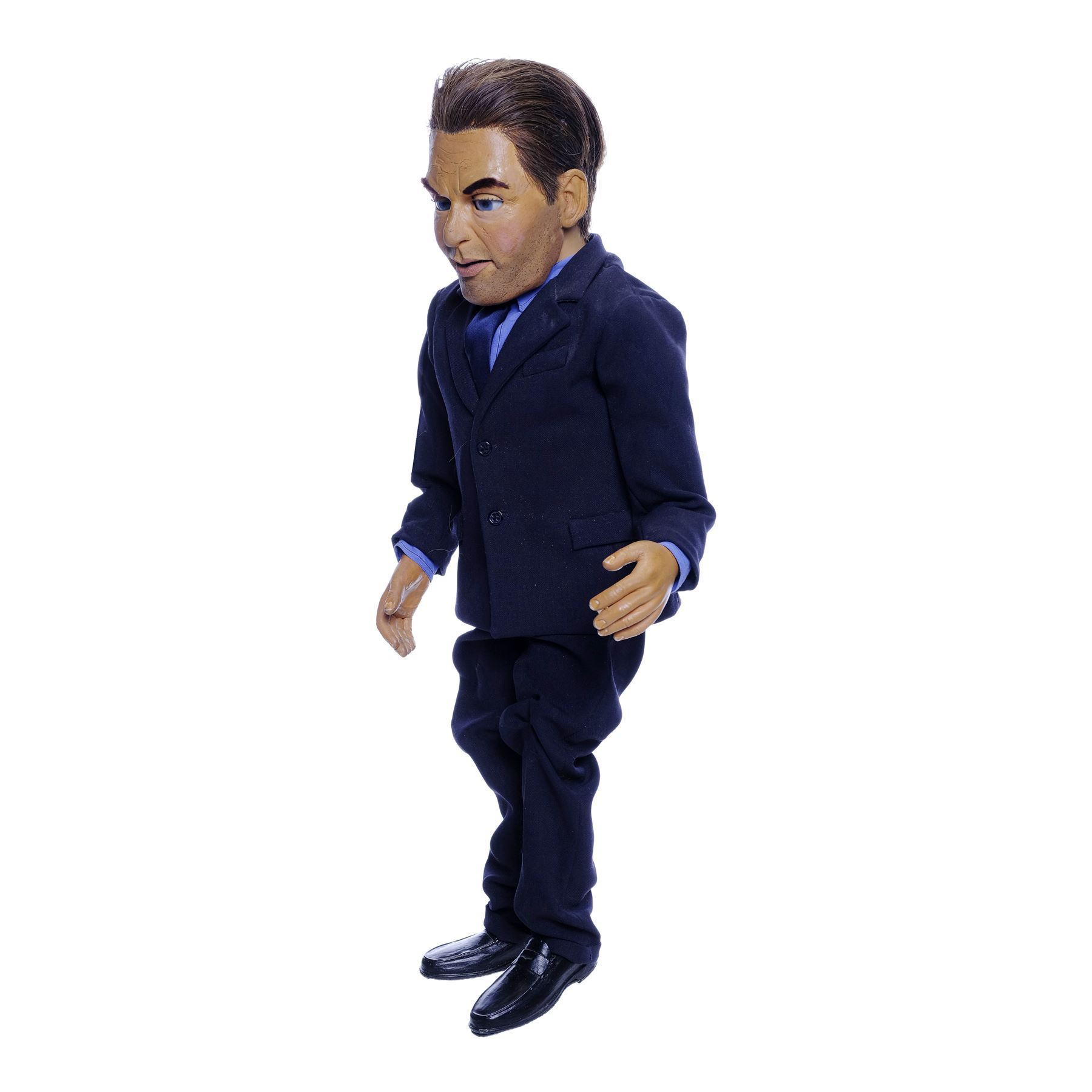Created by the Chiodo Brothers, this ornately hand-painted, cotton-padded fiberglass puppet features a thin foam face and limbs, blue acrylic eyes inset, brown synthetic hair, eyebrows, and eyelashes, dark cloth clothing, and resin shoes painted black. Also included are wires and a control bar created to operate the puppet's facial features. Conservation work was performed on the face by Tom Spina Designs, though the material remains extremely fragile. The boots also exhibit chipped paint. Dimensions: 24" x 9" x 5" (61 cm x 23 cm x 12.75 cm)