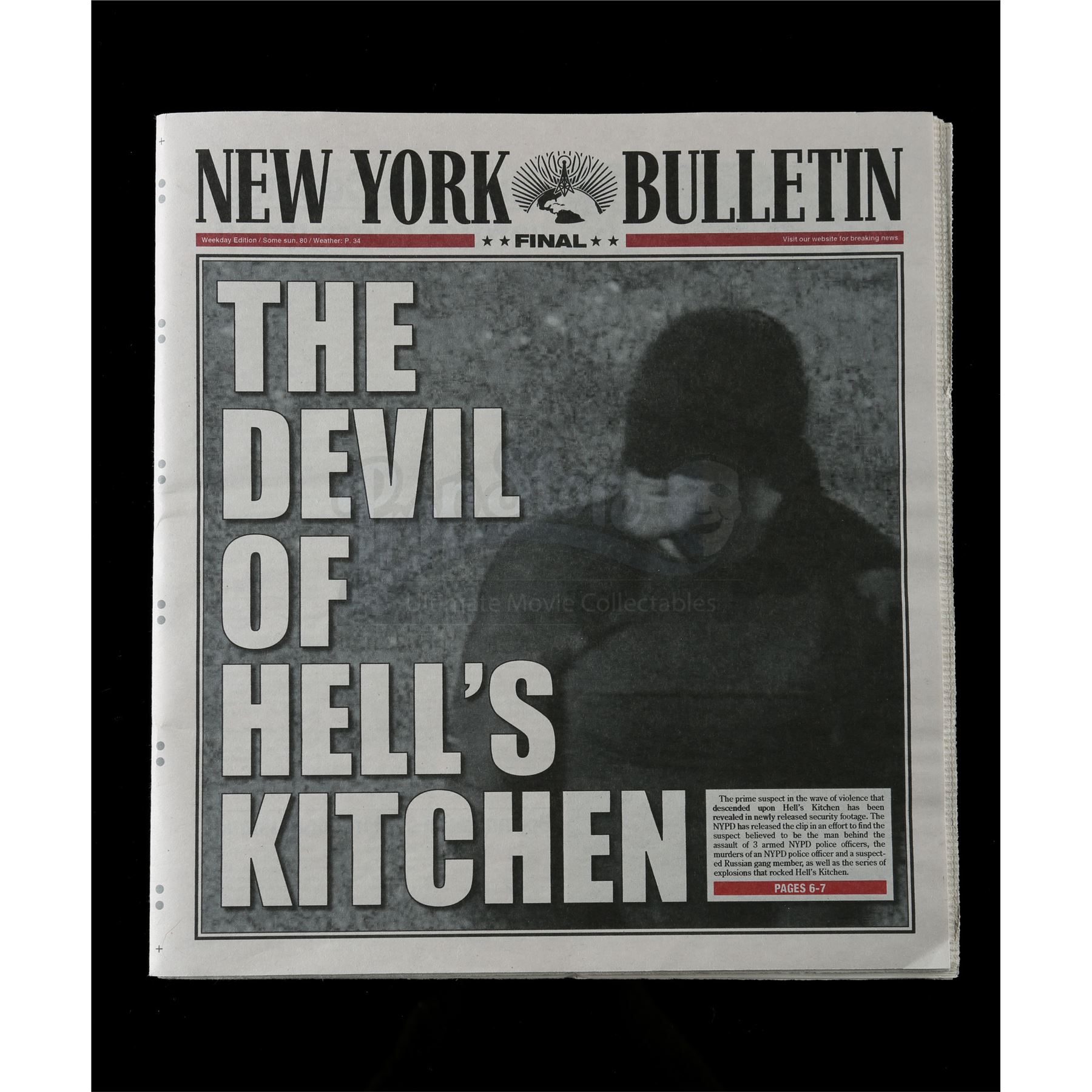 ‘The Devil of Hell’s Kitchen’ New York Bulletin newspaper from the episode ‘Stick’ (107) of Marvel's Daredevil. In the episode, Franklin ‘Foggy’ Nelson holds the paper while ranting to Karen Page and Matt Murdock about Daredevil’s vigilantism. This lot consists of a ‘The Devil of Hell’s Kitchen’ paper cover applied over a copy of a separate newspaper. It is in excellent overall condition.