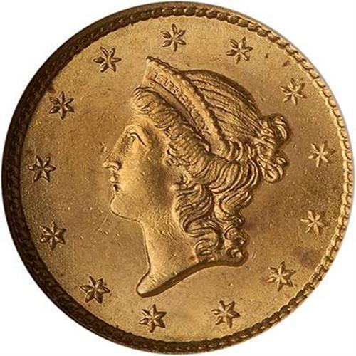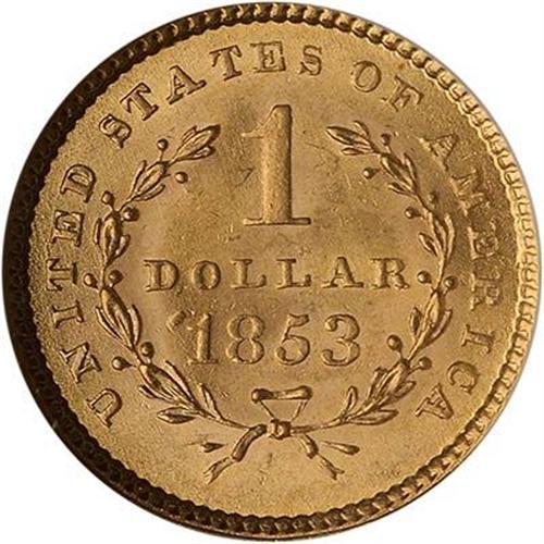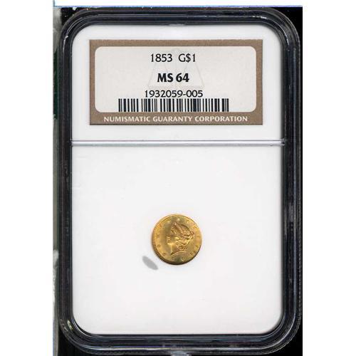 1853 $1 Gold Liberty. Well struck with smooth, velvety luster and rich brilliant-gold shades. Sheer boldness of strike throughout is consistent with 1853's tradition, and was obviously a considered part of the grading service's assignment of the '64 grade. (#7521)