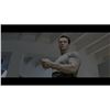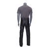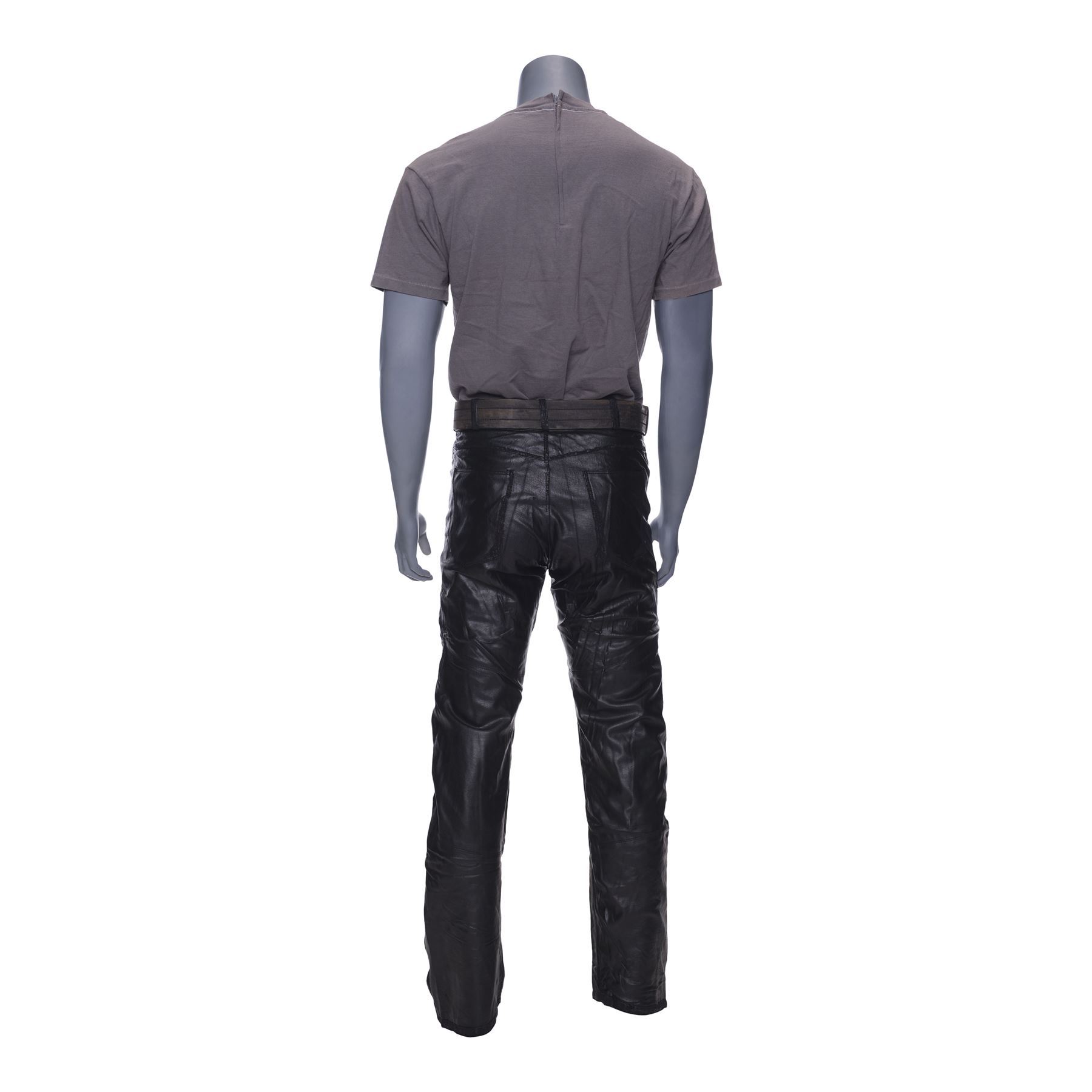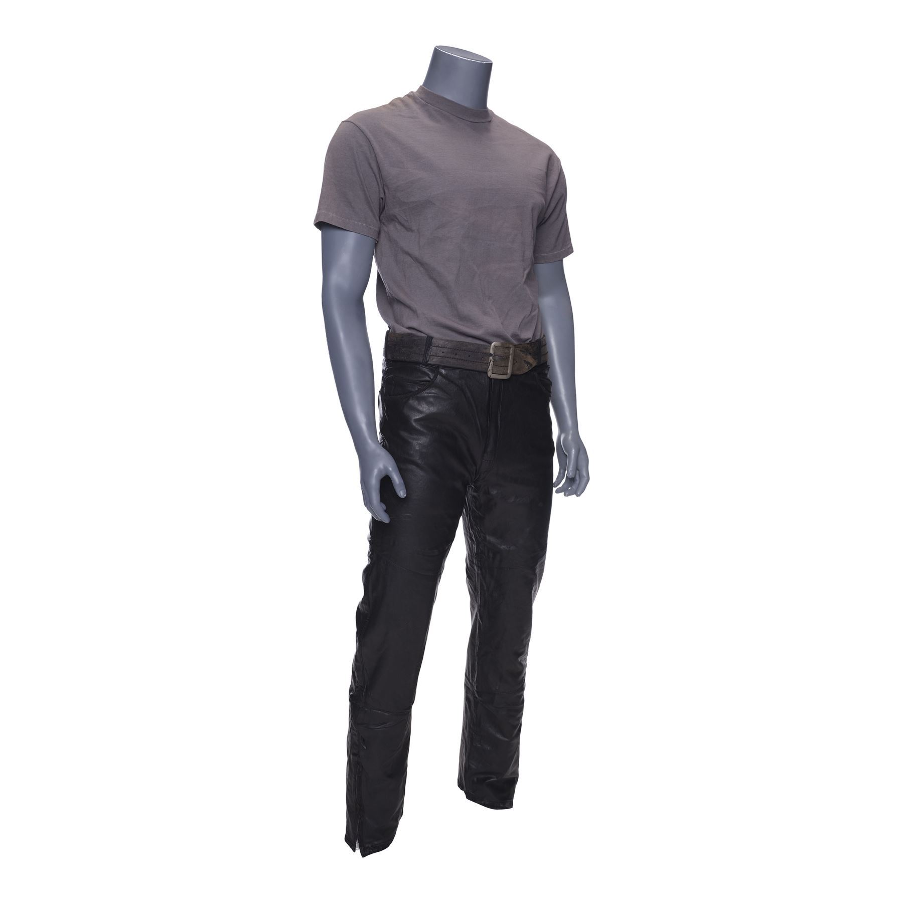 This costume is composed of a gray T-shirt accompanied by a brown leather belt and black faux leather trousers. The shirt features a zipper at the nape of the neck, and the trousers feature zippers at the ankles. Production intentionally distressed the belt. This costume exhibits cracking, peeling, and flaking pleather from the trousers.